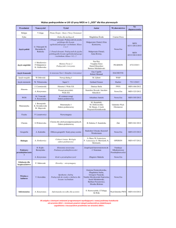 Wykaz podręczników w LXI LO przy MOS nr 1 „SOS” dla klas pierwszych Przedmiot Nauczyciel Tytuł Religia V.Zając Pismo Święte - Stary i Nowy Testament Eyka Język polski Język angielski G. Pokropek M. Mariańska K. Radecka J. Mackiewicz P.Strippentow K. Grabowska Język francuski Autor Wydawnictwo Etyka dla myślących Magdalena Środa Czarna Owca 1.Ponad słowami. Podręcznik do jeżyka polskiego dla liceum ogólnokształcącego i technikum. Klasa 1 cz.1 Małgorzata Chmiel, Eliza Kostrzewa, Nr dopuszczenia MEN 425/1/2012/2015 Nowa Era 2. Ponad słowami. Podręcznik do języka polskiegodla liceum ogólnokształcącego i technikum. Klasa 1 Cz. 2 Małgorzata Chmiel, Anna Równy, MEN 425/2/2012/2015 Matura Focus 2 Podręcznik i ćwiczenia Sue Kay Vaughan Jones Daniel Brayshaw Bartosz Michałowski PEARSON le nouveau Taxi 1 (książka i ćwiczenia) Guy Capelle Robert Menand HACHETTE 672/2/2013 Język rosyjski W.Orłowski Nowyj dialog 1 M. Zybert WSiP Język niemiecki W. Wiśniewska Super! 1 Gerhard Neuner Hueber 751/1/2015 J. Czerniawski Historia I. Wiek XX Dariusz Stola PWN MEN 486/2012 A. Krzywonos Poznać przeszłość. Wiek XX Stanisław Roszak, Jarosław Kłaczkow Nowa Era MEN 525/2012 WOS M. Tomczak A. Krzywonos W centrum uwagi Zakres podstawowy Arkadiusz Janicki Nowa Era MEN 505/2012 Matematyka J. Boratyński K. Kwiatkowski M. Majewski Matematyka 1 Zakres podstawowy M. Karpiński, M. Dobrowolska M. Braun, J. Lech Wojciech Kwiatkowski Gdańskie Wyd. Oświatowe Fizyka P. Lenartowicz Niewymagany Chemia E.Wiśniewska Chemia dla szkół ponadgimnazjalnych. Zakres podstawowy B. Kałuża, F. Kamińska Żak MEN 461/2012 Geografia A. Kalemba Oblicza geografii+ Karty pracy ucznia Radosław Uliszak, Krzystof Wiedermann Nowa Era MEN 433/2012 Biologia A. Siwkiewicz Ciekawi świata. Biologia zakres podstawowy A. Baca, M. Łaszczyca, P. Łaszczyca, G. Skirmuntt, K. Skirmuntt, OPERON MEN 457/2012 B. KojłoBoratyńska Ekonomia stosowana Podstawy przedsiębiorczości Zespół pod kierownictwem dr. J. Neneman Fundacja Młodzieżowej Przedsiębiorczości A. Krzywonos Krok w przedsiębiorczość Zbigniew Makieła Nowa Era P. Sidorczuk Dowolny – niewymagany Nowa Era Wyd.Szkolne PWN Historia Podstawy przedsiębiorczośc i Edukacja dla bezpieczeństwa Wiedza o kulturze T. Kowalska Spotkanie z kultrą Podręcznik do wiedzy o kulturze dla liceum i technikum Grażyna Świętochowska, Magdalena Sacha, Grzegorz Nazaruk, Natalia Mrozkowiak-Nastrożna, Jacek Michałowski, Barbara Forysiewicz, Monika Bokinie Informatyka A. Krzywonos Informatyka nie tylko dla uczniów E. Krawczyński, Z.Talaga, M.Wilk W związku z istotnymi zmianami programowymi wynikającymi z nowej podstawy kształcenia od września 2012 r. Uczniowie powinni zakupić podręczniki po dodatkowym uzgodnieniu z nauczycielem przedmiotu we wrześniu 2016 r. MEN 414/2012