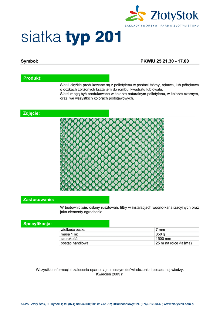 Symbol: PKWiU 25.21.30 - 17.00 Produkt: Siatki ci kie produkowane s z polietylenu w postaci ta my, r kawa, lub pó kawa o oczkach zbli onych kszta tem do rombu, kwadratu lub owalu. Siatki mog by produkowane w kolorze naturalnym polietylenu, w kolorze czarnym, oraz we wszystkich kolorach podstawowych. Zdj cie: Zastosowanie: W budownictwie, os ony rusztowa , filtry w instalacjach wodno-kanalizacyjnych oraz jako elementy ogrodzenia. Specyfikacja: wielko oczka: masa 1 m: szeroko : posta handlowa: 7 mm 850 g 1500 mm 25 m na rolce (ta ma) Wszystkie informacje i zalecenia oparte s na naszym do wiadczeniu i posiadanej wiedzy. Kwiecie 2005 r.
