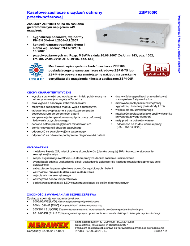 ZSP100R Zasilacze ZSP100R służą do zasilania gwarantowanym napięciem 24V urządzeń: sygnalizacji pożarowej wg normy PN-EN 54-4+A1:2004+A2:2007 kontroli rozprzestrzeniania dymu i ciepła wg normy PN-EN 1210110:2007 przeciwpożarowych wg Rozp. MSWiA z dnia 20.06.2007 (Dz.U. nr 143, poz. 1002, zm. dn. 27.04.2010 Dz. U. nr 85, poz. 553) Możliwość wykorzystania badań zasilacza ZSP100, posiadającego te same zasilacze składowe ZSPM-75 lub ZSPM-150 pozwala na zmniejszenie nakładu na uzyskanie certyfikatu dla urządzenia klienta z zasilaczem ZSP100R CECHY CHARAKTERYSTYCZNE wysoka sprawność pod obciążeniem i niski pobór mocy na potrzeby własne (szczegóły w Tabeli 1) dwa wyjścia z osobnymi zabezpieczeniami możliwość podłączenia modułu wyjść dodatkowych ładowanie przyspieszone z ograniczeniem prądu dostosowanym do pojemności baterii kompensacja temperaturowa napięcia pracy buforowej i ładowania przyspieszonego ochrona baterii przed głębokim rozładowaniem pomiar rezystancji obwodu bateryjnego odporność na zwarcie wejścia bateryjnego odporność na odwrotne podłączenie biegunowości baterii dwa wyjścia sygnalizacji przekaźnikowej z kompletem 3 styków każde możliwość podłączenia zewnętrznej sygnalizacji świetlnej (dwie diody LED) wejście alarmu zewnętrznego możliwość podłączenia jako opcji wyłącznika antysabotażowego (tamper) mały prąd na potrzeby własne odporność na trudne warunki pracy (-25…+55°C, IP20) WYPOSAŻENIE metalowa kaseta 2U, mieści baterię akumulatorów (dla aku powyżej 20Ah konieczne stosowanie zewnętrznej kasety) zespół sygnalizacji świetlnej LED stanu pracy zasilacza: zasilanie i uszkodzenie sygnalizacja zdalna: uszkodzenie sieci i uszkodzenie zbiorcze (dla każdego rodzaju dostępne trzy styki przekaźnika) zabezpieczenia przeciążeniowe obwodów wyjściowych i baterii wewnętrzny rozłącznik głębokiego rozładowania wejście alarmu zewnętrznego wewnętrzna sonda temperaturowa dodatkowa sygnalizacja LED wewnątrz zasilacza do celów diagnostycznych ZGODNOŚĆ Z WYMAGANIAMI BEZPIECZEŃSTWA Zasilacze spełniają wymagania dyrektyw: 2006/95/WE [LVD] Niskonapięciowe wyroby elektryczne. 2004/108/WE [EMC] Kompatybilność elektromagnetyczna, 305/2011 EU [CPR] Zharmonizowane warunki wprowadzania do obrotu wyrobów budowlanych. 2011/65/EU [RoHS 2] Wymagania dotyczące ograniczenia stosowania niektórych niebezpiecznych substancji. Karta katalogowa: K143_ZSP100R_31.03.2016.doc Data ostatniej aktualizacji: 31 marzec 2016 r. Producent zastrzega sobie prawo do wprowadzania zmian bez powiadomienia Certyfikaty ISO 9001 i 14001 Nr dok 0700.93.01-01.0 Strona 1/2 Zasilacze urządzeń ochrony przeciwpożarowej Kasetowe zasilacze urządzeń ochrony przeciwpożarowej Zasilacze urządzeń ochrony przeciwpożarowej Kasetowe zasilacze urządzeń ochrony przeciwpożarowej ZSP100R PODSTAWOWE PARAMETRY ZASILACZY Tabela 1 Parametry wspólne Znamionowe napięcie zasilania Znamionowe napięcie wyjściowe (w temperaturze 25°C) Zakres zmian napięcia wyjściowego *) Pobór prądu z akumulatora na potrzeby własne zasilacza Pobór mocy z sieci przy naładowanej baterii akumulatorów w stanie nieobciążonym Sprawność przy nominalnym obciążeniu, przy naładowanej baterii akumulatorów Maksymalna rezystancja obwodu akumulatora Liczba współpracujących akumulatorów Liczba wyjść zabezpieczonych osobnymi bezpiecznikami Temperatura pracy Stopień ochrony PN-EN 60529 Klasa funkcjonalna PN-EN 12101-10 Klasa środowiskowa PN-EN 12101-10 Klasa ochronności PN-EN 60950-1 230V +10% -15% 27,1V 21.0…28,8V max 17mA ~ 1.7W 89% 250mΩ 2 2 -25…+55°C IP 20 A 1 I *) Podany zakres obejmuje napięcia pomiędzy napięciem rozładowanej baterii akumulatorów (pod koniec cyklu pracy bateryjnej) do napięcia ładowania przyspieszonego. Tabela 2 Parametry indywidualne Indeks Maksymalny prąd wyjściowy Imax b Nominalny prąd wyjściowy Imax a Pojemność baterii akumulatorów Wymiary (2U 19”) 2.5A 2.5A 5.5A 5.5A 5.5A 2.1A 1.7A 5.1A 4.7A 3.8A 2 x 9Ah 2 x 18Ah 2 x 9Ah 2 x 18Ah 2 x 17…45Ah 482,6x88x300 482,6x88x368,5 482,6x88x300 482,6x88x368,5 482,6x88x144 ZSP100R-2.5A-09 ZSP100R-2.5A-18 ZSP100R-5.5A-09 ZSP100R-5.5A-18 ZSP100R-5.5A-00 SxWxG [mm] Zasilacze ZSP100R wymagają oddzielnego zamówienia akumulatorów. PROPONOWANE WYPOSAŻENIE DODATKOWE Moduł wyjść dodatkowych typu ZSP100-OUT6, zawierający 6 wyjść zabezpieczonych bezpiecznikami topikowymi, wyposażony w sygnalizacją LED uszkodzenia każdego z nich.. Moduł ten pozwala na przekazanie informacji o uszkodzeniu do zasilacza głównego. Wykorzystanie 1 modułu daje 7 osobnych wyjść zasilacza, a dwóch 12. Przykład zamówienia Zasilacz sygnalizacji i automatyki pożarowej ZSP100R-2.5A-18 Akumulator 12V/18Ah 4 szt. Moduł ZSP100-OUT6 2szt PRODUCENT 2szt. UWAGI MERAWEX Sp. z o.o. Toruńska 8, 44-122 Gliwice NIP 631-000-04-40 www.merawex.com.pl [email protected] tel. 32 23 99 400 fax 32 23 99 409 Karta katalogowa: K143_ZSP100R_31.03.2016.doc Data ostatniej aktualizacji: 31 marzec 2016 r. Producent zastrzega sobie prawo do wprowadzania zmian bez powiadomienia Certyfikaty ISO 9001 i 14001 Nr dok 0700.93.01-01.0 Strona 2/2