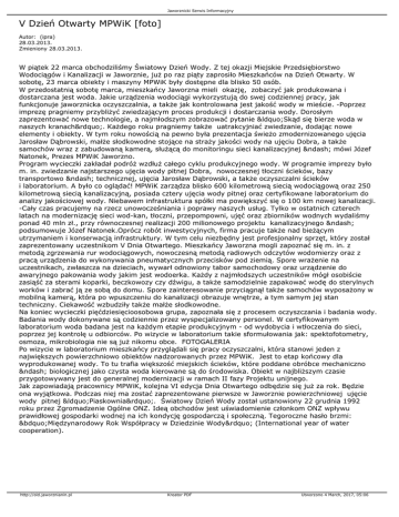 Jaworznicki Serwis Informacyjny V Dzień Otwarty MPWiK [foto] Autor: (ipra) 28.03.2013. Zmieniony 28.03.2013. W piątek 22 marca obchodziliśmy Światowy Dzień Wody. Z tej okazji Miejskie Przedsiębiorstwo Wodociągów i Kanalizacji w Jaworznie, już po raz piąty zaprosiło Mieszkańców na Dzień Otwarty. W sobotę, 23 marca obiekty i maszyny MPWiK były dostępne dla blisko 50 osób. W przedostatnią sobotę marca, mieszkańcy Jaworzna mieli okazję, zobaczyć jak produkowana i dostarczana jest woda. Jakie urządzenia wodociągi wykorzystują do swej codziennej pracy, jak funkcjonuje jaworznicka oczyszczalnia, a także jak kontrolowana jest jakość wody w mieście. -Poprzez imprezę pragniemy przybliżyć zwiedzającym proces produkcji i dostarczania wody. Dorosłym zaprezentować nowe technologie, a najmłodszym zobrazować pytanie “Skąd się bierze woda w naszych kranach”. Każdego roku pragniemy także uatrakcyjniać zwiedzanie, dodając nowe elementy i obiekty. W tym roku nowością na pewno była prezentacja świeżo zmodernizowanego ujęcia Jarosław Dąbrowski, małże słodkowodne stojące na straży jakości wody na ujęciu Dobra, a także samochów wraz z zabudowaną kamerą, służącą do monitoringu sieci kanalizacyjnej – mówi Józef Natonek, Prezes MPWiK Jaworzno. Program wycieczki zakładał podróż wzdłuż całego cyklu produkcyjnego wody. W programie imprezy było m. in. zwiedzanie najstarszego ujęcia wody pitnej Dobra, nowoczesnej tłoczni ścieków, bazy transportowo – technicznej, ujęcia Jarosław Dąbrowski, a także oczyszczalni ścieków i laboratorium. A było co oglądać! MPWiK zarządza blisko 600 kilometrową siecią wodociągową oraz 250 kilometrową siecią kanalizacyjną, posiada cztery ujęcia wody pitnej oraz certyfikowane laboratorium do analizy jakościowej wody. Niebawem infrastruktura spółki ma powiększyć się o 100 km nowej kanalizacji. -Cały czas pracujemy na rzecz unowocześniania i poprawy naszych usług. Tylko w ostatnich czterech latach na modernizację sieci wod-kan, tłoczni, przepompowni, ujęć oraz zbiorników wodnych wydaliśmy ponad 40 mln zł., przy równoczesnej realizacji 200 milionowego projektu kanalizacyjnego – podsumowuje Józef Natonek.Oprócz robót inwestycyjnych, firma pracuje także nad bieżącym utrzymaniem i konserwacją infrastruktury. W tym celu niezbędny jest profesjonalny sprzęt, który został zaprezentowany uczestnikom V Dnia Otwartego. Mieszkańcy Jaworzna mogli zapoznać się m. in. z metodą zgrzewania rur wodociągowych, nowoczesną metodą radiowych odczytów wodomierzy oraz z pracą urządzenia do wykonywania pneumatycznych przecisków pod ziemią. Spore wrażenie na uczestnikach, zwłaszcza na dzieciach, wywarł odnowiony tabor samochodowy oraz urządzenie do awaryjnego pakowania wody jakim jest wodoerka. Każdy z najmłodszych uczestników mógł osobiście zasiąść za sterami koparki, beczkowozy czy dźwigu, a także samodzielnie zapakować wodę do sterylnych worków i zabrać ją ze sobą do domu. Spore zainteresowanie przyciągnął także samochów wyposażony w mobilną kamerą, która po wpuszczeniu do kanalizacji obrazuje wnętrze, a tym samym jej stan techniczny. Ciekawość wzbudziły także małże słodkowodne. Na koniec wycieczki pięćdziesięcioosobowa grupa, zapoznała się z procesem oczyszczania i badania wody. Badania wody dokonywane są codziennie przez wyspecjalizowany personel. W certyfikowanym laboratorium woda badana jest na każdym etapie produkcyjnym - od wydobycia i wtłoczenia do sieci, poprzez jej kontrolę u odbiorców. Po wizycie w laboratorium takie sformułowania jak: spektofotometry, osmoza, mikrobiologia nie są już nikomu obce. FOTOGALERIA Po wizycie w laboratorium mieszkańcy przyglądali się pracy oczyszczalni, która stanowi jeden z największych powierzchniowo obiektów nadzorowanych przez MPWiK. Jest to etap końcowy dla wyprodukowanej wody. To tu trafia większość miejskich ścieków, które poddane obróbce mechaniczno – biologicznej jako czysta woda kierowane są do środowiska. Obiekt w najbliższym czasie przygotowywany jest do generalnej modernizacji w ramach II fazy Projektu unijnego. Jak zapowiadają pracownicy MPWiK, kolejna VI edycja Dnia Otwartego odbędzie się już za rok. Będzie ona wyjątkowa. Podczas niej ma zostać zaprezentowane pierwsze w Jaworznie powierzchniowej ujęcie wody pitnej “Piaskownia”. Światowy Dzień Wody został ustanowiony 22 grudnia 1992 roku przez Zgromadzenie Ogólne ONZ. Ideą obchodów jest uświadomienie członkom ONZ wpływu prawidłowej gospodarki wodnej na ich kondycję gospodarczą i społeczną. Tegoroczne hasło brzmi: „Międzynarodowy Rok Współpracy w Dziedzinie Wody” (International year of water cooperation). http://old.jaworznianin.pl Kreator PDF Utworzono 4 March, 2017, 05:06