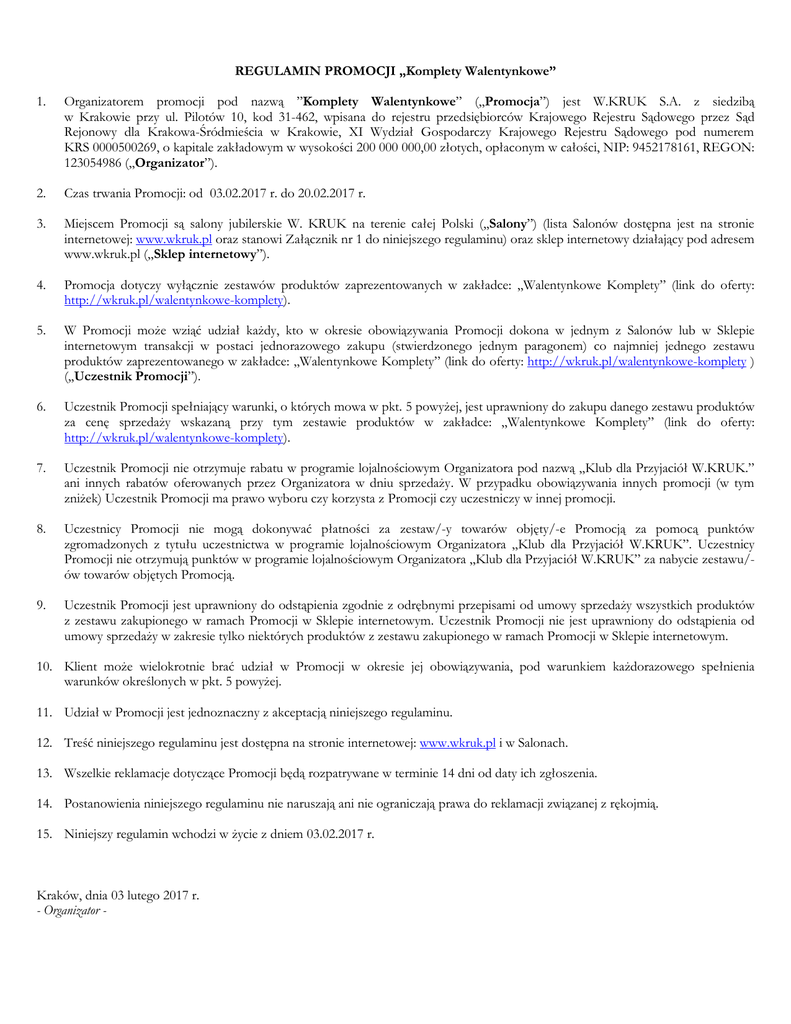 REGULAMIN PROMOCJI „Komplety Walentynkowe” 1. Organizatorem promocji pod nazwą ”Komplety Walentynkowe” („Promocja”) jest W.KRUK S.A. z siedzibą w Krakowie przy ul. Pilotów 10, kod 31-462, wpisana do rejestru przedsiębiorców Krajowego Rejestru Sądowego przez Sąd Rejonowy dla Krakowa-Śródmieścia w Krakowie, XI Wydział Gospodarczy Krajowego Rejestru Sądowego pod numerem KRS 0000500269, o kapitale zakładowym w wysokości 200 000 000,00 złotych, opłaconym w całości, NIP: 9452178161, REGON: 123054986 („Organizator”). 2. Czas trwania Promocji: od 03.02.2017 r. do 20.02.2017 r. 3. Miejscem Promocji są salony jubilerskie W. KRUK na terenie całej Polski (,,Salony”) (lista Salonów dostępna jest na stronie internetowej: www.wkruk.pl oraz stanowi Załącznik nr 1 do niniejszego regulaminu) oraz sklep internetowy działający pod adresem www.wkruk.pl („Sklep internetowy”). 4. Promocja dotyczy wyłącznie zestawów produktów zaprezentowanych w zakładce: „Walentynkowe Komplety” (link do oferty: http://wkruk.pl/walentynkowe-komplety). 5. W Promocji może wziąć udział każdy, kto w okresie obowiązywania Promocji dokona w jednym z Salonów lub w Sklepie internetowym transakcji w postaci jednorazowego zakupu (stwierdzonego jednym paragonem) co najmniej jednego zestawu produktów zaprezentowanego w zakładce: „Walentynkowe Komplety” (link do oferty: http://wkruk.pl/walentynkowe-komplety ) (,,Uczestnik Promocji”). 6. Uczestnik Promocji spełniający warunki, o których mowa w pkt. 5 powyżej, jest uprawniony do zakupu danego zestawu produktów za cenę sprzedaży wskazaną przy tym zestawie produktów w zakładce: „Walentynkowe Komplety” (link do oferty: http://wkruk.pl/walentynkowe-komplety). 7. Uczestnik Promocji nie otrzymuje rabatu w programie lojalnościowym Organizatora pod nazwą „Klub dla Przyjaciół W.KRUK.” ani innych rabatów oferowanych przez Organizatora w dniu sprzedaży. W przypadku obowiązywania innych promocji (w tym zniżek) Uczestnik Promocji ma prawo wyboru czy korzysta z Promocji czy uczestniczy w innej promocji. 8. Uczestnicy Promocji nie mogą dokonywać płatności za zestaw/-y towarów objęty/-e Promocją za pomocą punktów zgromadzonych z tytułu uczestnictwa w programie lojalnościowym Organizatora „Klub dla Przyjaciół W.KRUK”. Uczestnicy Promocji nie otrzymują punktów w programie lojalnościowym Organizatora „Klub dla Przyjaciół W.KRUK” za nabycie zestawu/ów towarów objętych Promocją. 9. Uczestnik Promocji jest uprawniony do odstąpienia zgodnie z odrębnymi przepisami od umowy sprzedaży wszystkich produktów z zestawu zakupionego w ramach Promocji w Sklepie internetowym. Uczestnik Promocji nie jest uprawniony do odstąpienia od umowy sprzedaży w zakresie tylko niektórych produktów z zestawu zakupionego w ramach Promocji w Sklepie internetowym. 10. Klient może wielokrotnie brać udział w Promocji w okresie jej obowiązywania, pod warunkiem każdorazowego spełnienia warunków określonych w pkt. 5 powyżej. 11. Udział w Promocji jest jednoznaczny z akceptacją niniejszego regulaminu. 12. Treść niniejszego regulaminu jest dostępna na stronie internetowej: www.wkruk.pl i w Salonach. 13. Wszelkie reklamacje dotyczące Promocji będą rozpatrywane w terminie 14 dni od daty ich zgłoszenia. 14. Postanowienia niniejszego regulaminu nie naruszają ani nie ograniczają prawa do reklamacji związanej z rękojmią. 15. Niniejszy regulamin wchodzi w życie z dniem 03.02.2017 r. Kraków, dnia 03 lutego 2017 r. - Organizator -