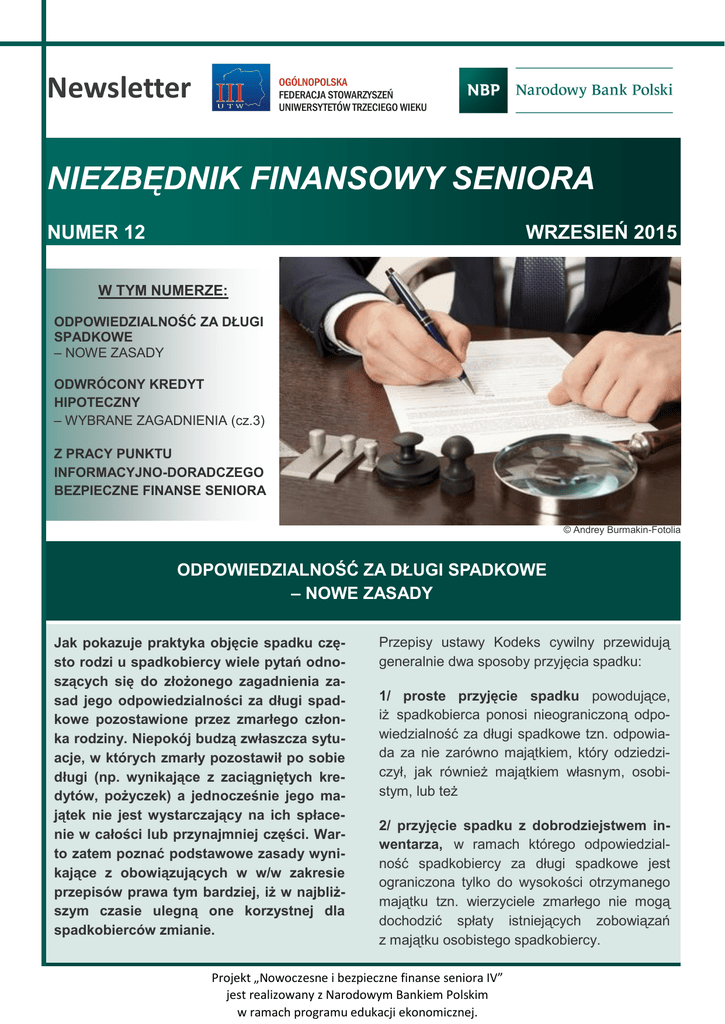 Newsletter NIEZBĘDNIK FINANSOWY SENIORA NUMER 12 WRZESIEŃ 2015 W TYM NUMERZE: ODPOWIEDZIALNOŚĆ ZA DŁUGI SPADKOWE – NOWE ZASADY ODWRÓCONY KREDYT HIPOTECZNY – WYBRANE ZAGADNIENIA (cz.3) Z PRACY PUNKTU INFORMACYJNO-DORADCZEGO BEZPIECZNE FINANSE SENIORA © Andrey Burmakin-Fotolia ODPOWIEDZIALNOŚĆ ZA DŁUGI SPADKOWE – NOWE ZASADY Jak pokazuje praktyka objęcie spadku często rodzi u spadkobiercy wiele pytań odnoszących się do złożonego zagadnienia zasad jego odpowiedzialności za długi spadkowe pozostawione przez zmarłego członka rodziny. Niepokój budzą zwłaszcza sytuacje, w których zmarły pozostawił po sobie długi (np. wynikające z zaciągniętych kredytów, pożyczek) a jednocześnie jego majątek nie jest wystarczający na ich spłacenie w całości lub przynajmniej części. Warto zatem poznać podstawowe zasady wynikające z obowiązujących w w/w zakresie przepisów prawa tym bardziej, iż w najbliższym czasie ulegną one korzystnej dla spadkobierców zmianie. Przepisy ustawy Kodeks cywilny przewidują generalnie dwa sposoby przyjęcia spadku: 1/ proste przyjęcie spadku powodujące, iż spadkobierca ponosi nieograniczoną odpowiedzialność za długi spadkowe tzn. odpowiada za nie zarówno majątkiem, który odziedziczył, jak również majątkiem własnym, osobistym, lub też 2/ przyjęcie spadku z dobrodziejstwem inwentarza, w ramach którego odpowiedzialność spadkobiercy za długi spadkowe jest ograniczona tylko do wysokości otrzymanego majątku tzn. wierzyciele zmarłego nie mogą dochodzić spłaty istniejących zobowiązań z majątku osobistego spadkobiercy. Projekt „Nowoczesne i bezpieczne finanse seniora IV” jest realizowany z Narodowym Bankiem Polskim w ramach programu edukacji ekonomicznej. Niezbędnik finansowy seniora Strona 2 PRZYKŁAD: Wartość aktywów spadku (np. lokaty bankowe, ruchomości) wynosi 75 000 zł. natomiast pozostawione przez zmarłego długi (np. niespłacone zobowiązania pożyczkowe) oszacowano na kwotę 100 000 zł. W przypadku prostego przyjęcia spadku wierzyciele będą mogli żądać od spadkobiercy zapłaty całej kwoty tj. 100 000 zł. Jeżeli natomiast spadkobierca zdecyduje się na przyjęcie spadku z dobrodziejstwem inwentarza maksymalny poziom jego odpowiedzialności będzie ograniczony do kwoty 75 000 zł. Dotychczas obowiązujące przepisy opierały się na zasadzie zgodnie z którą, jeżeli spadkobierca nie złoży wyraźnego oświadczenia o odrzuceniu spadku albo o jego przyjęciu z dobrodziejstwem inwentarza, to domniemywa się, iż przyjął spadek wprost tj. bez ograniczenia odpowiedzialności za długi spadkowe. Na złożenie stosownego oświadczenia w tym zakresie spadkobierca miał czas sześciu miesięcy licząc od dnia, w którym dowiedział się o tytule swego powołania. Nowelizacja przepisów Kodeksu cywilnego, która wejdzie w życie 18 października 2015 r., w sposób zasadniczy zmienia tę zasadę z myślą o ochronie interesów każdego spadkobier- cy. Zgodnie z nową regulacją jeśli spadkobierca w okresie 6 miesięcy od dowiedzenia się o tytule do dziedziczenia nie złoży żadnego oświadczenia w tym zakresie, to odziedziczy spadek z dobrodziejstwem inwentarza czyli z ograniczeniem odpowiedzialności za długi spadkowe do wartości ustalonego w inwentarzu stanu czynnego spadku. Te nowe przepisy będą miały zastosowanie do spadków, które zostały otwarte z datą ich wejścia w życie tzn. 18 października 2015 r. UWAGA: Za datę otwarcia spadku uznaje się datę śmierci spadkodawcy. Warto wspomnieć, iż dziedziczenie według nowych zasad nakłada na spadkobierców dodatkowy obowiązek w postaci sporządzenia spisu majątku spadkodawcy – swoistego zestawienia aktywów i pasywów. Sporządzony przez spadkobiercę wykaz inwentarza składać się będzie do sądu lub do notariusza, gdzie zostanie zaprotokołowany. Sankcją za celowe błędne wykonanie spisu będzie brak możliwości powołania się na ograniczenie odpowiedzialności za długi. Daniel Jachimowicz ODWRÓCONY KREDYT HIPOTECZNY – WYBRANE ZAGADNIENIA (cz.3) jej części bank nie może pobrać żadnej prowiCzy istnieje możliwość wcześniejszej spłazji z tego tytułu. Ponadto bank nie może uzależnić spłaty całkowitej kwoty do zapłaty lub jej ty odwróconego kredytu hipotecznego? części od uprzedniego poinformowania go o tym przez kredytobiorcę. Gdy senior dokona TAK. Kredytobiorca ma prawo w każdym czasie do spłaty tzw. całkowitej kwoty do zapłaty częściowej spłaty kredytu, nie powoduje to lub jej części. Przez całkowitą kwotę do zapławstrzymania wypłaty rat niewykorzystanej ty należy rozumieć otrzymaną z banku kwotę kwoty odwróconego kredytu hipotecznego, środków powiększoną o odsetki i inne należne chyba że strony postanowiły w tym zakresie a niezapłacone koszty kredytu, które kredytoinaczej. W przypadku spłaty całkowitej kwoty biorca zobowiązał się ponieść w związku do zapłaty bank jest zobowiązany do potwierz umową odwróconego kredytu hipotecznego. dzenia rozliczenia umowy odwróconego kredyWarto pamiętać, iż w przypadku spłaty przez tu hipotecznego, w terminie 14 dni od dnia dokredytobiorcę całkowitej kwoty do zapłaty lub konania tej spłaty. Projekt „Nowoczesne i bezpieczne finanse seniora IV” jest realizowany z Narodowym Bankiem Polskim w ramach programu edukacji ekonomicznej. Niezbędnik finansowy seniora Strona 3 Czy w okresie obowiązywania umowy odwróconego kredytu hipotecznego kredytobiorca ma jakieś szczególne obowiązki w stosunku do nieruchomości, która stanowi zabezpieczenie w/w umowy? TAK. W okresie trwania umowy odwróconego kredytu hipotecznego kredytobiorca jest zobowiązany w odniesieniu do nieruchomości (lokalu), która stanowi zabezpieczenie w/w kredytu do: posiadania ubezpieczenia tej nieruchomości (lokalu) od zdarzeń losowych, jeżeli ubezpieczenie to jest wymagane przez bank; utrzymywania tej nieruchomości (lokalu) w 