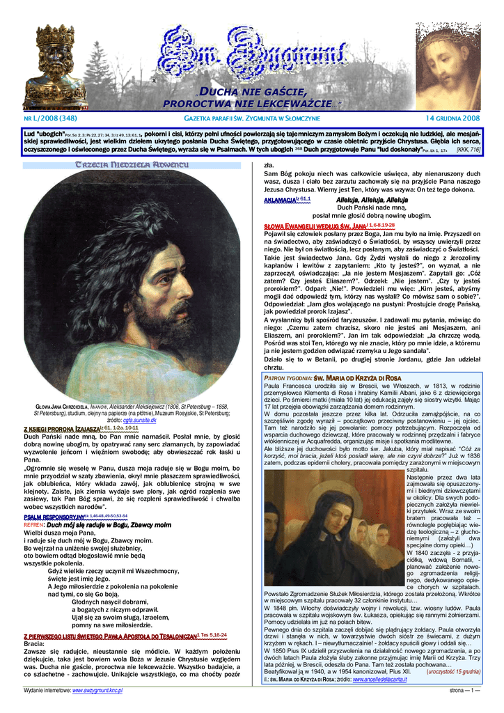 xxx „DUCHA NIE GAŚCIE, PROROCTWA NIE LEKCEWAŻCIE…” NR L/2008 ( 348 348) GAZETKA PARAFII ŚW. ZYGMUNTA W SŁOMCZYNIE 14 GRUDNIA 2008 Lud "ubogich" Por. So 2, 3; Ps 22, 27; 34, 3; Iz 49, 13; 61, 1, pokorni i cisi, którzy pełni ufności powierzają się tajemniczym zamysłom Bożym i oczekują nie ludzkiej, ale mesjańmesjańskiej sprawiedliwości, jest wielkim dziełem ukrytego posłania Ducha Świętego, przygotowującego w czasie obietnic przyjście Chrystusa. Głębia ich serca, oczyszczonego i oświeconego przez Ducha Świętego, wyraża się w Psalmach. W tych ubogich 368 Duch przygotowuje Panu "lud doskonały"Por. Łk 1, 17. [KKK, 716] TR RZ ZECIIA A NIIE ED ZIIE ELA A AD TU U DZ DW ENT zła. Sam Bóg pokoju niech was całkowicie uświęca, aby nienaruszony duch wasz, dusza i ciało bez zarzutu zachowały się na przyjście Pana naszego Jezusa Chrystusa. Wierny jest Ten, który was wzywa: On też tego dokona. AKLAMACJAIz 61,1 Alleluja, Alleluja, Alleluja Duch Pański nade mną, posłał mnie głosić dobrą nowinę ubogim. SŁOWA EWANGELII WEDŁUG ŚW. JANAJ 1,6-8.19-28 Pojawił się człowiek posłany przez Boga, Jan mu było na imię. Przyszedł on na świadectwo, aby zaświadczyć o Światłości, by wszyscy uwierzyli przez niego. Nie był on światłością, lecz posłanym, aby zaświadczyć o Światłości. Takie jest świadectwo Jana. Gdy Żydzi wysłali do niego z Jerozolimy kapłanów i lewitów z zapytaniem: „Kto ty jesteś?”, on wyznał, a nie zaprzeczył, oświadczając: „Ja nie jestem Mesjaszem”. Zapytali go: „Cóż zatem? Czy jesteś Eliaszem?”. Odrzekł: „Nie jestem”. „Czy ty jesteś prorokiem?”. Odparł: „Nie!”. Powiedzieli mu więc: „Kim jesteś, abyśmy mogli dać odpowiedź tym, którzy nas wysłali? Co mówisz sam o sobie?”. Odpowiedział: „Jam głos wołającego na pustyni: Prostujcie drogę Pańską, jak powiedział prorok Izajasz”. A wysłannicy byli spośród faryzeuszów. I zadawali mu pytania, mówiąc do niego: „Czemu zatem chrzcisz, skoro nie jesteś ani Mesjaszem, ani Eliaszem, ani prorokiem?”. Jan im tak odpowiedział: „Ja chrzczę wodą. Pośród was stoi Ten, którego wy nie znacie, który po mnie idzie, a któremu ja nie jestem godzien odwiązać rzemyka u Jego sandała”. Działo się to w Betanii, po drugiej stronie Jordanu, gdzie Jan udzielał chrztu. PATRON TYGODNIA: ŚW. MARIA OD KRZYŻA DI ROSA GŁOWA JANA CHRZCICIELA , IWANOW , Aleksander Aleksiejewicz (1806, St Petersburg – 1858, St Petersburg), studium, olejny na papierze (na płótnie), Muzeum Rosyjskie, St Petersburg; źródło: cgfa.sunsite.dk Z KSIĘGI PROROKA IZAJASZAIz 61, 1-2a. 10-11 Duch Pański nade mną, bo Pan mnie namaścił. Posłał mnie, by głosić dobrą nowinę ubogim, by opatrywać rany serc złamanych, by zapowiadać wyzwolenie jeńcom i więźniom swobodę; aby obwieszczać rok łaski u Pana. „Ogromnie się weselę w Panu, dusza moja raduje się w Bogu moim, bo mnie przyodział w szaty zbawienia, okrył mnie płaszczem sprawiedliwości, jak oblubieńca, który wkłada zawój, jak oblubienicę strojną w swe klejnoty. Zaiste, jak ziemia wydaje swe plony, jak ogród rozplenia swe zasiewy, tak Pan Bóg sprawi, że się rozpleni sprawiedliwość i chwalba wobec wszystkich narodów”. PSALM RESPONSORYJNYŁk 1,46-48 ,49-5 0,53 -54 REFREN: Duch mój się raduje w Bogu, Zbawcy moim Wielbi dusza moja Pana, i raduje się duch mój w Bogu, Zbawcy moim. Bo wejrzał na uniżenie swojej służebnicy, oto bowiem odtąd błogosławić mnie będą wszystkie pokolenia. Gdyż wielkie rzeczy uczynił mi Wszechmocny, święte jest imię Jego. A Jego miłosierdzie z pokolenia na pokolenie nad tymi, co się Go boją. Głodnych nasycił dobrami, a bogatych z niczym odprawił. Ujął się za swoim sługą, Izraelem, pomny na swe miłosierdzie. Z PIERWSZEGO LISTU ŚWIĘTEGO PAWŁA APOSTOŁA DO TESALONICZAN1 Tes 5,16-24 Bracia: Zawsze się radujcie, nieustannie się módlcie. W każdym położeniu dziękujcie, taka jest bowiem wola Boża w Jezusie Chrystusie względem was. Ducha nie gaście, proroctwa nie lekceważcie. Wszystko badajcie, a co szlachetne - zachowujcie. Unikajcie wszystkiego, co ma choćby pozór Wydanie internetowe: www.swzygmunt.knc.pl Paula Francesca urodziła się w Brescii, we Włoszech, w 1813, w rodzinie przemysłowca Klementa di Rosa i hrabiny Kamilii Albani, jako 6 z dziewięciorga dzieci. Po śmierci matki (miała 10 lat) jej edukacją zajęły się siostry wizytki. Mając 17 lat przejęła obowiązki zarządzania domem rodzinnym. W domu pozostała jeszcze przez kilka lat. Odrzuciła zamążpójście, na co szczęśliwie zgodę wyraził – początkowo przeciwny postanowieniu – jej ojciec. Tam też narodziło się jej powołanie: pomocy potrzebującym. Rozpoczęła od wsparcia duchowego dziewcząt, które pracowały w rodzinnej przędzalni i fabryce włókienniczej w Acquafredda, organizując misje i spotkania modlitewne. Ale bliższe jej duchowości było motto św. Jakuba, który miał napisać “Cóż za korzyść, moi bracia, jeżeli ktoś posiadł wiarę, ale nie czyni dobrze?” Już w 1836 zatem, podczas epidemii cholery, pracowała pomiędzy zarażonymi w miejscowym szpitalu. Następnie przez dwa lata zajmowała się opuszczonymi i biednymi dziewczętami w okolicy. Dla swych podopiecznych założyła niewielki przytułek. Wraz ze swoim bratem pracowała też – równolegle pogłębiając wiedzę teologiczną – z głuchoniemymi (założyli dwa specjalne domy opieki…) W 1840 zaczęła - z przyjaciółką, wdową Bornatii, planować założenie nowego zgromadzenia religijnego, dedykowanego opiece chorych w szpitalach. Powstało Zgromadzenie Służek Miłosierdzia, którego została przełożoną. Wkrótce w miejscowym szpitalu pracowały 32 członkinie instytutu… W 1848 płn. Włochy doświadczyły wojny i rewolucji, tzw. wiosny ludów. Paula pracowała w szpitalu wojskowym św. Łukasza, opiekując się ra