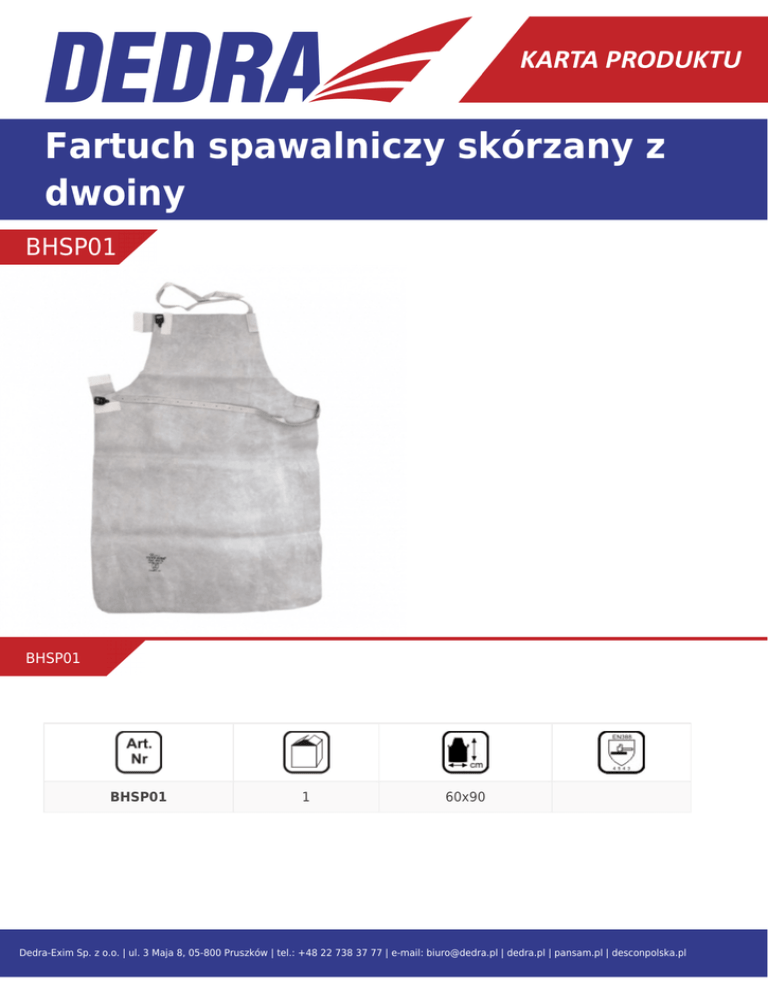 Fartuch spawalniczy skórzany z dwoiny BHSP01 BHSP01 BHSP01 1 60x90 Dedra-Exim Sp. z o.o. | ul. 3 Maja 8, 05-800 Pruszków | tel.: +48 22 738 37 77 | e-mail: [email protected] | dedra.pl | pansam.pl | desconpolska.pl