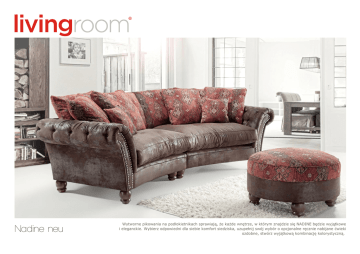 Nadine neu Wytworne pikowania na podłokietnikach sprawiają, że każde wnętrze, w którym znajdzie się NADINE będzie wyjątkowe i eleganckie. Wybierz odpowiedni dla siebie komfort siedziska, uzupełnij swój wybór o opcjonalne ręcznie nabijane ćwieki ozdobne, stwórz wyjątkową kombinację kolorystyczną. Nadine neu Nadine neu Nadine neu 1002 Fotel z dwoma podłokietnikami 1502XL 1,5-fotel głęboki z dwoma podłokietnikami 2002 2-sofa z dwoma podłokietnikami 2502 2,5-sofa z dwoma podłokietnikami 374 2,5-sofa głęboka z dwoma podłokietnikami 4626 3-sofa z dwoma podłokietnikami W/D/H 130/96/104 cm W/D/H 168/111/104 cm W/D/H 193/96/104 cm W/D/H 220/96/104 cm W/D/H 220/111/104 cm W/D/H 270/96/104 cm 10042O fotel mały z oparciem pod głowę 1002O fotel z oparciem pod głowę 90313 Pufa okrągła (średnica 82) W/D/H 113/98/117 cm W/D/H 82/82/49 cm 306 3-sofa głęboka z dwoma podłokietnikami W/D/H 270/111/104 cm 259 250 3-sofa z dwoma 3-sofa głęboka z dwoma podłokietnikami (zaokrąglona) podłokietnikami (zaokrąglona) W/D/H 278/110/104 cm W/D/H 305/136/104 cm W/D/H 100/88/103 cm