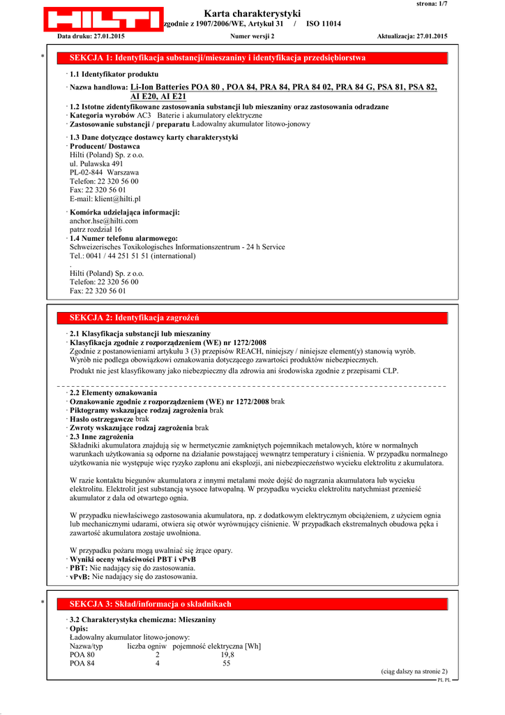 strona: 1/7 Karta charakterystyki zgodnie z 1907/2006/WE, Artykuł 31 Data druku: 27.01.2015 * / ISO 11014 Numer wersji 2 Aktualizacja: 27.01.2015 SEKCJA 1: Identyfikacja substancji/mieszaniny i identyfikacja przedsiębiorstwa · 1.1 Identyfikator produktu · Nazwa handlowa: Li-Ion Batteries POA 80 , POA 84, PRA 84, PRA 84 02, PRA 84 G, PSA 81, PSA 82, AI E20, AI E21 · 1.2 Istotne zidentyfikowane zastosowania substancji lub mieszaniny oraz zastosowania odradzane · Kategoria wyrobów AC3 Baterie i akumulatory elektryczne · Zastosowanie substancji / preparatu Ładowalny akumulator litowo-jonowy · 1.3 Dane dotyczące dostawcy karty charakterystyki · Producent/ Dostawca Hilti (Poland) Sp. z o.o. ul. Pulawska 491 PL-02-844 Warszawa Telefon: 22 320 56 00 Fax: 22 320 56 01 E-mail: [email protected] · Komórka udzielająca informacji: [email protected] patrz rozdział 16 · 1.4 Numer telefonu alarmowego: Schweizerisches Toxikologisches Informationszentrum - 24 h Service Tel.: 0041 / 44 251 51 51 (international) . Hilti (Poland) Sp. z o.o. Telefon: 22 320 56 00 Fax: 22 320 56 01 SEKCJA 2: Identyfikacja zagrożeń · 2.1 Klasyfikacja substancji lub mieszaniny · Klasyfikacja zgodnie z rozporządzeniem (WE) nr 1272/2008 Zgodnie z postanowieniami artykułu 3 (3) przepisów REACH, niniejszy / niniejsze element(y) stanowią wyrób. Wyrób nie podlega obowiązkowi oznakowania dotyczącego zawartości produktów niebezpiecznych. Produkt nie jest klasyfikowany jako niebezpieczny dla zdrowia ani środowiska zgodnie z przepisami CLP. · 2.2 Elementy oznakowania · Oznakowanie zgodnie z rozporządzeniem (WE) nr 1272/2008 brak · Piktogramy wskazujące rodzaj zagrożenia brak · Hasło ostrzegawcze brak · Zwroty wskazujące rodzaj zagrożenia brak · 2.3 Inne zagrożenia Składniki akumulatora znajdują się w hermetycznie zamkniętych pojemnikach metalowych, które w normalnych warunkach użytkowania są odporne na działanie powstającej wewnątrz temperatury i ciśnienia. W przypadku normalnego użytkowania nie występuje więc ryzyko zapłonu ani eksplozji, ani niebezpieczeństwo wycieku elektrolitu z akumulatora. W razie kontaktu biegunów akumulatora z innymi metalami może dojść do nagrzania akumulatora lub wycieku elektrolitu. Elektrolit jest substancją wysoce łatwopalną. W przypadku wycieku elektrolitu natychmiast przenieść akumulator z dala od otwartego ognia. W przypadku niewłaściwego zastosowania akumulatora, np. z dodatkowym elektrycznym obciążeniem, z użyciem ognia lub mechanicznymi udarami, otwiera się otwór wyrównujący ciśnienie. W przypadkach ekstremalnych obudowa pęka i zawartość akumulatora zostaje uwolniona. W przypadku pożaru mogą uwalniać się żrące opary. · Wyniki oceny właściwości PBT i vPvB · PBT: Nie nadający się do zastosowania. · vPvB: Nie nadający się do zastosowania. * SEKCJA 3: Skład/informacja o składnikach · 3.2 Charakterystyka chemiczna: Mieszaniny · Opis: Ładowalny akumulator litowo-jonowy: Nazwa/typ liczba ogniw pojemność elektryczna [Wh] POA 80 2 19,8 POA 84 4 55 (ciąg dalszy na stronie 2) PL PL 40.0 40.0 strona: 2/7 Karta charakterystyki zgodnie z 1907/2006/WE, Artykuł 31 Data druku: 27.01.2015 / ISO 11014 Numer wersji 2 Aktualizacja: 27.01.2015 Nazwa handlowa: Li-Ion Batteries POA 80 , POA 84, PRA 84, PRA 84 02, PRA 84 G, PSA 81, PSA 82, AI E20, AI E21 (ciąg dalszy od strony 1) PRA 84 PRA 84 02 PRA 84 G PSA 81 PSA 82 AI E20 AI E21 4 4 4 4 4 2 2 33,0 37,0 44,0 37 36 8 16 · Składniki niebezpieczne: Produkt zawiera elektrodę dodatnią (tlenek litowo-kobaltowy), elektrodę ujemną (węgiel) oraz elektrolit (węglan etylu, węglan dietylu i fosforan litowo-heksafluorowy). W normalnych warunkach użytkowania kontakt z tymi substancjami jest wykluczony. SEKCJA 4: Środki pierwszej pomocy · 4.1 Opis środków pierwszej pomocy · Wskazówki ogólne: Produkt zawiera elektrolit organiczny. Jeśli elektrolit wycieknie z akumulatora, należy przestrzegać poniższych zaleceń. · po wdychaniu: Porażonego wyprowadzić na świeże powietrze i spokojnie ułożyć. Dostarczyć świeże powietrze lub tlen; wezwać lekarza. W przypadku utraty przytomności ułożenie i transport w stabilnej pozycji bocznej. · po styczności ze skórą: Natychmiast zmyć wodą i mydłem i dobrze spłukać. · po styczności z okiem: Przepłukać oczy z otwartą powieką przez kilka minut pod bieżącą wodą i zasięgnąć porady lekarza. · po przełknięciu: Natychmiast zasięgnąć porady lekarza. · 4.2 Najważniejsze ostre i opóźnione objawy oraz skutki narażenia Brak dostępnych dalszych istotnych danych · 4.3 Wskazania dotyczące wszelkiej natychmiastowej pomocy lekarskiej i szczególnego postępowania z poszkodowanym Brak dostępnych dalszych istotnych danych SEKCJA 5: Postępowanie w przypadku pożaru · 5.1 Środki gaśnicze · Przydatne środki gaśnicze: CO2, proszek gaśniczy lub strumień rozpylonej wody. Większy pożar zwalczać strumieniem rozpylonej wody. piana · Środki gaśnicze nieprzydatne ze względów bezpieczeństwa: woda pełnym strumieniem · 5.2 Szczególne zagrożenia związane z substancją lub mieszaniną Przy ogrzewaniu lub w wypadku pożaru możliwe jest tworzenie się trujących gazów. · 5.3 Informacje dla straży pożarnej · Specjalne wyposażenie ochronne: Nosić urządzenie ochrony dróg oddechowych niezależnie od powietrza otoczenia. Nosić pełne ubranie ochronne. Zadbać o wystarczające wietrzenie. SEKCJA 6: Postępowanie w przypadku niezamierzonego uwolnienia do środowiska · 6.1 Indywidualne środki ostrożności, wyposażenie ochronne i procedury w sytuacjach awaryjnych Nosić ubranie ochronne. Osoby nie zabezpieczone przenieść w bezpieczne miejsce. Źródła zapłonu trzymać w bezpiecznej odległości. Zadbać o wystarczające wietrzenie. Ludzie powinni opuścić miejsce zagrożenia i przebywać w miejscu przewiewnym. · 6.2 Środki ostrożności w zakresie ochrony środowiska: Nie dopuścić