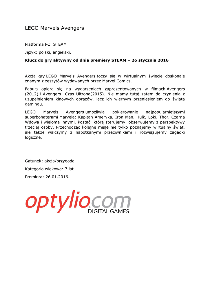 LEGO Marvels Avengers Platforma PC: STEAM Język: polski, angielski. Klucz do gry aktywny od dnia premiery STEAM – 26 stycznia 2016 Akcja gry LEGO Marvels Avengers toczy się w wirtualnym świecie doskonale znanym z zeszytów wydawanych przez Marvel Comics. Fabuła opiera się na wydarzeniach zaprezentowanych w filmach Avengers (2012) i Avengers: Czas Ultrona(2015). Nie mamy tutaj zatem do czynienia z uzupełnieniem kinowych obrazów, lecz ich wiernym przeniesieniem do świata gamingu. LEGO Marvels Avengers umożliwia pokierowanie najpopularniejszymi superbohaterami Marvela: Kapitan Ameryka, Iron Man, Hulk, Loki, Thor, Czarna Wdowa i wieloma innymi. Postać, którą sterujemy, obserwujemy z perspektywy trzeciej osoby. Przechodząc kolejne misje nie tylko poznajemy wirtualny świat, ale także walczymy z napotkanymi przeciwnikami i rozwiązujemy zagadki logiczne. Gatunek: akcja/przygoda Kategoria wiekowa: 7 lat Premiera: 26.01.2016.