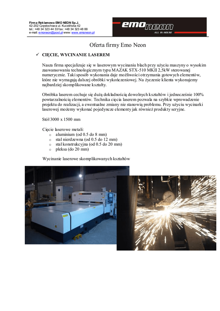 Firm a Reklamowa EMO NEON Sp.J. 42-202 Częstochowa ul. Kucelińska 42 tel.: +48 34 323 44 33 fax: +48 34 323 48 88 e-mail: [email protected] www: www.emoneon.pl Oferta firmy Emo Neon CIĘCIE, WYCINANIE LASEREM Nasza firma specjalizuje się w laserowym wycinaniu blach przy użyciu maszyny o wysokim zaawansowaniu technologicznym typu MAZAK STX-510 MKII 2,5kW sterowanej numerycznie. Taki sposób wykonania daje możliwości otrzymania gotowych elementów, które nie wymagają dalszej obróbki wykończeniowej. Na życzenie klienta wykonujemy najbardziej skomplikowane kształty. Obróbka laserem cechuje się dużą dokładnością dowolnych kształtów i jednocześnie 100% powtarzalnością elementów. Technika cięcia laserem pozwala na szybkie wprowadzenie projektu do realizacji, a ewentualne zmiany nie stanowią problemu. Przy użyciu wycinarki laserowej możemy wykonać pojedyncze elementy jak również produkty seryjne. Stół 3000 x 1500 mm Cięcie laserowe metali: o aluminium (od 0.5 do 8 mm) o stal nierdzewna (od 0.5 do 12 mm) o stal konstrukcyjna (od 0.5 do 20 mm) o pleksa (do 20 mm) Wycinanie laserowe skomplikowanych kształtów Firm a Reklamowa EMO NEON Sp.J. 42-202 Częstochowa ul. Kucelińska 42 tel.: +48 34 323 44 33 fax: +48 34 323 48 88 e-mail: [email protected] www: www.emoneon.pl GIĘCIE PRASĄ KRAWĘDZIOWĄ Zajmujemy się również usługą gięcia na prasie krawędziowej SMD typu PBH 220-4100-4C sterowanej numerycznie na długości do 4200mm z maksymalnym naciskiem do 220 ton. Na życzenie klienta wykonujemy dowolną ilość egzemplarzy przy jednoczesnym zachowaniu 100% powtarzalności kształtów. Maszyna ta osiąga najwyższą precyzję i dokładność gięcia. Dzięki zastosowaniu krawędziarki numerycznej nasza firma gwarantuje uzyskanie elementów o wysokiej jakości przy dowolnej ilości powtarzalnych elementów. Dzięki dużej ilości posiada nych narzędzi świadczymy szeroki zakres usług gięcia prasą krawędziową. Cechuje nas doświadczenie i szybki czas realizacji zamówień oraz konkurencyjne ceny. CIĘCIE / SPAWANIE Szybkie, oraz bardzo precyzyjne spawanie elementów aluminiowych, nierdzewnych lub ze stali czarnej. Posiadamy profesjonalne automaty spawalnicze firmy Kempi, spawy są wykonywane w technologii MIG, MAG oraz TIG. LAKIERNIA PROSZKOWA i LAKIERNIA NA MOKRO Dysponujemy własną bardzo nowoczesną lakiernią proszkową oraz lakiernią na mokro. CYNKOWANIE Nasza firma ściśle współpracuje z cynkowniami toteż przy realizacji pro jektów istnieje również taka możliwość przy bardzo korzystnych cenach. PRZYGOTOWYWANIE PROJEKTÓW CAD/COREL NA ŻYCZENIE KLIENTA Na życzenie klienta przygotujemy projekt CAD oraz Corel z rysunków klienta. Naszymi atutami są, jakość wykonania, szybkość realizacji zamówień wynikająca z nowoczesnych urządzeń, precyzja oraz konkurencyjne ceny, które uzależnione są od projektów nadesłanych przez zleceniodawców. Na tej podstawie dokonuje się wyceny. Jeśli jesteście państwo zainteresowani ws półpracą bądź stworzenie m przykładowych próbek prosimy o kontakt be zpoś redni: Tel: +48 34 323 44 33 / +48 34 323 68 88 fax: +48 34 323 48 88 lub drogą mailową marketing@e moneon.pl Zapraszamy równie ż do siedziby firmy w Częstochowie przy ulicy Kucelińskiej 42