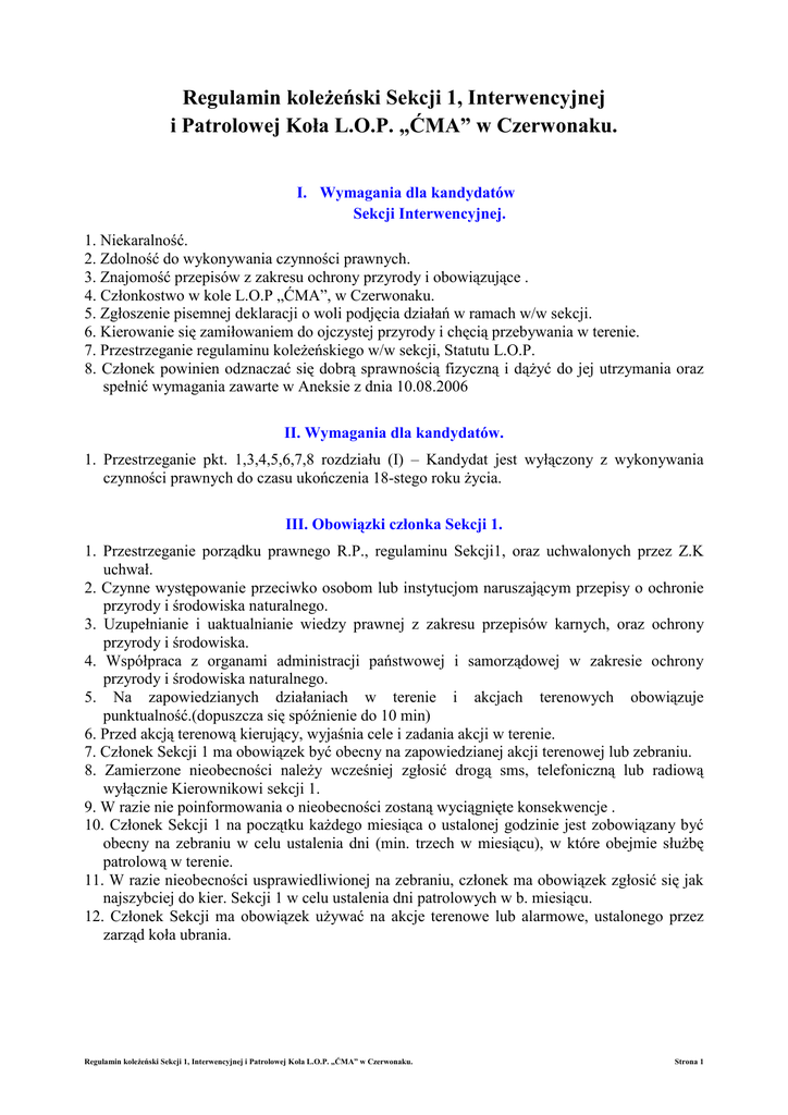 Regulamin koleŜeński Sekcji 1, Interwencyjnej i Patrolowej Koła L.O.P. „ĆMA” w Czerwonaku.