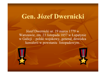 Gen. Józef Dwernicki Józef Dwernicki ur. 19 marca 1779 w Warszawie, zm. 23 listopada 1857 w Łopatynie w Galicji – polski wojskowy, generał, dowódca kawalerii w powstaniu listopadowym. Dzieciństwo i edukacja Pochodził z rodziny szlacheckiej pieczętującej się herbem Sas, której majątki Balina i Zawale znajdowały się na Podolu po prawej stronie Zbrucza. Rodzice dbali o jego patriotyczne wychowanie. Przyszły generał zaczął swój zawód wojskowy bardzo wcześnie bo w 1791 r., ochotniczo wstępując do artylerii polowej. Był w niej bardzo krótko. W 1795 r. opuścił Szkołę Rycerską po rozwiązaniu wojska polskiego. Przeniósł się do rodzinnego Zawala i zajmował się gospodarstwem. Bitwy Gen. Józefa Dwernickiego W 1806 r., kiedy wojska francuskie zbliżyły się do Wisły, Dwernicki wraz ze swoim przyjacielem Augustynem Trzecieskim zorganizował Towarzystwo Patriotyczne, mające na celu przygotowanie powstania przeciw Rosjanom. Pokój w Tylży to udaremnił. W 1809 r. Dwernicki uzbroił swoim kosztem 80 ludzi ze swoich dóbr, przebył Zbrucz i połączył się z oddziałami wojska polskiego Piotra Strzyżewskiego 27 maja 1809 pod Tarnopolem. Od tej pory rozpoczął się szlak bojowy przyszłego generała. Walczył ze swoim oddziałem z Austriakamigdzie doszło do bitwy przeciw gen. Bickingowi w dniu 18 czerwca 1809 r. pod Zaleszczykami, i pod Tarnopolem, Chorostkowcem i Wieniawką. Osiągnięcia Dwernickiego Brał udział kolejno we wszystkich większych bitwach Wielkiej Armii. Z powodu choroby pułkownika Trzecieskiego, objął Dwernicki dowództwo 15. pułku ułanów,(sformowanego w 1809 r. na Podolu) i prowadził go do Moskwy, potem przez Berezynę do Warszawy. Przez cały czas znosił trudy wojny wraz z żołnierzami. Za tę kampanię został mianowany w styczniu 1813 r. grosmajorem, a w marcu ponownie otrzymał krzyż Virtuti Militari, zwany wówczas polskim krzyżem kawalerskim. Kilka dni później Dwernicki został odznaczony francuskim krzyżem srebrnym Legii Honorowej. Po ciężkich walkach i ogromnych stratach Dwernicki ponownie zorganizował 8 pułk ułanów, na czele którego walczył w Niemczech i we Francji. Za wspaniałą szarżę pod Wirtenbergiem 13 października 1813 r. cesarz Napoleon Bonaparte osobiście przypiął Dwernickiemu krzyż złoty Legii Honorowej. Wielką brawurą odznaczył się w bitwie pod Lipskiem, wycofując się jako ostatni z pola bitwy. 4 stycznia 1814 r. Dwernicki awansował na pułkownika i otrzymał dowództwo świeżo utworzonego pułku Krakusów, z którym wsławił się szczególnie pod Clagą – wziął do niewoli kilkaset żołnierzy pruskich i rosyjskich. Równie zażartą walkę z Prusakami stoczył Dwernicki na rogatkach Paryża. Za te walki, w których okrył się sławą otrzymał stopień kapitana. Na stałe związał się z kawalerią. W nagrodę za zasługi położone w czasie wojny, książę Józef Poniatowski, naczelny wódz Wojska Księstwa Warszawskiego w 1810 r. odznaczył Dwernickiego Złotym Krzyżem Virtuti Militari i wręczył nominację na szefa szwadronu 15. pułku ułanów. Na tym stanowisku odbył kampanię 1812 r. Lata 1815 - 1830 Po upadku Napoleona i utworzeniu Królestwa Kongresowego powrócił Dwernicki wraz z wojskiem do kraju. Dzięki swoim zasługom i cechom charakteru był lubiany przez swoich i obcych. Uczestniczył w asyście otoczenia cara, kiedy ten odwiedzał Kościuszkę. Na polecenie naczelnego wodza armii polskiej, wlk. ks. Konstantego Dwernicki opracował regulamin kawalerii polskiej, następnie przetłumaczył go na rosyjski. 20 stycznia 1815 r. Dwernicki został dowódcą 2. pułku ułanów, który początkowo stacjonował w rejonach Podlasia i Lubelszczyzny, następnie w Suwałkach. Dwernicki dowodził tym pułkiem przez 14 lat. W tym czasie Dwernicki otrzymał kolejne ordery: Św. Anny z brylantami, Św. Stanisława II klasy z gwiazdą, Św. Włodzimierza III klasy. Dowodzi to docenieniu zdolności dowódczych Józefa Dwernickiego. W 1826 r. pułk Dwernickiego pełnił służbę w Warszawie. Ułani eskortowali aresztowanych patriotów i rozmawiali z nimi, co było zabronione. Dwernicki o tym wiedział i akceptował takie zachowanie. Doniesiono o tym wlk. ks. Konstantemu co spowodowało, że Dwernicki popadł w niełaskę. Pułk na przeglądzie został uznany za najgorszy, przepojony duchem rewolucyjnym. Wkrótce został odesłany z Warszawy. Dwernicki chciał opuścić pułk, ale stawiane różne trudności materialne i szykany w. ks. uniemożliwiły to. Z okazji koronacji nowego cara – króla Mikołaja I w 1829 r. na wojsko spadły liczne awanse. Józef Dwernicki został awansowany na gen. brygady i przydzielony do sztabu dywizji strzelców konnych dowodzonych przez gen. Klickiego. Z rozkazu gen. Klickiego Dwernicki objął dowództwo I Brygady w tej dywizji. Po tym awansie opracował regulamin dla kawalerii rosyjskiej, który obowiązywał jeszcze w czasie wojny krymskiej. Wczesne walki Wybuch powstania listopadowego w 1830 r. zastał gen. Dwernickiego w Sieradzu, gdzie dowodził 3. Pułkiem Strzelców Konnych. Dwernicki został wezwany do Warszawy, gdzie powierzono mu dowództwo nad nowymi dywizjonami, które praktycznie musiał formować od początku. Wykazał przy tym swój świetny talent organizacyjny. Do stycznia 1831 r. sformował i uzbroił 18 szwadronów gotowych do walki. W końcu stycznia Rząd Narodowy zdecydował się na wysłanie na Ruś wydzielonego korpusu pod dowództwem gen. Dwernickiego, o co on sam usilnie o to zabiegał. Po tej nominacji odwiedziła Dwernickiego delegacja z Ukrainy, Podola i Wołynia, która zaproponowała utworzenie Legii Wołyńskiej pod jego dowództwem. Legia miała wejść w skład korpusu gen. Dwernickiego. Sytuacja w kraju uległa zmianie. Do królestwa wkroczyły wojska rosyjskie. W tej sytuacji Wódz Naczelny ks. Radziwiłł wysłał korpus gen. Dwernickiego przeciwko dywizji gen. Fiodora Geismara, który stacjonował w Seroc