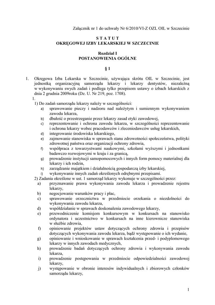 Załącznik nr 1 do uchwały Nr 6/2010/VI-Z OZL OIL w Szczecinie STATUT OKRĘGOWEJ IZBY LEKARSKIEJ W SZCZECINIE Rozdział I POSTANOWIENIA OGÓLNE §1 1. Okręgowa Izba Lekarska w Szczecinie, używająca skrótu OIL w Szczecinie, jest jednostką organizacyjną samorządu lekarzy i lekarzy dentystów, niezależną w wykonywaniu swych zadań i podlega tylko przepisom ustawy o izbach lekarskich z dnia 2 grudnia 2009roku (Dz. U. Nr 219, poz. 1708). 1. 1) Do zadań samorządu lekarzy należy w szczególności: a) sprawowanie pieczy i nadzoru nad należytym i sumiennym wykonywaniem zawodu lekarza, b) dbałość o przestrzeganie przez lekarzy zasad etyki zawodowej, c) reprezentowanie i ochrona zawodu lekarza, w szczególności reprezentowanie i ochrona lekarzy wobec pracodawców i zleceniodawców usług lekarskich, d) integrowanie środowiska lekarskiego, e) zajmowanie stanowiska w sprawach stanu zdrowotności społeczeństwa, polityki zdrowotnej państwa oraz organizacji ochrony zdrowia, f) współpraca z towarzystwami naukowymi, szkołami wyższymi i jednostkami badawczo rozwojowymi w kraju i za granicą, g) prowadzenie instytucji samopomocowych i innych form pomocy materialnej dla lekarzy i ich rodzin, h) zarządzanie majątkiem i działalnością gospodarczą izby lekarskiej, i) wykonywanie innych zadań określonych odrębnymi przepisami. 2) Zadania określone w ust. 1 samorząd lekarzy wykonuje w szczególności przez: a) przyznawanie prawa wykonywania zawodu lekarza i prowadzenie rejestru lekarzy, b) negocjowanie warunków pracy i płac, c) sprawowanie orzecznictwa w przedmiocie orzekania o niezdolności do wykonywania zawodu lekarza, d) współdziałanie w sprawach doskonalenia zawodowego lekarzy, e) przewodniczenie komisjom konkursowym w konkursach na stanowisko ordynatora i uczestnictwo w konkursach na inne kierownicze stanowiska w służbie zdrowia, f) opiniowanie projektów ustaw dotyczących ochrony zdrowia i przepisów dotyczących wykonywania zawodu lekarza, bądź występowanie o ich wydanie, g) opiniowanie i wnioskowanie w sprawach kształcenia przed- i podyplomowego lekarzy w innych zawodach medycznych, h) prowadzenie badań dotyczących ochrony zdrowia i wykonywania zawodu lekarza, i) prowadzenie postępowania w przedmiocie odpowiedzialności zawodowej lekarzy, j) występowanie w obronie interesów indywidualnych i zbiorowych członków samorządu lekarzy, 1 k) 2. 3. 4. 5. 6. 7. współdziałanie z organami administracji publicznej, organizacjami politycznymi, związkami zawodowymi oraz innymi organizacjami społecznymi w sprawach dotyczących ochrony zdrowia ludności i warunków wykonywania zawodu lekarza, l) prowadzenie działalności gospodarczej, w tym w celach zarobkowych i na własny rachunek, poprzez tworzenie spółek kapitałowych lub poprzez udział w takich spółkach, m) uznawanie kwalifikacji lekarzy, będących obywatelami państw członkowskich Unii Europejskiej, zamierzających wykonywać zawód lekarza na terytorium Rzeczypospolitej Polskiej, n) zawieszanie i pozbawianie prawa wykonywania zawodu oraz ograniczanie w wykonywaniu zawodu, o) opiniowanie kandydatur lekarzy na stanowiska lub funkcje, jeżeli odrębne przepisy tak stanowią, p) prowadzenia rejestrów praktyk lekarskich i rejestrów podmiotów prowadzących kształcenie podyplomowe lekarzy oraz rejestrów lekarzy tymczasowo i okazjonalnie wykonujących zawód lekarza, r) udzielanie zainteresowanym lekarzom informacji dotyczących ogólnych zasad wykonywania zawodu, zasad etyki lekarskiej, a także o przepisach dotyczących ochrony zdrowia, s) współdziałanie z samorządami zawodów medycznych i innymi organizacjami reprezentującymi zawody medyczne w kraju i za granicą oraz organizacjami państw członkowskich Unii Europejskiej, na zasadach określonych w art. 6a ust. 2 i 2a ustawy z dnia 5 grudnia 1996r. o zawodach lekarza i lekarza dentysty (Dz.U. z 2008r. Nr 136, poz. 857 z późn. zm.), Okręgowa Izba Lekarska w Szczecinie zakresem swojego działania na terenie województwa zachodniopomorskiego obejmuje powiaty: stargardzki, policki, pyrzycki, goleniowski, kamieński, gryficki, gryfiński, myśliborski, choszczeński, łobeski, miasto Szczecin oraz miasto Świnoujście. Okręgowa Izba Lekarska w Szczecinie jest okręgową izbą lekarską w rozumieniu ustawy o izbach lekarskich i posiada osobowość prawną. Herbem OIL w Szczecinie jest stylizowana głowa Gryfa Pomorskiego w koronie, opleciona Wężem Eskulapa z inicjałami IL. Organem prasowym OIL w Szczecinie jest biuletyn „Vox medici”. OIL w Szczecinie ma prawo używania pieczęci urzędowej z herbem OIL w Szczecinie. Ilekroć statut używa określenia „lekarz” należy przez to rozumieć również lekarza dentystę. Rozdział II ZASADY DZIAŁANIA OKRĘGOWEJ IZBY LEKARSKIEJ W SZCZECINIE §2 1. 2. Organami OIL w Szczecinie są: 1) Okręgowy Zjazd Lekarzy 2) Okręgowa Rada Lekarska 3) Okręgowa Komisja Rewizyjna 4) Okręgowy Sąd Lekarski 5) Okręgowy Rzecznik Odpowiedzialności Zawodowej. Kadencja organów OIL w Szczecinie trwa 4 lata i tę samą funkcję w organach OIL w Szczecinie można pełnić nie dłużej niż przez dwie następujące po sobie kadencje. 2 3. 1. 2. 3. 4. Tryb wyborów do organów i w organach izb lekarskich oraz tryb odwołania członków tych organów reguluje uchwała Krajowego Zjazdu Lekarzy podjęta na podstawie art. 38 pkt. 5 lit. a) ustawy o izbach lekarskich z dnia 2 grudnia 2009roku (Dz. U. Nr 219, poz. 1708). §3 Najwyższą władzą OIL w Szczecinie jest Okręgowy Zjazd Lekarzy, w którym uczestniczą członkowie OIL w Szczecinie poprzez swoich delegatów wybieranych na okres 4-ch lat na zebraniach w rejonach wyborczych wg zasady: 1 delegat na 40 członków OIL w Szczecinie. Rejony wyborcze określa uchwałą Okręgowa Rada Lekarska w Szczecinie. Organizację i tryb działania Okręgowego Zjazdu Lekarzy OIL w Szczecinie określa Uchwała nr 17/90/I NRL z dnia 05.05.1990 roku oraz Uchwała nr 27/90/I NRL,