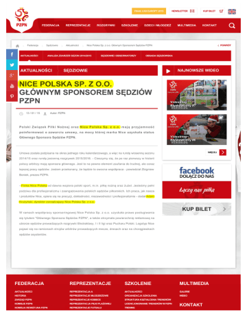 FINAŁ LIGI EUROPY 2015 FEDERACJA Federacja REPREZENTACJE Sędziowie AKTUALNOŚCI Aktualności ROZGRYWKI Czego szukasz ? DZIECI I MŁODZIEŻ SĘDZIOWIE I OBSERWATORZY KUP BILET KONTAKT Strona WWW POWRÓT NAJNOWSZE WIDEO SĘDZIOWIE Videoblog Błyskawiczny #7 Autor: PZPN Polski Związek Piłki Nożnej oraz Nice Polska Sp. z o.o. mają przyjemność poinformować o zawarciu umowy, na mocy której marka Nice uzyskała status Videoblog Błyskawiczny #6 Głównego Sponsora Sędziów PZPN. > MULTIMEDIA OBSADA SĘDZIOWSKA NICE POLSKA SP. Z O.O. GŁÓWNYM SPONSOREM SĘDZIÓW PZPN 13 / 01 / 15 NEWSLETTER Nice Polska Sp. z o.o. Głównym Sponsorem Sędziów PZPN ANALIZA ZDARZEŃ SEZON 2014/2015 AKTUALNOŚCI SZKOLENIE WIĘCEJ Umowa została podpisana na okres jednego roku kalendarzowego, a więc na rundę wiosenną sezonu 2014/15 oraz rundę jesienną rozgrywek 2015/2016. - Cieszymy się, że po raz pierwszy w historii polscy arbitrzy mają sponsora głównego. Jest to na pewno element zaufania do trudnej, ale coraz lepszej pracy sędziów. Jestem przekonany, że będzie to owocna współpraca - powiedział Zbigniew Boniek, prezes PZPN. - Firma Nice Polska od dawna wspiera polski sport, m.in. piłkę nożną oraz żużel. Jesteśmy pełni podziwu dla profesjonalizmu i zaangażowania polskich sędziów piłkarskich. Ich praca, jak nasza i produktów Nice, opiera się na precyzji, dokładności, niezawodności i profesjonalizmie - dodał Adam Krużyński, dyrektor zarządzający Nice Polska Sp. z o.o. W ramach współpracy sponsoringowej Nice Polska Sp. z o.o. uzyskała prawo posługiwania KUP BILET się tytułem "Głównego Sponsora Sędziów PZPN", a także otrzymała powierzchnię reklamową na ubiorze sędziów prowadzących rozgrywki Ekstraklasy, I i II ligi oraz Pucharu Polski. Logotyp Nice pojawi się na ramionach strojów arbitrów prowadzących mecze, dresach oraz na chorągiewkach sędziów asystentów. FEDERACJA REPREZENTACJE SZKOLENIE MULTIMEDIA AKTUALNOŚCI REPREZENTACJA A AKTUALNOŚCI GALERIE HISTORIA REPREZENTACJE MŁODZIEŻOWE ORGANIZACJA SZKOLENIA WIDEO ZARZĄD PZPN REPREZENTACJE KOBIECE STRUKTURA KSZTAŁCENIA TRENERÓW KOMISJE PZPN REPREZENTACJA PIŁKI PLAŻOWEJ LICENCJONOWANIE TRENERÓW W PZPN KOMISJA REWIZYJNA PZPN REPREZENTACJE FUTSALU TRENING KONTAKT