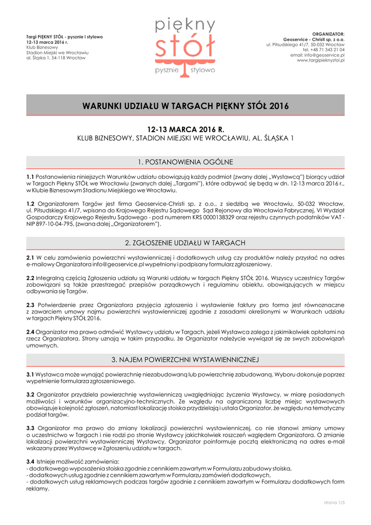 ORGANIZATOR: Geoservice - Christi sp. z o.o. ul. Piłsudskiego 41/7, 50-032 Wrocław tel. +48 71 343 21 04 email: [email protected] www.targipieknystol.pl Targi PIĘKNY STÓŁ - pysznie i stylowo 12-13 marca 2016 r. Klub Biznesowy Stadion Miejski we Wrocławiu al. Śląska 1, 54-118 Wrocław WARUNKI UDZIAŁU W TARGACH PIĘKNY STÓŁ 2016 12-13 MARCA 2016 R. KLUB BIZNESOWY, STADION MIEJSKI WE WROCŁAWIU, AL. ŚLĄSKA 1 1. POSTANOWIENIA OGÓLNE 1.1 Postanowienia niniejszych Warunków udziału obowiązują każdy podmiot (zwany dalej „Wystawcą”) biorący udział w Targach Piękny STÓŁ we Wrocławiu (zwanych dalej „Targami”), które odbywać się będą w dn. 12-13 marca 2016 r., w Klubie Biznesowym Stadionu Miejskiego we Wrocławiu. 1.2 Organizatorem Targów jest firma Geoservice-Christi sp. z o.o., z siedzibą we Wrocławiu, 50-032 Wrocław, ul. Piłsudskiego 41/7, wpisana do Krajowego Rejestru Sądowego Sąd Rejonowy dla Wrocławia Fabrycznej, VI Wydział Gospodarczy Krajowego Rejestru Sądowego - pod numerem KRS 0000138329 oraz rejestru czynnych podatników VAT NIP 897-10-04-795, (zwana dalej „Organizatorem”). 2. ZGŁOSZENIE UDZIAŁU W TARGACH 2.1 W celu zamówienia powierzchni wystawienniczej i dodatkowych usług czy produktów należy przysłać na adres e-mailowy Organizatora [email protected] wypełniony i podpisany formularz zgłoszeniowy. 2.2 Integralną częścią Zgłoszenia udziału są Warunki udziału w targach Piękny STÓŁ 2016. Wszyscy uczestnicy Targów zobowiązani są także przestrzegać przepisów porządkowych i regulaminu obiektu, obowiązujących w miejscu odbywania się Targów. 2.3 Potwierdzenie przez Organizatora przyjęcia zgłoszenia i wystawienie faktury pro forma jest równoznaczne z zawarciem umowy najmu powierzchni wystawienniczej zgodnie z zasadami określonymi w Warunkach udziału w targach Piękny STÓŁ 2016. 2.4 Organizator ma prawo odmówić Wystawcy udziału w Targach, jeżeli Wystawca zalega z jakimikolwiek opłatami na rzecz Organizatora. Strony uznają w takim przypadku, że Organizator należycie wywiązał się ze swych zobowiązań umownych. 3. NAJEM POWIERZCHNI WYSTAWIENNICZNEJ 3.1 Wystawca może wynająć powierzchnię niezabudowaną lub powierzchnię zabudowaną. Wyboru dokonuje poprzez wypełnienie formularza zgłoszeniowego. 3.2 Organizator przydziela powierzchnię wystawienniczą uwzględniając życzenia Wystawcy, w miarę posiadanych możliwości i warunków organizacyjno-technicznych. Ze względu na ograniczoną liczbę miejsc wystawowych obowiązuje kolejność zgłoszeń, natomiast lokalizację stoiska przydzielają i ustala Organizator, że względu na tematyczny podział targów. 3.3 Organizator ma prawo do zmiany lokalizacji powierzchni wystawienniczej, co nie stanowi zmiany umowy o uczestnictwo w Targach i nie rodzi po stronie Wystawcy jakichkolwiek roszczeń względem Organizatora. O zmianie lokalizacji powierzchni wystawienniczej Wystawcy, Organizator poinformuje pocztą elektroniczną na adres e-mail wskazany przez Wystawcę w Zgłoszeniu udziału w targach. 3.4 Istnieje możliwość zamówienia: - dodatkowego wyposażenia stoiska zgodnie z cennikiem zawartym w Formularzu zabudowy stoiska, - dodatkowych usług zgodnie z cennikiem zawartym w Formularzu zamówień dodatkowych, - dodatkowych usług reklamowych podczas targów zgodnie z cennikiem zawartym w Formularzu dodatkowych form reklamy. strona 1/5 4. WARUNKI PŁATNOŚCI 4.1 Koszty wynajmu powierzchni niezabudowanej i zabudowanej: POWIERZCHNIA NIEZABUDOWANA 200 PLN netto / m2 POWIERZCHNIA ZABUDOWANA* 275 pln netto / m2 OPŁATA REJESTRACYJNA 100 PLN netto dopłata za stoisko w położeniu narożnym +10% wartości zamówionej powierzchni * Minimalna powierzchnia stoiska zabudowanego wynosi 6m 2 4.2 Do wartości podanych cen oferowanych usług zostanie doliczony podatek VAT zgodnie z obowiązującymi przepisami. 4.3 W ramach wynajmu powierzchni niezabudowanej Wystawcy otrzymują: do 12m2 13 - 24m2 od 25m2 2 4 6 gniazdo 230 V (max. 3 kW) tak tak tak wpis podstawowy w Katalogu Targowym (dane teleadresowe + logo+ oferta firmy do 200 znaków ze spacjami) tak tak tak dostęp do WiFi tak tak tak zaproszenia dla gości 10 10 10 STOISKO O POWIERZCHNI karty wystawcy Obowiązek wyposażenia stoiska niezabudowanego przynajmniej w ściany boczne oraz ścianę tylną spoczywa na Wystawcy. Ściany takie mogą być wynajęte od Organizatora. Istnieje również możliwość zamówienia u Organizatora stoiska zgodnie z indywidualnym projektem w terminie do 19 lutego 2016 r. 4.4 W ramach wynajmu powierzchni zabudowanej Wystawcy otrzymują: 6 - 12m2 13 - 24m2 od 25m2 ściany zewnętrzne (h=2,5 m) tak tak tak fryz literniczy tak tak tak wykładzina dywanowa (szara) tak tak tak zaplecze z kotarką/drzwiami* (wielkość uzależniona od metrażu stoiska) tak tak tak stół 1 1 1 lada informacyjna (0,5 x 1,0 m) 1 1 1 krzesła 3 6 9 kosz na śmieci 1 1 1 wieszak 1 1 1 karty wystawcy 2 4 6 lampka (100 W na 3m2 ) tak tak tak gniazdo 230 V (max. 3 kW) tak tak tak wpis podstawowy w Katalogu Targowym (dane teleadresowe + logo+ oferta firmy do 200 znaków ze spacjami) tak tak tak dostęp do WiFi tak tak tak zaproszenia dla gości 10 10 10 STOISKO O POWIERZCHNI Opłata za zabudowę stoiska obejmuje: montaż i demontaż stoiska oraz wyposażenie. Fryz literniczy zawiera nazwę firmy oraz miasta. Ewentualne logo na fryzie jest opcjonalne i podlega osobnej wycenie. Rezygnacja z części lub całości standardowego wyposażenia nie powoduje zmniejszenia kosztów wynajęcia stoiska. Wystawca odpowiada za powierzone mu wyposażenie stoiska i zabudowę. Uszkodzenie panelu ściennego lub elementu zabudowy pociąga za sobą opłatę w wysokości nie niższej niż 100,00 PLN netto. strona 2/5 4.5 Wystawca zobowiązany jest dokonać opłaty rejestracyjnej oraz 30% zaliczki (od kwoty wynikającej ze zgłoszenia), na konto bankowe Organizatora, w terminie 7 dni od otrzymania faktury pro forma. Pozostała c