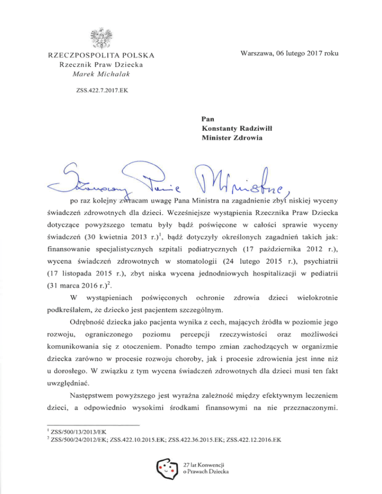 .ffi W arszawa, 06 lutego 20l 7 ľoku RZECZPOSPOLITA POLSKA Rzecznik Praw Dziecka Maľek Michaĺak 2ss.422.7.2017.EK Pan Konstanty Radziwiłł Minĺster Zdrowia rr^- q po raz kol e l'\^-.- uwagę Pana Ministra na zagadnienie niskiej wyceny świadczeń zdrowotnych dla dzieci. Wcześniejsze wystąpienia RzecznĹka Praw Dziecka były bądź poświęcone w całościsprawie wyceny ..)', bądż dotyczyły określonych zagadnień takich jak: dotyczące powyższego tematu świadczeń (30 kwietnia 2013 finansowanie specjalistycznych szpitali pediatrycznych wycena świadczeń zdrowotnych w (l7 października 2012 r.), stomatologii (24 lutego 20l5 r.), psychiatrii (17 listopada 2015 r.), zbyt niska wycena jednodniowych hospitalizacji w pediatrii (31 maľca 2016 r.)2. w wystąpieniach poświęconych ochronie zdrowia dzieci wielokľotnie podkľeślałem,że dziecko jest pacjentem szczególnym. odľębnośćdziecka jako pacjenta wynika z cech, mających żrődła w poziomie jego rozwoju, ograniczonego poziomu percepcji rzeczywistości oraz możliwości komunikowania się z otoczeniem. Ponadto tempo zmian zachodzących w oľganizmie dziecka zarőwno w procesie rozwoju choľoby, jak i procesie zdľowienia jest inne niż u dorosłego. W związku z tym wycena świadczeń zdľowotnych dla dzieci musi ten fakt uwzględniać. Następstwem powyzszego jest wyľaŹna zaleŻnośćmiędzy efektywnym lęczeniem dzieci, a odpowiednio wysokimi środkami finansowymi na nie zssrsoo/t: r2or3rąK 'zsslsoolząl2ll2lEK;Zss.422.lO.20l5.EK; Zss.422.36.2015.EK; Zss.422.l2.20l6.EK ' a 27 lat Konwencji o Pľawach Dziecka przeznaczonymi. Bardzo istotnym elementem tego zagadnienia jest adekwatna do rzeczywistych kosztiw wycena poszczegőlnych procedur medycznych stosowanych u dzieci. Bľak takiej wyceny skutkuje wciąŻ traktowaniem placówek medycznych dla dzieci jako kosztochłonnych i nieopłacalnych, ze wszystkimi niekorzystnymi tego następstwami. Mając na względzie dobro dzieci, w tym zapewnienie im zdľowotnego bezpieczenstwa, powołując się na upowaznienie Rzecznika Praw Dziecka do podejmowaĺria działań w interesie dneci okľeśloneprzepisami art.3 oraz aľt. 10a ustawy z drua6 styczrua 2000 r. o Rzecmiku Pľaw Dzieck a (Dz. U ' z 2015 Í. poz' 2086 z pőźn. zm.) ZwÍacaÍn się do Paĺra Ministľa o infoľmację o aktualnym stanie ďZ]ałańpodejmowanychnarzecz urealnienia wyceny świadczeń zdrowotnych dla dzieci i przewidywanego terminu ich zakończenia. \e.^a-Cr\rt 2