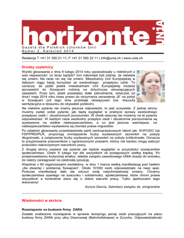 Gazeta dla Polskich członków Unii Numer 2, Kwiecień 2014 Redakcja T +41 31 350 21 11, F +41 31 350 22 11 | [email protected] | www.unia.ch Drodzy czytelnicy Wyniki głosowania z dnia 9 lutego 2014 roku spowodowały u niektórych z was niepewność: co teraz będzie? Inni natomiast byli zdania, że niewiele się zmieni. Na razie nic się nie zmieni. Mieszkańcy Unii Europejskiej w dalszym ciągu będą korzystać ze swobodnego przepływu osób. To oznacza, że jeżeli jesteś mieszkańcem Unii Europejskiej możesz sprowadzić do Szwajcarii rodzinę na dotychczas obowiązujących zasadach. Poza tym, jeżeli posiadasz stałe zatrudnienie, wówczas od dnia1 maja 2014 roku masz prawo do otrzymania zezwolenia „B” na pobyt w Szwajcarii (od tego dnia przestaje obwiązywać tzw. klauzula wentylacyjna w stosunku do obywateli polskich). Na niektóre pytania nie znamy jeszcze odpowiedzi, to jest oczywiste. Z jednej strony musimy zadać sobie pytanie, jak będą wyglądać w praktyce sprawy swobodnego przepływu osób i obustronnych porozumień. W chwili obecnej nie możemy na te pytania odpowiedzieć. W każdym razie swobodny przepływ osób i obustronne porozumienia są wystawione na wielkie niebezpieczeństwo, a co jest jeszcze ważniejsze, na niebezpieczeństwo wystawione są również prawa migrantów. Po ostatnim głosowaniu przedstawiciele partii centroprawicowych takich jak: SVP/UDC lub FDP/PRD/PLR, proponują zmniejszenie liczby wydawanych zezwoleń na pobyty długotrwałe, a zwiększenie liczby wydawanych zezwoleń na pobyty krótkotrwałe. Oznacza to przyjmowanie pracowników z ograniczonymi prawami, którzy nie bardzo mogą walczyć przeciwko niekorzystnym warunkom pracy. Z drugiej strony pojawia się pytanie jak będzie wyglądać w przyszłości szwajcarskie społeczeństwo. Dzień 9 lutego był dla wszystkich sił postępowych wielką klęską. Po przeprowadzeniu krytycznej analizy, władze związku zawodowego UNIA doszły do wniosku, że należy zareagować na zaistniałą sytuację. Wspólnie z 60 organizacjami zwołaliśmy w dniu 1 marca wielką manifestację pod hasłem „dla otwartej i solidarnej Szwajcarii”. Około 10’000 osób odpowiedziało na nasz apel. Podczas manifestacji dało się odczuć wolę natychmiastowej zmiany. Chcemy społeczeństwa opartego na szacunku i solidarności, społeczeństwa, które chroni prawa wszystkich a konkretnie stara się o dobre warunki pracy. Tylko zjednoczeni tego dokonamy! Aurora García, Sekretarz związku ds. emigrantów Wiadomości w skrócie Rozwiązanie na budowie firmy ZARA Zostało znalezione rozwiązanie w sprawie dumpingu pensji osób pracujących na placu budowy firmy ZARA przy ulicy Dworcowej (Bahnhofstrasse) w Zurychu. Odpowiedzialność Horizonte Strona 2 z 7 za złe prowadzenie spraw wynagrodzeń swojego podwykonawcy, przejmie Inditex - filia firmy GOA Invest S.A i zagwarantuje wypłatę zaległych pensji w wysokości 450’000 franków dla około 100 poszkodowanych pracowników. Prace budowlane zostaną wznowione. Związek zawodowy UNIA - Zurych podjął kantonalną inicjatywę przeciwko dumpingowi płac. Jej celem jest zlecenie władzom wstrzymanie działalności zakładów podejrzanych o znaczny dumping płac. Wznowienie ich działalności może nastąpić dopiero wówczas, kiedy pracodawca udowodni, że przestrzega warunki pracy, albo że dokonał wypłaty zaległych wynagrodzeń. Związek zawodowy UNIA przekaże jeszcze w tym tygodniu odpowiedni tekst powyższej inicjatywy do obowiązkowego sprawdzenia. Port lotniczy w Genewie: Piloci zarabiają tylko 2000 franków Na początku marca związek zawodowy UNIA opublikował szokujący przypadek dumpingu płac. Na międzynarodowym lotnisku w Genewie, piloci i członkowie załogi samolotu zatrudnieni na pełen etat w prywatnej linii lotniczej Sonning SA zarabiają miesięcznie 2000 franków. Związek zawodowy UNIA poparł akcję protestacyjną poszkodowanych pracowników w sprawie tego skandalicznie niskiego wynagrodzenia. UNIA-konferencja migracji W dniu 10 maja odbędzie się coroczna konferencja poświęcona migracji, na którą zaproszeni są regionalni delegaci. Zainteresowani członkowie związku zawodowego UNIA jako goście są również mile widziani. Głównym tematem konferencji będzie sytuacja zaistniała po przyjęciu inicjatywy. Minimalna płaca chroni nas wszystkich Czy Szwajcaria potrzebuje ustawowego wynagrodzenia minimalnego? Kwestię tą rozstrzygnie głosowanie jakie odbędzie się w dniu 18 maja. Osoby nastawione sceptycznie do inicjatywy Szwajcarskiej Federacji Związków Zawodowych (SGB) obawiają się przede wszystkim utraty miejsc pracy. Katja Signer Hofer, rzecznik prasowy związku zawodowego UNIA, wyjaśnia poniżej niektóre wątpliwości. Dlaczego Szwajcaria potrzebuje płacy minimalnej? Szwajcaria jest bogatym krajem a mimo to ponad 330'000 osób zarabia mniej niż 4000 franków miesięcznie pracując na pełen etat. Podczas gdy tylko nieliczni zarabiają góry pieniędzy, inni ze swoją marną płacą wiążą ledwo koniec z końcem. Nieprzewidziany rachunek od dentysty może szybko doprowadzić ich do ruiny finansowej. Wszyscy, którzy pracują na pełen etat powinni utrzymać się ze swojej pensji. To chcemy osiągnąć dzięki naszej inicjatywie. Płaca minimalna nie tylko gwarantuje sprawiedliwe wynagrodzenie. Płaca minimalna przeszkodzi także tym pracodawcom, którzy zatrudniają tanich pracowników w obniżeniu płac dla wszystkich pracowników. Tak więc płaca minimalna chroni wynagrodzenia nas wszystkich. Kim są ludzie z niskim wynagrodzeniem? Wielu ma wykształcenie zawodowe, ukończyło specjalizację i posiada długoletnie doświadczenie zawodowe. Nie prawdą jest, że źle zarabjają tylko ludzie młodzi i niedoświadczeni. Z badań wynika, że trzy z czterech źle zarabiających osób ukończyło 25 lat. Jedna trzecia źle zarabiających posiada ukończone wykształcenie zawodowe. Liczba kobiet źle zarabiających przekra