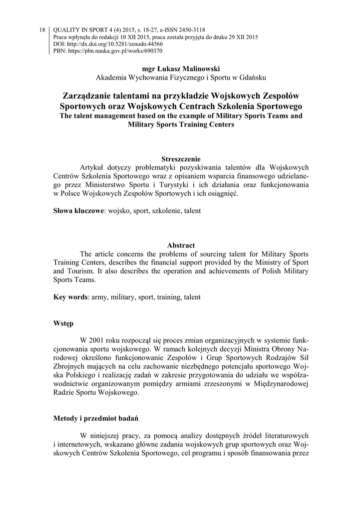 18 QUALITY IN SPORT 4 (4) 2015, s. 18-27, e-ISSN 2450-3118 Praca wpłynęła do redakcji 10 XII 2015, praca została przyjęta do druku 29 XII 2015 DOI: http://dx.doi.org/10.5281/zenodo.44566 PBN: https://pbn.nauka.gov.pl/works/690370 mgr Łukasz Malinowski Akademia Wychowania Fizycznego i Sportu w Gdańsku Zarządzanie talentami na przykładzie Wojskowych Zespołów Sportowych oraz Wojskowych Centrach Szkolenia Sportowego The talent management based on the example of Military Sports Teams and Military Sports Training Centers Streszczenie Artykuł dotyczy problematyki pozyskiwania talentów dla Wojskowych Centrów Szkolenia Sportowego wraz z opisaniem wsparcia finansowego udzielanego przez Ministerstwo Sportu i Turystyki i ich działania oraz funkcjonowania w Polsce Wojskowych Zespołów Sportowych i ich osiągnięć. Słowa kluczowe: wojsko, sport, szkolenie, talent Abstract The article concerns the problems of sourcing talent for Military Sports Training Centers, describes the financial support provided by the Ministry of Sport and Tourism. It also describes the operation and achievements of Polish Military Sports Teams. Key words: army, military, sport, training, talent Wstęp W 2001 roku rozpoczął się proces zmian organizacyjnych w systemie funkcjonowania sportu wojskowego. W ramach kolejnych decyzji Ministra Obrony Narodowej określono funkcjonowanie Zespołów i Grup Sportowych Rodzajów Sił Zbrojnych mających na celu zachowanie niezbędnego potencjału sportowego Wojska Polskiego i realizację zadań w zakresie przygotowania do udziału we współzawodnictwie organizowanym pomiędzy armiami zrzeszonymi w Międzynarodowej Radzie Sportu Wojskowego. Metody i przedmiot badań W niniejszej pracy, za pomocą analizy dostępnych źródeł literaturowych i internetowych, wskazano główne zadania wojskowych grup sportowych oraz Wojskowych Centrów Szkolenia Sportowego, cel programu i sposób finansowania przez Zarządzanie talentami na przykładzie Wojskowych Zespołów Sportowych oraz Wojskowych Centrach Szkolenia Sportowego Ministra Sportu i Turystki oraz wyniki współzawodnictwa młodzieżowego dla wybranych wojskowych klubów sportowych. W wyniku analiz, głównie programów finansujących i decyzji MON, autor stwierdza, że szczególny nacisk położono na pozyskiwanie wybitnych zawodników w dyscyplinach sportowych przydatnych dla wojska, w czym głównie pomóc mają dofinansowania oraz odpowiednia baza szkoleniowa. W ramach niniejszego artykułu przyjmuje się, że talent to szczególne, naturalne zdolności, które pozwalają wykonywać niektóre czynności powyżej poziomu przeciętnego, umiejętne wykorzystywanie zdobytej wiedzy w praktyce, oraz wyróżniająca się wyższym niż przeciętny potencjałem do dalszego rozwoju. Sport jest wieloelementowym systemem, którego sprawność jako całości zależy od jakości części składowych oraz ich współdziałania. Jeśli w szkoleniu, które stanowi jeden z najważniejszych elementów systemu sportu, pracują trenerzy o odpowiednich kompetencjach (wiedza, umiejętności, ambicja), mający do swej dyspozycji odpowiednie warunki (infrastruktura w szerokim sensie tego słowa), ale zabraknie utalentowanych zawodników – efekty mogą być niezadawalające. W szerszej skali (np. w kraju) optymalna sytuacja występuje wtedy, gdy do systemu szkolenia trafiają jednostki prawdziwie utalentowane, jak najwcześniej i w jak największych ilościach, a ich szkoleniem zajmują się wysokiej klasy fachowcy. Brak odpowiedniej selekcji kandydatów do sportu wyczynowego czy błędy popełnione w jej trakcie powodują wymierne straty m.in. finansowe i czasowe, dlatego też identyfikacja i selekcja talentów do sportu wyczynowego jest tak ważnym elementem systemu szkolenia (Talent Sportowy 2008). Talent sportowy nie sprowadza się do jakiejś jednej, wyjątkowo ważnej i silnie zaakcentowanej w naturze cechy, ale zależy od zespołu cech uwarunkowanych genetycznie i czynników środowiskowych. Stanowi on zespół predyspozycji fizycznych i psychicznych osobnika oraz efekt oddziaływania na nie czynników zewnętrznych. Problemem dyskusyjnym przestała być kwestia – czy to czynniki genetyczne czy też środowiskowe posiadają decydujący wpływ na poziom i rozwój potencjału sportowego jednostki oraz jej zachowanie, ale to, w jakich pozostają ze sobą interakcjach. Identyfikacja talentów sportowych nie oznacza tylko stwierdzenia obecności odpowiednich cech w obrębie sfery fizycznej, psychicznej czy fizjologicznej, ale także ocenę możliwości ich rozwoju. Proces sportowego rozwoju zawodnika, przechodzenie na coraz wyższe poziomy zaawansowania sportowego, ma charakter kompleksowy. Winien być monitorowany – zawodnika należy poddawać odpowiednim próbom kontrolnym, a ich wyniki mają służyć dopasowaniu programu treningu do jego możliwości i zdolności z uwzględnieniem profilu wymagań danej dziedziny sportu. Skuteczność programu rozwoju talentu sportowego zależy od wielu czynników: założeń teoretycznych i koncepcji, warunków infrastrukturalnych, poziomu specjalistów itd. (Talent Sportowy 2008). W większości dyscyplin sportowych selekcja przyszłych gwiazd przebiega w analogiczny sposób, niezależnie od położenia geograficznego. Wśród jak najmłodszych dzieci zarzuca się możliwie najszerszą sieć, by jak najwcześniej wyszukać i szkolić najlepszych (Gladwell 2010). Zarządzanie talentami, zagadnienie, które w Polsce wciąż traktowane jest jako stosunkowo nowe, pojawiło się po raz pierwszy w USA już w latach 80. XX 19 20 Łukasz Malinowski wieku. To wówczas zainteresowano się rekrutowaniem i szczególnym traktowaniem osób o wysokim potencjalne, które mogły w dużym stopniu przyczynić się do rozwoju organizacji i wzmocnienia jej konkurencyjności na rynku. Zagadnienie to zostało jednak wypromowane dopiero pod koniec lat 90. XX wieku, kiedy to ogłoszono stan „wojny o talenty” (The War f