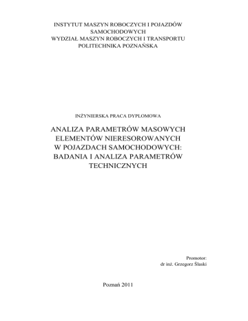 INSTYTUT MASZYN ROBOCZYCH I POJAZDÓW SAMOCHODOWYCH WYDZIAŁ MASZYN ROBOCZYCH I TRANSPORTU POLITECHNIKA POZNAŃSKA INŻYNIERSKA PRACA DYPLOMOWA ANALIZA PARAMETRÓW MASOWYCH ELEMENTÓW NIERESOROWANYCH W POJAZDACH SAMOCHODOWYCH: BADANIA I ANALIZA PARAMETRÓW TECHNICZNYCH Promotor: dr inż. Grzegorz Ślaski Poznań 2011 Streszczenie Niniejsza praca poświęcona jest analizie pojęcia masy nieresorowanej i jej fizycznej wartości dla różnych pojazdów. Celem pracy jest ocena statystyczna jej wartości i udziału mas poszczególnych elementów wchodzących w skład masy nieresorowanej w jej całkowitej wartości. Praca podzielona jest na dwie części. W pierwszej przedstawione są poszczególne elementy nieresorowane w samochodach osobowych, ciężarowych oraz autobusach. Ze względu na fakt, że praca opiera się głównie na danych dotyczących samochodów osobowych, to charakterystyka części nieresorowanych nastawiona jest głównie na tę grupę pojazdów. Opisy elementów uwzględniają również aspekt wpływu zastosowanej konstrukcji elementów, bądź materiałów na ich masę. W drugiej części, w rozdziale czwartym i piątym, przedstawiono badania dotyczące wyznaczenia masy wszystkich elementów nieresorowanych przedniej osi na przykładzie siedmiu samochodów osobowych z kilku segmentów klasowych. W części tej opisana jest cała metodologia prowadzenia badań, sposoby oraz obliczenia związane z oszacowywaniem mas części, jak również późniejsza analiza porównawcza badanych pojazdów. Wszystko poprzedzone jest wstępem teoretycznym na temat teorii drgań samochodu. 1 Spis treści Streszczenie ................................................................................................................................... 1 Wykaz skrótów i oznaczeń ............................................................................................................ 3 1. Wprowadzenie .......................................................................................................................... 5 2. Elementy nieresorowane w samochodach osobowych, uwzględnienie uwarunkowań masowych...................................................................................................................................... 8 2.1. Rodzaje zawieszeń samochodów osobowych .................................................................... 8 2.1.1. Zawieszenia osi przedniej ............................................................................................ 8 2.1.2. Zawieszenia osi tylnej ................................................................................................ 12 2.2. Mechanizmy hamulcowe.................................................................................................. 15 2.3. Opony i felgi pojazdów ..................................................................................................... 19 3. Elementy nieresorowane w samochodach ciężarowych i autobusach (na przykładzie autobusu Solaris Urbino) ............................................................................................................. 23 3.1. Samochody ciężarowe ...................................................................................................... 23 3.1.1. Zawieszenie i przeniesienie napędu .......................................................................... 23 3.1.2. Mechanizmy hamulcowe i koła samochodów ciężarowych ..................................... 27 3.2. Parametry masowe elementów nieresorowanych zawieszeń stosowanych w autobusie Solaris Urbino .......................................................................................................................... 28 4. Statystyczne oszacowania wartości mas nieresorowanych – dane literaturowe ................... 31 4.1. Ogólny przelicznik mas nieresorowanych dla określonych typów zawieszeń, napędów 31 4.2. Drgania pojazdu................................................................................................................ 33 5. Wartości parametrów masowych elementów nieresorowanych osi przednich dla wybranych samochodów osobowych – badania eksperymentalne .............................................................. 36 5.1. Obiekty badawcze ............................................................................................................ 36 5.2. Metodyka badań eksperymentalnych - sposób zbierania danych, przyrządy pomiarowe ................................................................................................................................................. 36 5.3. Wartości mas elementów nieresorowanych analizowanych pojazdów .......................... 38 5.3.1. Wyniki pomiarów mas wszystkich badanych elementów ......................................... 38 5.3.2. Sposoby szacowania mas brakujących elementów:.................................................. 42 5.4. Analiza parametrów masowych elementów nieresorowanych badanych pojazdów ...... 48 6. Podsumowanie ........................................................................................................................ 54 7. Literatura i inne źródła ............................................................................................................ 55 Załącznik 1- Zestawienie danych przykładowych pojazdów wykorzystywanych w omawianiu drgań [2] ...................................................................................................................................... 56 2 3