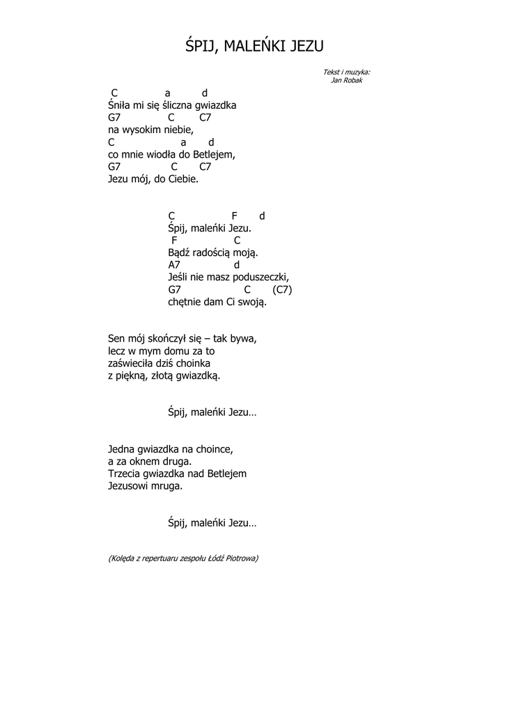 ŚPIJ, MALEŃKI JEZU Tekst i muzyka: Jan Robak C a d Śniła mi się śliczna gwiazdka G7 C C7 na wysokim niebie, C a d co mnie wiodła do Betlejem, G7 C C7 Jezu mój, do Ciebie. C F d Śpij, maleńki Jezu. F C Bądź radością moją. A7 d Jeśli nie masz poduszeczki, G7 C (C7) chętnie dam Ci swoją. Sen mój skończył się – tak bywa, lecz w mym domu za to zaświeciła dziś choinka z piękną, złotą gwiazdką. Śpij, maleńki Jezu… Jedna gwiazdka na choince, a za oknem druga. Trzecia gwiazdka nad Betlejem Jezusowi mruga. Śpij, maleńki Jezu… (Kolęda z repertuaru zespołu Łódź Piotrowa)