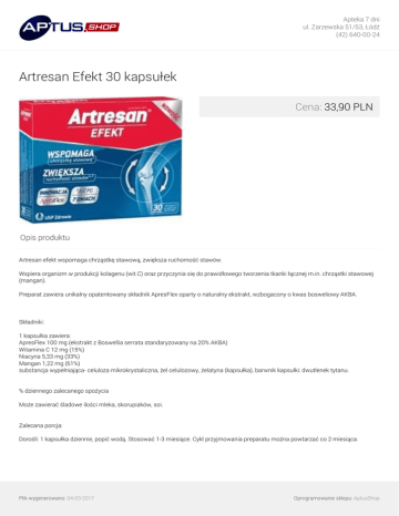 Apteka 7 dni ul. Zarzewska 51/53, Łódź (42) 640-00-24 Artresan Efekt 30 kapsułek Cena: 33,90 PLN Opis produktu Artresan efekt wspomaga chrząstkę stawową, zwiększa ruchomość stawów. Wspiera organizm w produkcji kolagenu (wit.C) oraz przyczynia się do prawidłowego tworzenia tkanki łącznej m.in. chrząstki stawowej (mangan). Preparat zawiera unikalny opatentowany składnik ApresFlex oparty o naturalny ekstrakt, wzbogacony o kwas bosweliowy AKBA. Składniki: 1 kapsułka zawiera: ApresFlex 100 mg (ekstrakt z Boswellia serrata standaryzowany na 20% AKBA) Witamina C 12 mg (15%) Niacyna 5,33 mg (33%) Mangan 1,22 mg (61%) substancja wypełniająca- celuloza mikrokrystaliczna, żel celulozowy, żelatyna (kapsułka), barwnik kapsułki: dwutlenek tytanu. % dziennego zalecanego spożycia Może zawierać śladowe ilości mleka, skorupiaków, soi. Zalecana porcja: Dorośli: 1 kapsułka dziennie, popić wodą. Stosować 1-3 miesiące. Cykl przyjmowania preparatu można powtarzać co 2 miesiąca. Plik wygenerowano: 04-03-2017 Oprogramowanie sklepu: AptusShop Apteka 7 dni ul. Zarzewska 51/53, Łódź (42) 640-00-24 Opakowanie: Opakowanie zawiera 30 kapsułek . Przechowywanie: Przechowywać w temperaturze pokojowej, w suchym miejscu niedostępnym dla dzieci. Uwagi: Suplement diety nie może być stosowany jako substytut zróżnicowanej diety. Nie należy przekraczać zalecanej dawki. Zalecany jest zrównoważony sposób żywienia i zdrowy tryb życia. Przeciwwskazania: Nadwrażliwość na którykolwiek składnik preparatu. Plik wygenerowano: 04-03-2017 Powered by TCPDF (www.tcpdf.org) Oprogramowanie sklepu: AptusShop