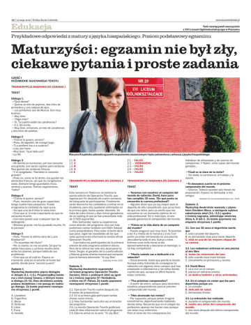 12 | 13 maja 2010 | Polska Kurier Lubelski www.kurierlubelski.pl Edukacja Test rozwiązywali nauczyciele z XVI Liceum Ogólnokształcącego w Poznaniu Przykładowe odpowiedzi z matury z języka hiszpańskiego. Poziom podstawowy egzaminu Maturzyści: egzamin nie był zły, ciekawe pytania i proste zadania CZĘŚĆ I ROZUMIENIE SŁUCHANEGO TEKSTU TRANSKRYPCJA NAGRANIA DO ZADANIA 1 TEKST Diálogo 2 –?Cómo la quiere, senora? –Pues, de algodón, de manga larga. –?La prefiere lisa o a cuadros? –Lisa, por favor. –Muy bien, ?qué talla usa? –La 40. Diálogo 3 –Mi familia es numerosa, por eso necesito uno grande, con varios cajones para verduras. Nos gustan las verduras frescas. –Y el congelador, ?también lo necesita grande? –Pues no, como le he dicho, nos gustan los alimentos frescos, así que no congelamos nada. Siempre tengo guardados fruta, verdura y quesos. Somos vegetarianos, ?sabe? Diálogo 4 –?Cómo la quiere, senora? –Pues, necesito una de gran capacidad, tengo cuatro hijos pequenos. Puede imaginarse la cantidad de ropa sucia. –Así que una de 6 kilos le viene bien. –Creo que sí, lo más importante es que no consuma mucho. –Con ésta puede usar cualquier tipo de detergente. –Muchas gracias, me ha ayudado mucho. Ya lo pensaré. Diálogo 5 –Hola, ?tienen la última obra de Lucía Etxebarría? –?Te acuerdas del título? –No, lo siento, no me acuerdo. Sé que ha salido hace poco y ya tiene mucho éxito entre los jóvenes, porque habla de sus problemas. –Creo que ya sé cuál es. Espera un momento, está en el estante al fondo del pasillo, donde pone “sección juvenil”. Zadanie 1. Wysłuchaj dwukrotnie pięciu dialogów w sklepie (1.1.–1.5.). Przyporządkuj każdemu z nich nazwę towaru, o którym mowa w dialogu (A–G). Dwa określenia zostały podane dodatkowo i nie pasują do żadnego dialogu. Za każde poprawne rozwiązanie otrzymasz 1 punkt. A. Lavadora B. Frigorífico C. Blusa D. Verduras E. Libro F. Fruta G. Vestido FOT. MARIUSZKUĆ Diálogo 1. –?Qué desea? – Quería un kilo de pepinos, dos kilos de pimientos y una cabeza de ajos. – Los pimientos son de Murcia. Son muy buenos. – Muy bien. – ?Algo más? – Sí, ?a cuánto están las zanahorias? – A 2, 50 el kilo. – Muy bien, entonces, un kilo de zanahorias y dos kilos de patatas. Marysia Krupińska zdawała egzamin na poziomie rozszerzonym i była zadowolona z arkusza z języka hiszpańskiego 1.1. D 1.2. C 1.3. B 1.4. A 1.5. E 2.1. – FALSO 2.2. – VERDADERO 2.3. – FALSO 2.4. – FALSO 2.5. – FALSO TRANSKRYPCJA NAGRANIA DO ZADANIA 2 TRANSKRYPCJA NAGRANIA DO ZADANIA 3 TEKST TEKST Esta semana en Telecinco se estrena la quinta edición de Operación Triunfo, que regresa por fin después de cuatro semanas de búsqueda de participantes. Finalmente serán dieciocho los candidatos a entrar en la Academia, pero dos quedarán eliminados en la primera gala, hasta quedar dieciséis. Se trata de ocho chicos y diez chicas ganadores de un casting al que se han presentado más de 17.500 aspirantes. Kike Santander repite su experiencia como director del programa. Una vez más podremos contar también con Edith Salazar como presentadora. Para estar al tanto de lo que pasa, sigan las novedades de las que cada quincena les informará la revista oficial Operación Triunfo. Casi todos los participantes de la primera edición de este programa editaron discos. Pero de la última tan sólo dos alcanzaron la fama: Sergio, el ganador de la cuarta edición, y Edurne, gracias al tema musical que compuso para la famosa telenovela “Yo soy Bea”. – Tenemos con nosotros al campeón del mundo de natación. David, hace poco has cumplido 30 anos. ?En qué punto se encuentra tu carrera profesional? – Algunos dicen que ya soy mayor para el deporte de alta competición, que ya es hora de que me retire, pero yo siento que me encuentro en un momento óptimo de mi vida profesional. Sin ir más lejos, el ano pasado ganamos el campeonato del mundo. adaptado de Mía, 2006. Zadanie 2. Wysłuchaj dwukrotnie wypowiedzi na temat programu Operación Triunfo. Zaznacz, które z podanych zdań są zgodne z treścią nagrania (V–Verdadero), a które nie (F–Falso). Za każde poprawne rozwiązanie otrzymasz 1 punkt. 2.1. Operación Triunfo vuelve después de 4 meses de preparativos. 2.2. En la primera gala participan tantas chicas como chicos. 2.3. Kike Santander será otra vez el director del programa. 2.4. La revista Operación Triunfo publicará cada 15 días información sobre el programa. 2.5. Edurne actuó en la serie “Yo soy Bea”. – ?Cómo es la vida diaria de un campeón del mundo? – Puedo asegurar que muy dura. Te levantas a las 4 y media de la manana y a las 5 en punto ya estás entrenando en una piscina descubierta todo el ano, llueva o nieve. Entreno unas ocho horas al día aproximadamente y descanso el domingo, si no hay competición. – ?Hasta cuándo vas a dedicarte a la natación? – Sinceramente, hasta que pierda la ilusión. Aunque estoy tratando de compaginar la natación con algunos otros campos que han empezado a interesarme y me estoy dando cuenta de que, aunque es difícil hacerlo, estoy contento. – ?Tus próximos campeonatos? – A partir de enero, aunque para diciembre estamos preparándonos para el próximo campeonato del mundo. – ?Has alcanzado tus metas? – Por supuesto, porque jamás imaginé encontrarme, deportivamente hablando, donde estoy. Recuerdo que en el colegio los profesores apenas me hacían caso porque me veían muy enfermizo… Pero al resto de mis companeros les hablaban de olimpiadas y de suenos de campeones. Y !fíjate!, ocho copas del mundo ganadas... –?Cuál es la clave de tu éxito? – Sin duda, la constancia, el trabajo y la ilusión. –Te deseamos suerte en el próximo campeonato del mundo. – Gracias. Todavía quedan seis meses de preparación. Espero no defraudar a mis amigos. adaptado de www.lacasadelalergico.com., 2004 Zadanie 3. Wysłuchaj
