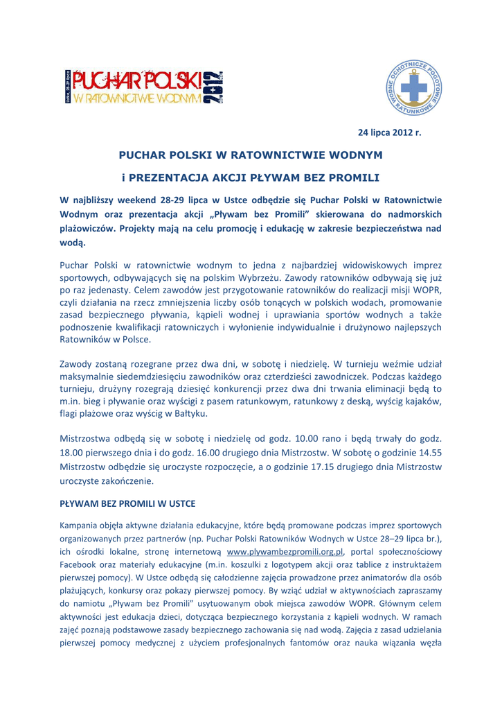 24 lipca 2012 r. PUCHAR POLSKI W RATOWNICTWIE WODNYM i PREZENTACJA AKCJI PŁYWAM BEZ PROMILI W najbliższy weekend 28-29 lipca w Ustce odbędzie się Puchar Polski w Ratownictwie Wodnym oraz prezentacja akcji „Pływam bez Promili” skierowana do nadmorskich plażowiczów. Projekty mają na celu promocję i edukację w zakresie bezpieczeństwa nad wodą. Puchar Polski w ratownictwie wodnym to jedna z najbardziej widowiskowych imprez sportowych, odbywających się na polskim Wybrzeżu. Zawody ratowników odbywają się już po raz jedenasty. Celem zawodów jest przygotowanie ratowników do realizacji misji WOPR, czyli działania na rzecz zmniejszenia liczby osób tonących w polskich wodach, promowanie zasad bezpiecznego pływania, kąpieli wodnej i uprawiania sportów wodnych a także podnoszenie kwalifikacji ratowniczych i wyłonienie indywidualnie i drużynowo najlepszych Ratowników w Polsce. Zawody zostaną rozegrane przez dwa dni, w sobotę i niedzielę. W turnieju weźmie udział maksymalnie siedemdziesięciu zawodników oraz czterdzieści zawodniczek. Podczas każdego turnieju, drużyny rozegrają dziesięć konkurencji przez dwa dni trwania eliminacji będą to m.in. bieg i pływanie oraz wyścigi z pasem ratunkowym, ratunkowy z deską, wyścig kajaków, flagi plażowe oraz wyścig w Bałtyku. Mistrzostwa odbędą się w sobotę i niedzielę od godz. 10.00 rano i będą trwały do godz. 18.00 pierwszego dnia i do godz. 16.00 drugiego dnia Mistrzostw. W sobotę o godzinie 14.55 Mistrzostw odbędzie się uroczyste rozpoczęcie, a o godzinie 17.15 drugiego dnia Mistrzostw uroczyste zakończenie. PŁYWAM BEZ PROMILI W USTCE Kampania objęła aktywne działania edukacyjne, które będą promowane podczas imprez sportowych organizowanych przez partnerów (np. Puchar Polski Ratowników Wodnych w Ustce 28–29 lipca br.), ich ośrodki lokalne, stronę internetową www.plywambezpromili.org.pl, portal społecznościowy Facebook oraz materiały edukacyjne (m.in. koszulki z logotypem akcji oraz tablice z instruktażem pierwszej pomocy). W Ustce odbędą się całodzienne zajęcia prowadzone przez animatorów dla osób plażujących, konkursy oraz pokazy pierwszej pomocy. By wziąć udział w aktywnościach zapraszamy do namiotu „Pływam bez Promili” usytuowanym obok miejsca zawodów WOPR. Głównym celem aktywności jest edukacja dzieci, dotycząca bezpiecznego korzystania z kąpieli wodnych. W ramach zajęć poznają podstawowe zasady bezpiecznego zachowania się nad wodą. Zajęcia z zasad udzielania pierwszej pomocy medycznej z użyciem profesjonalnych fantomów oraz nauka wiązania węzła ratowniczego. Młodzież będzie mogła poznać w praktyce zasady udzielania pierwszej pomocy. Każdy uczestnik otrzyma nagrodę, która będzie miłą wakacyjną pamiątką. W ramach kampanii, w nadmorskich kurortach, a także w miejscowościach położonych nad jeziorami i rzekami w całej Polsce rozwieszonych zostanie również kilka tysięcy plakatów informujących o zagrożeniach związanych z uprawianiem sportów wodnych po spożyciu alkoholu. Przestrzegamy: albo alkohol, albo pływanie. Od tej reguły nie może być wyjątków! - zaznacza Andrzej Szumowski, prezes PVA. Kampanię „Pływam bez promili” popierają i rekomendują: Paweł Korzeniowski (polski pływak, wielokrotny rekordzista i mistrz Polski, mistrz i wicemistrz świata, mistrz Europy, olimpijczyk), Przemysław Stańczyk (polski pływak, Mistrz Świata na 800m z Melbourne), Aleksandra Urbańczyk (polska pływaczka, medalistka Mistrzostw Europy), Katarzyna Baranowska (była polska pływaczka, mistrzyni Europy z Triestu i Helsinek), Sebastian Szczęsny (dziennikarz TVP Sport), Izabela Dylewska (była kajakarka, dwukrotna brązowa medalistka igrzysk olimpijskich, medalistka mistrzostw świata i Europy), Wojciech Kudlik (były kajakarz, medalista mistrzostw świata w kajakarstwie), lek. med. Włodzimierz Janda (Wojskowy Instytut Medyczny w Warszawie) oraz ks. Rafał Chwałkowski (kapelan żeglarzy, żeglarz, ratownik). Szczegóły dotyczące kampanii dostępne są na stronie www.plywambezpromili.org.pl TERMINARZ I MIEJSCE: 28 - 29 lipca, Ustka- plaża wschodnia, przy głównym wejściu. Więcej informacji udziela: KAROLINA KOWALSKA Rzecznik Prasowy WOPR tel. 500 466 188 [email protected] PARTNERZY PUCHARU POLSKI W RATOWNICTWIE WODNYM