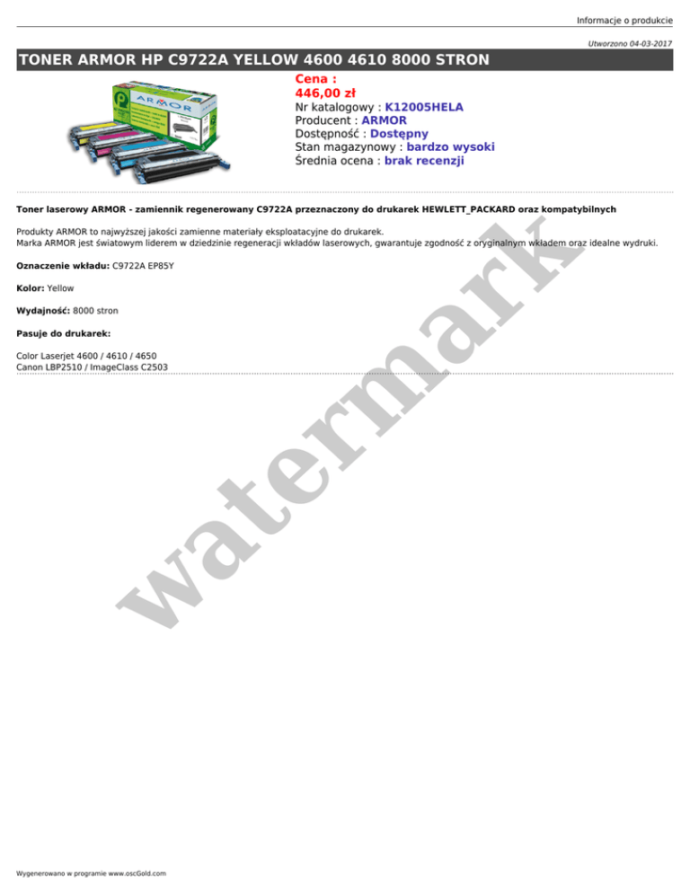 Informacje o produkcie Utworzono 04-03-2017 TONER ARMOR HP C9722A YELLOW 4600 4610 8000 STRON Cena : 446,00 zł Nr katalogowy : K12005HELA Producent : ARMOR Dostępność : Dostępny Stan magazynowy : bardzo wysoki Średnia ocena : brak recenzji Toner laserowy ARMOR - zamiennik regenerowany C9722A przeznaczony do drukarek HEWLETT_PACKARD oraz kompatybilnych Oznaczenie wkładu: C9722A EP85Y Kolor: Yellow Wydajność: 8000 stron Pasuje do drukarek: w at Color Laserjet 4600 / 4610 / 4650 Canon LBP2510 / ImageClass C2503 er m ar k Produkty ARMOR to najwyższej jakości zamienne materiały eksploatacyjne do drukarek. Marka ARMOR jest światowym liderem w dziedzinie regeneracji wkładów laserowych, gwarantuje zgodność z oryginalnym wkładem oraz idealne wydruki. Wygenerowano w programie www.oscGold.com