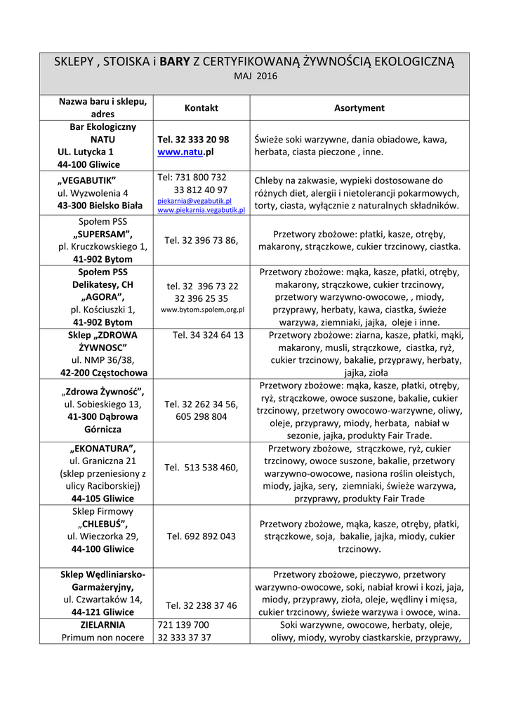 SKLEPY , STOISKA i BARY Z CERTYFIKOWANĄ ŻYWNOŚCIĄ EKOLOGICZNĄ MAJ 2016 Nazwa baru i sklepu, adres Bar Ekologiczny NATU UL. Lutycka 1 44-100 Gliwice „VEGABUTIK” ul. Wyzwolenia 4 43-300 Bielsko Biała Społem PSS „SUPERSAM”, pl. Kruczkowskiego 1, 41-902 Bytom Społem PSS Delikatesy, CH „AGORA”, pl. Kościuszki 1, 41-902 Bytom Sklep „ZDROWA ŻYWNOSC” ul. NMP 36/38, 42-200 Częstochowa „Zdrowa Żywność”, ul. Sobieskiego 13, 41-300 Dąbrowa Górnicza „EKONATURA”, ul. Graniczna 21 (sklep przeniesiony z ulicy Raciborskiej) 44-105 Gliwice Sklep Firmowy „CHLEBUŚ”, ul. Wieczorka 29, 44-100 Gliwice Sklep WędliniarskoGarmażeryjny, ul. Czwartaków 14, 44-121 Gliwice ZIELARNIA Primum non nocere Kontakt Asortyment Tel. 32 333 20 98 www.natu.pl Świeże soki warzywne, dania obiadowe, kawa, herbata, ciasta pieczone , inne. Tel: 731 800 732 33 812 40 97 Chleby na zakwasie, wypieki dostosowane do różnych diet, alergii i nietolerancji pokarmowych, torty, ciasta, wyłącznie z naturalnych składników. [email protected] www.piekarnia.vegabutik.pl Tel. 32 396 73 86, tel. 32 396 73 22 32 396 25 35 www.bytom.spolem,org.pl Tel. 34 324 64 13 Tel. 32 262 34 56, 605 298 804 Tel. 513 538 460, Przetwory zbożowe: płatki, kasze, otręby, makarony, strączkowe, cukier trzcinowy, ciastka. Przetwory zbożowe: mąka, kasze, płatki, otręby, makarony, strączkowe, cukier trzcinowy, przetwory warzywno-owocowe, , miody, przyprawy, herbaty, kawa, ciastka, świeże warzywa, ziemniaki, jajka, oleje i inne. Przetwory zbożowe: ziarna, kasze, płatki, mąki, makarony, musli, strączkowe, ciastka, ryż, cukier trzcinowy, bakalie, przyprawy, herbaty, jajka, zioła Przetwory zbożowe: mąka, kasze, płatki, otręby, ryż, strączkowe, owoce suszone, bakalie, cukier trzcinowy, przetwory owocowo-warzywne, oliwy, oleje, przyprawy, miody, herbata, nabiał w sezonie, jajka, produkty Fair Trade. Przetwory zbożowe, strączkowe, ryż, cukier trzcinowy, owoce suszone, bakalie, przetwory warzywno-owocowe, nasiona roślin oleistych, miody, jajka, sery, ziemniaki, świeże warzywa, przyprawy, produkty Fair Trade Tel. 692 892 043 Przetwory zbożowe, mąka, kasze, otręby, płatki, strączkowe, soja, bakalie, jajka, miody, cukier trzcinowy. Tel. 32 238 37 46 Przetwory zbożowe, pieczywo, przetwory warzywno-owocowe, soki, nabiał krowi i kozi, jaja, miody, przyprawy, zioła, oleje, wędliny i mięsa, cukier trzcinowy, świeże warzywa i owoce, wina. Soki warzywne, owocowe, herbaty, oleje, oliwy, miody, wyroby ciastkarskie, przyprawy, 721 139 700 32 333 37 37 Bytomska 8 44-100 Gliwice „AMARENA” Ul. Bytomska 10 44-100 Gliwice „EKO-MADZIA” Ekologiczny sklep, ul. Jasna 40 (wejście od ul. Żwirki i Wigury), 44-122 Gliwice EKO-DELIKATESY U Biernackich Ul. Zubrzyckiego 18 44-100 Gliwice „WEGA”, ul. Raciborska 1, 44-100 Gliwice „EKO-SPIŻARNIA” Zdrowa Żywność UL. Raciborska 11A 44-100 Gliwice „SMAKI NATURY” ul. Górnych Wałów 18/1 44-100 Gliwice „KRETA 24” Ul. Dworcowa 62 44-100 Gliwice „EKOFIT24” Ul. Dworcowa 40 44-100 Gliwice NATU kosmetyki. 881 258 769 Przetwory zbożowe: różne mąki, kasze, płatki zbożowe, otręby, pieczywo, strączkowe, ryż, cukier trzcinowy, bakalie, oleje, oliwy, miody, przyprawy, herbaty, kawa, świeże warzywa, przetwory warzywne, owocowe słodycze, produkty Fair Trade Przetwory zbożowe: mąka, płatki, otręby, kasze, makarony, pieczywo, ryż, strączkowe, nabiał, Tel. 601 504 456 bakalie, przyprawy, jaja, oliwy, oleje, miody, mail: cukier trzcinowy, kakao, produkty Fair Trade, [email protected] kremy, świeże warzywa, ziemniaki, produkty dla dzieci. Przetwory zbożowe, strączkowe, ryż, przetwory warzywne, owocowe, świeże warzywa, owoce, Tel.32 399 15 35 miody, oleje, oliwy, herbaty, kawa, cukier www.ubiernackich.pl trzcinowy, nabiał, pieczywo, produkty Fair Trade, facebook.com/ubiernackich kosmetyki, inne. Sprzedaż internetowa Przetwory zbożowe: mąka, kasze, płatki, otręby, makarony, ryż, strączkowe, nasiona roślin Tel. 32 232 02 21 oleistych, przetwory warzywno-owocowe, miody, www.organicmarcet.pl l jajka, świeże warzywa, owoce, ziemniaki, oleje, oliwy, herbaty, kawa, produkty Fair Trade, produkty dla dzieci, kosmetyki, środki czystości. Przetwory zbożowe: mąka, kasze, płatki, otręby, Tel 513 012 858 ziarna, makarony, pieczywo, ryż, strączkowe, 518 596 236 www.ekospizarnia.com. przetwory owocowo-warzywne, bakalie, miody, ekospizarnia@ekozpizarnia. suszone owoce, herbata, kawa, jajka, warzywa, ziemniaki, przyprawy, oleje, oliwy, produkty Fair com.p Trade, Demeter Przetwory zbożowe: mąka, ziarna, płatki, kasze, makarony, przetwory owocowo-warzywne, nabiał 514 467 679 w sezonie, jajka, herbaty, kawa, przyprawy, oleje, 505 935 509 świeże ziemniaki, warzywa , owoce, produkty Fair [email protected] Trade, drób ekologiczny, kosmetyki, środki czystości. 32 231 55 80 Prosto z Krety; www.kreta24.pl oliwa z oliwek , niektóre zioła, przyprawy, miody, [email protected] herbaty, inne www.sklep-amarena.pl [email protected] 692 991 655 509 220 444 www.ekofit24.pl mail: [email protected] Tel. 32 333 20 98 Przetwory zbożowe: mąka, kasze. płatki, otręby, przetwory warzywne, owocowe, świeże warzywa, owoce, ziemniaki, miody, nabiał, inne. Sprzedaż internetow Przetwory zbożowe: mąka, kasze, płatki, otręby, Sklep Ekologiczny Ul. Lutycka 1 44-100 Gliwice www.natu.pl „SMAK NATURY” ul. Żabińskiego 55B/2 Tel. 784 440 074 os. Waryńskiego 44-100 Gliwice „ ECO ROSE „ ul. Paderewskiego Tel. 32 231 70 49 [email protected] 106B 44-105 Gliwice „ZDROWY ZAKĄTEK „ Tel. 883 676 687 ul. Nowy Świat 5 (wejście od ul. Sobótki) 44-100 Gliwice „SMAK NATURY” ul. Józefowska 87, 40-145 Katowice „SMAK NATURY” Ul. Gen Jankego 137 40-617 Katowice „BOCIAN” Żywność Ekologiczna, ul. Sikorskiego 18, 40-282 Katowice Sklep Ekologiczny „NATU”, ul. Powstańców 10, 40-040 Katowice Eko Smak – Sklep ze Zdrową Żywno