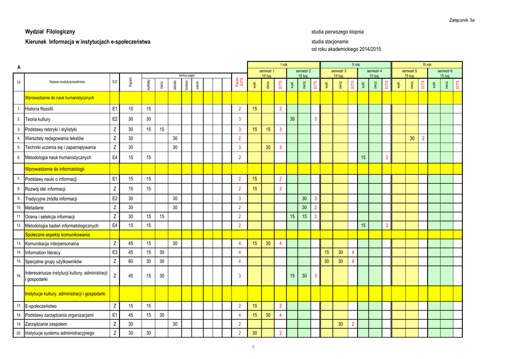 Załącznik 3a Wydział Filologiczny studia pierwszego stopnia Kierunek Informacja w instytucjach e-społeczeństwa studia stacjonarne od roku akademickiego 2014/2015 30 2 30 30 3 6. Metodologia nauk humanistycznych E4 15 15 2 3 30 15 15 3 30 3 30 2 3 15 2 15 2 Wprowadzenie do informatologii 7. Podstawy nauki o informacji E1 15 15 2 15 2 8. Rozwój idei informacji Z 15 15 2 15 2 9. Tradycyjne źródła informacji E2 30 30 3 30 3 10. Metadane Z 30 30 2 30 2 11. Ocena i selekcja informacji Z 30 15 15 2 12. Metodologia badań informatologicznych E4 15 15 15 2 15 2 Społeczne aspekty komunikowania 13. Komunikacja interpersonalna Z 45 15 30 4 15 30 4 14. Information literacy E3 45 15 30 4 15 30 4 15. Specjalne grupy użytkowników Z 60 30 30 4 30 30 4 16. Interesariusze instytucji kultury, administracji i gospodarki Z 45 15 30 3 30 2 15 30 3 Instytucje kultury, administracji i gospodarki 17. E-społeczeństwo Z 15 15 18. Podstawy zarządzania organizacjami E1 45 15 19. Zarządzanie zespołem Z 30 20. Instytucje systemu administracyjnego Z 30 30 30 30 2 15 4 15 2 30 4 2 2 30 1 2 ECTS 30 Z 15 2 ćwicz. Z Techniki uczenia się i zapamiętywania Wprowadzenie do nauk humanistycznych wykł. Warsztaty redagowania tekstów 5. ECTS 4. semestr 6 15 tyg. ćwicz. 15 wykł. 30 semestr 5 15 tyg. ECTS Z wykł. Podstawy retoryki i stylistyki semestr 4 15 tyg. ECTS 3. ćwicz. 3 wykł. 30 III rok semestr 3 15 tyg. ECTS 30 ćwicz. E2 wykł. Teoria kultury semestr 2 15 tyg. ECTS wykł. 2. ćwicz. Razem ECTS 15 semin. 2 konwer. 15 labolat. 15 ćwicz. E1 wykłady Historia filozofii Nazwa modułu/przedmiotu Razem 1. Lp E/Z forma zajęć II rok semestr 1 15 tyg. ćwicz. I rok A Załącznik 3a 21. Organizacja pracy instytucji kultury Z 30 30 2 30 2 22. Archiwa i repozytoria w instytucjach kultury, administracji i gospodarki Z 30 30 2 23. PR w kulturze, administracji i gospodarce Z 30 30 2 Z 15 15 1 15 1 15 1 15 1 30 2 30 2 Prawne i administracyjne konteksty komunikacji 24. Ochrona własności intelektualnej i przemysłowej 25. Ochrona danych osobowych w kulturze, administracji i biznesie Z 15 26. Bezpieczeństwo e-informacji E3 30 27. E-government, informacja publiczna i prawna Z 30 30 2 28. Elektroniczny obieg dokumentów Z 30 30 2 30 2 29. Przechowywanie i konserwacja dokumentów tradycyjnych i cyfrowych Z 30 30 2 30 2 30 2 H/S/T 30 2 30 2 30 2 Zarządzanie informacją 30. Systemy informacyjne Z 45 15 30 3 15 30 3 31. Systemy organizacji wiedzy E5 45 15 30 3 15 30 3 32. Informacja biznesowa Z 30 30 2 30 2 33. Informacja archiwalna Z 30 30 2 30 2 1 15 1 Wykorzystanie technologii informacyjnych 34. Media społecznościowe Z 15 35. Efektywne wyszukiwanie informacji Z 30 30 2 36. Infobrokerstwo Z 15 15 1 15 1 37. Projektowanie i tworzenie baz danych Z 30 30 3 30 3 38. Projektowanie i tworzenie serwisów internetowych Z 30 30 3 39. Warsztaty cyfrowych źródeł informacji Z 30 30 3 Digitalizacja zasobów informacyjnych Z 30 30 2 40. 15 30 2 30 30 2 3 3 Załącznik 3a 41. Terminologia w języku angielskim Z 30 30 3 42. Terminologia w języku niemieckim/rosyjskim Z 30 30 3 43. Seminarium licencjackie E6 45 1275 RAZEM A: B 45 330 255 585 60 45 30 3 20 0 0 0 120 135 165 28 60 135 16 45 150 15 Moduły opcjonalne* Elementy metodologii nauki semestr 2 120 120 12 12 2.1 Elementy statystyki Z 30 30 30 3 2.2 Elementy logiki Z 30 30 30 3 2.3 Naukoznawstwo i klasyfikacja wiedzy Z 30 30 30 3 2.4 Metody i techniki badań w naukach społecznych Z 30 30 30 3 2.5 Analiza i interpretacja tekstów kultury Z 30 30 30 3 Systemy informacji dla edukacji, kultury i nauki - semestr 3 3.1 Systemy biblioteczne 3.2 Systemy informacji edukacyjnej w Polsce na świecie 3.3 120 120 12 12 Z 30 30 30 3 Z 30 30 30 3 Serwisy bibliograficzne Z 30 30 30 3 3.4 Kolekcje cyfrowe dla nauki i edukacji Z 30 30 30 3 3.5 Kolekcje cyfrowe dla kultury medialnej 30 30 30 3 i 3 60 165 18 30 15 9 150 21 0 30 3 30 11 180 22 Załącznik 3a 75 Dystrybucja informacji - semestr 4 75 10 10 4.1 Ośrodki informacji branżowej i naukowej Z 15 15 15 2 4.2 Organizacja działalności informacyjnej Z 15 15 15 2 4.3 Informacja dziedzinowa Z 15 15 15 2 4.4 Rynek usług informacyjnych Z 15 15 15 2 4.5 Systemy kierowania informacją globalną Z 15 15 15 2 4.6 Rynek publikacji elektronicznych Z 15 15 15 2 90 Komunikacja literacka - semestr 5 90 9 9 5.1 Literatura powszechna Z 30 30 30 3 5.2 Piśmiennictwo polskie Z 30 30 30 3 5.3 Piśmiennictwo regionalne Z 30 30 30 3 5.4 Literatura dla dzieci i młodzieży Z 30 30 30 3 Technologie komputerowe w edytorstwie semestr 6 90 90 8 8 6.1 Zagadnienia wydawnicze i warsztat edytorski Z 45 45 45 4 6.2 Projektowanie produktu cyfrowego Z 45 45 45 4 6.3 Warsztaty DTP Z 45 45 45 4 RAZEM B: 495 120 150 375 0 0 0 0 0 0 51 * Student dokonuje wyboru modułów w ramach przydzielonej mu do dyspozycji w danym semestrze liczby punktów ECTS 4 0 120 12 120 12 75 10 90 9 90 8 Załącznik 3a RAZEM SEMESTRY (A+B+C) 0 0 9 585 180 45 0 0 0 180 0 30 330 2 30 30 345 2 30 0 60 3 375 wykł. wykł. wykł. 0 30 0 30 2 330 30 ECTS 0 ćwicz. 0 1 2 wykł. 285 120 30 30 ECTS 330 0 2 ćwicz. 1 920 1 30 semestr 6 15 tyg. wykł. 30 2 semestr 5 15 tyg. ECTS 0 30 ECTS 150 wykł. Razem ECTS semin. 30 2 semestr 4 15 tyg. ćwicz. 30 RAZEM D: 30 ECTS Wychowanie fizyczne 8 III rok semestr 3 15 tyg. ćwicz. 2 120 ECTS Język obcy semestr 2 15 tyg. ćwicz. 120 1 konwer. labolat. ćwicz. E/Z wykłady Nazwa modułu/przedmiotu Razem Lp forma zajęć II rok semestr 1 15 tyg. ćwicz. I rok C INNE WYMAGANIA 0 0 0 0 0 0 270 30 270 1 920 OGÓŁEM Studia kończą się nadaniem tytułu zawodowego licencjata na kierunku …………….…………………. Informacja w instytucjach e-społeczeństwa Plan studiów zatwierdzony przez Radę Wydziału w dniu ………....…… Otrzymują: 1. Dział Kształcenia 2. Instytut 3. Dziekanat ..................................................................... (pieczęć i podpis Dyrektora Instytutu) 5 .....................................................