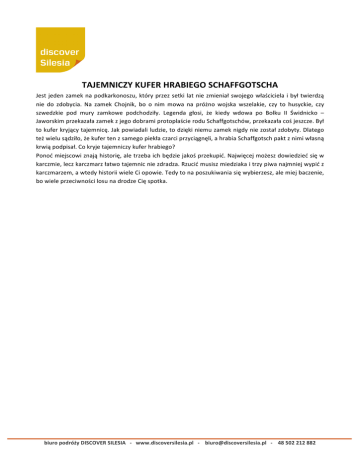 TAJEMNICZY KUFER HRABIEGO SCHAFFGOTSCHA Jest jeden zamek na podkarkonoszu, który przez setki lat nie zmieniał swojego właściciela i był twierdzą nie do zdobycia. Na zamek Chojnik, bo o nim mowa na próżno wojska wszelakie, czy to husyckie, czy szwedzkie pod mury zamkowe podchodziły. Legenda głosi, że kiedy wdowa po Bolku II Świdnicko – Jaworskim przekazała zamek z jego dobrami protoplaście rodu Schaffgotschów, przekazała coś jeszcze. Był to kufer kryjący tajemnicę. Jak powiadali ludzie, to dzięki niemu zamek nigdy nie został zdobyty. Dlatego też wielu sądziło, że kufer ten z samego piekła czarci przyciągnęli, a hrabia Schaffgotsch pakt z nimi własną krwią podpisał. Co kryje tajemniczy kufer hrabiego? Ponoć miejscowi znają historię, ale trzeba ich będzie jakoś przekupić. Najwięcej możesz dowiedzieć się w karczmie, lecz karczmarz łatwo tajemnic nie zdradza. Rzucić musisz miedziaka i trzy piwa najmniej wypić z karczmarzem, a wtedy historii wiele Ci opowie. Tedy to na poszukiwania się wybierzesz, ale miej baczenie, bo wiele przeciwności losu na drodze Cię spotka. biuro podróży DISCOVER SILESIA -‐ www.discoversilesia.pl -‐ [email protected] -‐ 48 502 212 882