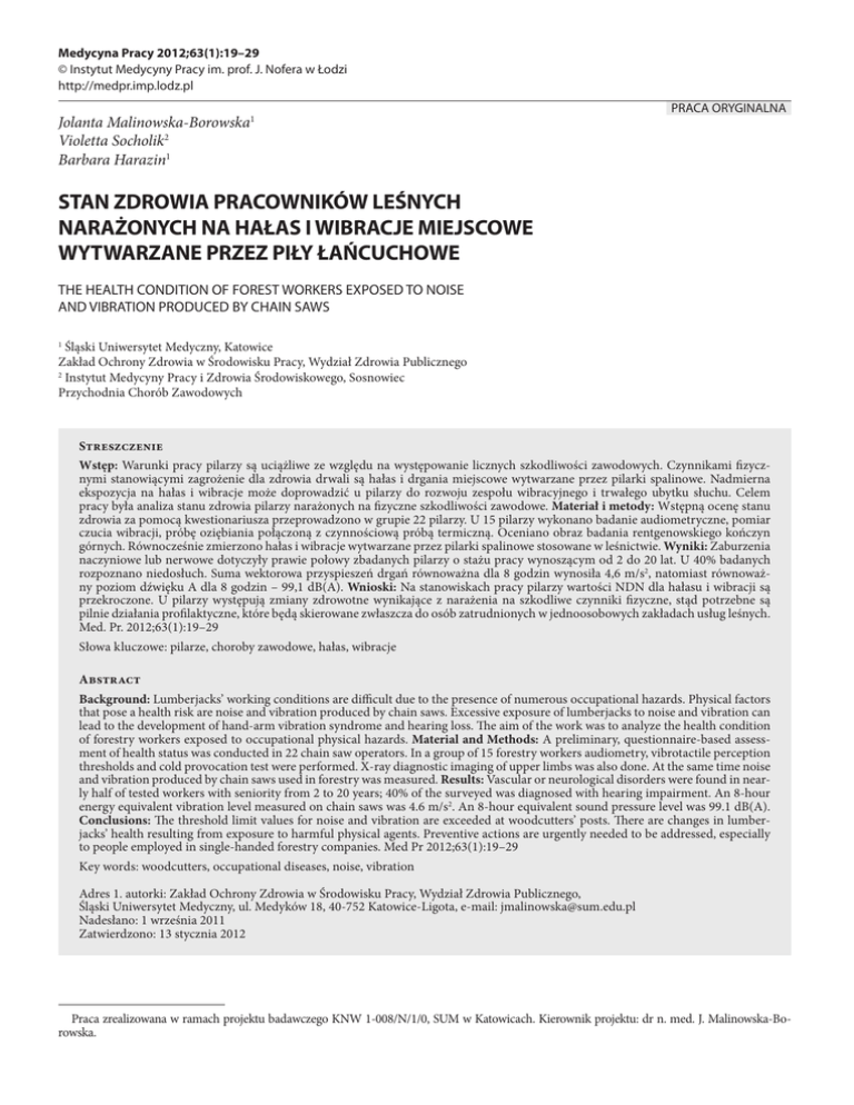 Medycyna Pracy 2012;63(1):19–29 © Instytut Medycyny Pracy im. prof. J. Nofera w Łodzi http://medpr.imp.lodz.pl Jolanta Malinowska-Borowska1 Violetta Socholik2 Barbara Harazin1 PRACA ORYGINALNA STAN ZDROWIA PRACOWNIKÓW LEŚNYCH NARAŻONYCH NA HAŁAS I WIBRACJE MIEJSCOWE WYTWARZANE PRZEZ PIŁY ŁAŃCUCHOWE THE HEALTH CONDITION OF FOREST WORKERS EXPOSED TO NOISE AND VIBRATION PRODUCED BY CHAIN SAWS Śląski Uniwersytet Medyczny, Katowice Zakład Ochrony Zdrowia w Środowisku Pracy, Wydział Zdrowia Publicznego 2 Instytut Medycyny Pracy i Zdrowia Środowiskowego, Sosnowiec Przychodnia Chorób Zawodowych 1 Streszczenie Wstęp: Warunki pracy pilarzy są uciążliwe ze względu na występowanie licznych szkodliwości zawodowych. Czynnikami fizycznymi stanowiącymi zagrożenie dla zdrowia drwali są hałas i drgania miejscowe wytwarzane przez pilarki spalinowe. Nadmierna ekspozycja na hałas i wibracje może doprowadzić u pilarzy do rozwoju zespołu wibracyjnego i trwałego ubytku słuchu. Celem pracy była analiza stanu zdrowia pilarzy narażonych na fizyczne szkodliwości zawodowe. Materiał i metody: Wstępną ocenę stanu zdrowia za pomocą kwestionariusza przeprowadzono w grupie 22 pilarzy. U 15 pilarzy wykonano badanie audiometryczne, pomiar czucia wibracji, próbę oziębiania połączoną z czynnościową próbą termiczną. Oceniano obraz badania rentgenowskiego kończyn górnych. Równocześnie zmierzono hałas i wibracje wytwarzane przez pilarki spalinowe stosowane w leśnictwie. Wyniki: Zaburzenia naczyniowe lub nerwowe dotyczyły prawie połowy zbadanych pilarzy o stażu pracy wynoszącym od 2 do 20 lat. U 40% badanych rozpoznano niedosłuch. Suma wektorowa przyspieszeń drgań równoważna dla 8 godzin wynosiła 4,6 m/s2, natomiast równoważny poziom dźwięku A dla 8 godzin – 99,1 dB(A). Wnioski: Na stanowiskach pracy pilarzy wartości NDN dla hałasu i wibracji są przekroczone. U pilarzy występują zmiany zdrowotne wynikające z narażenia na szkodliwe czynniki fizyczne, stąd potrzebne są pilnie działania profilaktyczne, które będą skierowane zwłaszcza do osób zatrudnionych w jednoosobowych zakładach usług leśnych. Med. Pr. 2012;63(1):19–29 Słowa kluczowe: pilarze, choroby zawodowe, hałas, wibracje Abstract Background: Lumberjacks’ working conditions are difficult due to the presence of numerous occupational hazards. Physical factors that pose a health risk are noise and vibration produced by chain saws. Excessive exposure of lumberjacks to noise and vibration can lead to the development of hand-arm vibration syndrome and hearing loss. The aim of the work was to analyze the health condition of forestry workers exposed to occupational physical hazards. Material and Methods: A preliminary, questionnaire-based assessment of health status was conducted in 22 chain saw operators. In a group of 15 forestry workers audiometry, vibrotactile perception thresholds and cold provocation test were performed. X-ray diagnostic imaging of upper limbs was also done. At the same time noise and vibration produced by chain saws used in forestry was measured. Results: Vascular or neurological disorders were found in nearly half of tested workers with seniority from 2 to 20 years; 40% of the surveyed was diagnosed with hearing impairment. An 8-hour energy equivalent vibration level measured on chain saws was 4.6 m/s2. An 8-hour equivalent sound pressure level was 99.1 dB(A). Conclusions: The threshold limit values for noise and vibration are exceeded at woodcutters’ posts. There are changes in lumberjacks’ health resulting from exposure to harmful physical agents. Preventive actions are urgently needed to be addressed, especially to people employed in single-handed forestry companies. Med Pr 2012;63(1):19–29 Key words: woodcutters, occupational diseases, noise, vibration Adres 1. autorki: Zakład Ochrony Zdrowia w Środowisku Pracy, Wydział Zdrowia Publicznego, Śląski Uniwersytet Medyczny, ul. Medyków 18, 40-752 Katowice-Ligota, e-mail: [email protected] Nadesłano: 1 września 2011 Zatwierdzono: 13 stycznia 2012 Praca zrealizowana w ramach projektu badawczego KNW 1-008/N/1/0, SUM w Katowicach. Kierownik projektu: dr n. med. J. Malinowska-Borowska. 20 J. Malinowska-Borowska i wsp. WSTĘP Warunki pracy pilarzy są uciążliwe ze względu na występowanie licznych szkodliwości zawodowych. Czynnikami fizycznymi stanowiącymi zagrożenie dla zdrowia drwali są hałas i drgania miejscowe wytwarzane przez pilarki spalinowe (1). Także maszyny i pojazdy wykorzystywane w leśnictwie stanowią źródło hałasu i ogólnych drgań mechanicznych. Do grupy szkodliwych czynników chemicznych na stanowiskach pracy pilarzy należą gazy spalinowe emitowane przez pilarki, benzyna, smary do pilarek oraz środki ochrony roślin stosowane w hodowli lasu (2). Istotną uciążliwością na stanowisku pilarza są zmienne warunki pogodowe. Zimą pozyskiwanie drewna wiąże się z pracą w narażeniu na chłód. Latem, od maja do września, pojawia się zagrożenie czynnikami biologicznymi, których źródłem są kleszcze (3). Zainfekowane pajęczaki przenoszą w czasie ukąszenia wirusy zapalenia opon mózgowo-rdzeniowych i mózgu, a także bakterie wywołujące boreliozę. Wykonywanie powtarzalnych czynności oraz podnoszenie i noszenie ciężkich urządzeń i klocków drewna może powodować dolegliwości bólowe, które wynikają z przeciążenia układu mięśniowo-szkieletowego (4). Pozyskiwanie drewna odbywa się bowiem w pozycjach ciała powodujących statyczne obciążenie mięśni przykręgosłupowych oraz mięśni obręczy barkowej i biodrowej. Podczas ścinki, przerzynki i okrzesywania obciążone są także mięśnie kończyn górnych i dolnych. Duże ryzyko urazów i wypadków przy pracy dodatkowo pogarszają trudne warunki pracy pilarzy. Najczęściej urazom ulegają kończyny dolne (46%) i górne (32%), a ponad połowa wypadków ma charakter ciężki (5,6). Z fizjologic