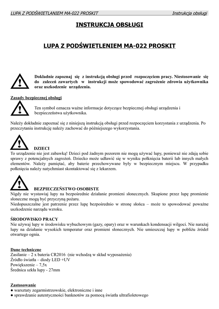 LUPA Z PODŚWIETLANIEM MA-022 PROSKIT Instrukcja obsługi INSTRUKCJA OBSŁUGI LUPA Z PODŚWIETLENIEM MA-022 PROSKIT Dokładnie zapoznaj się z instrukcją obsługi przed rozpoczęciem pracy. Niestosowanie się do zaleceń zawartych w instrukcji może spowodować zagrożenie zdrowia użytkownika oraz uszkodzenie urządzenia. Zasady bezpiecznej obsługi Ten symbol oznacza ważne informacje dotyczące bezpiecznej obsługi urządzenia i bezpieczeństwa użytkownika. Należy dokładnie zapoznać się z niniejszą instrukcją obsługi przed rozpoczęciem korzystania z urządzenia. Po przeczytaniu instrukcję należy zachować do późniejszego wykorzystania. DZIECI To urządzenie nie jest zabawką! Dzieci pod żadnym pozorem nie mogą używać lupy, ponieważ nie zdają sobie sprawy z potencjalnych zagrożeń. Dziecko może udławić się w wyniku połknięcia baterii lub innych małych elementów. Należy pamiętać, aby baterie przechowywane były w bezpiecznym miejscu. W przypadku połknięcia należy natychmiast skontaktować się z lekarzem. BEZPIECZEŃSTWO OSOBISTE Nigdy nie wystawiaj lupy na bezpośrednie działanie promieni słonecznych. Skupione przez lupę promienie słoneczne mogą być przyczyną pożaru. Niedopuszczalne jest patrzenie przez lupę bezpośrednio w stronę słońca – może to spowodować poważne uszkodzenie narządu wzroku. ŚRODOWISKO PRACY Nie używaj lupy w środowisku wybuchowym (gazy, opary) oraz w warunkach kondensacji wilgoci. Nie narażaj lupy na działanie wysokich temperatur oraz promieni słonecznych. Nie umieszczaj lupy w pobliżu źródeł otwartego ognia. Dane techniczne Zasilanie – 2 x bateria CR2016 (nie wchodzą w skład wyposażenia) Źródło światła – diody LED +UV Powiększenie – 7,5x Średnica szkła lupy - 27mm Zastosowanie ● warsztaty zegarmistrzowskie, elektroniczne i inne ● sprawdzanie autentyczności banknotów za pomocą światła ultrafioletowego LUPA Z PODŚWIETLANIEM MA-022 PROSKIT Instrukcja obsługi Budowa Obsługa Instalacja baterii 1. Delikatnie pociągnij za blokadę pokrywy baterii i odchyl zasobnik na dwie baterie CR2016. 2. Zamontuj nowe baterie typu CR2016. 3. Zamknij pokrywę baterii. W celu włączenia podświetlenia obszaru roboczego wciśnij włącznik zasilania, a następnie przełącznikiem wyboru źródła światła ustaw podświetlanie za pomocą diody LED (w przypadku precyzyjnych prac zegarmistrzowskich lub elektronicznych) bądź UV (do sprawdzania autentyczności banknotów). Nie wyrzucać zużytych baterii do niesegregowanych śmieci! Po upływie okresu użytkowania baterie, w które wyposażony był produkt, nie mogą zostać usunięte wraz z innymi odpadami pochodzącymi z gospodarstw domowych. Jeśli baterie nie zostaną poprawnie zutylizowane, substancje niebezpieczne mogą powodować zagrożenie dla zdrowia ludzkiego lub środowiska naturalnego. Aby chronić zasoby naturalne i promować ponowne wykorzystanie materiałów, należy oddzielać baterie od innego typu odpadów i poddawać je utylizacji poprzez lokalny, bezpłatny system zwrotu baterii. Baterie należy oddzielić od sprzętu. Baterie należy usuwać zgodnie z zasadami utylizacji niebezpiecznych odpadów elektronicznych. Prawidłowe usuwanie urządzenia Oznaczenie umieszczone na produkcie lub w odnoszących się do niego tekstach wskazuje, że produktu po upływie okresu użytkowania nie należy usuwać z innymi odpadami pochodzącymi z gospodarstw domowych. Aby uniknąć szkodliwego wpływu na środowisko naturalne i zdrowie ludzi wskutek niekontrolowanego usuwania odpadów, prosimy o oddzielenie produktu od innego typu odpadów oraz odpowiedzialny recykling w celu promowania ponownego użycia zasobów materialnych jako stałej praktyki. W celu uzyskania informacji na temat miejsca i sposobu bezpiecznego dla środowiska recyklingu tego produktu użytkownicy w gospodarstwach domowych powinni skontaktować się z punktem sprzedaży detalicznej, w którym dokonali zakupu lub z organem władz lokalnych. Użytkownicy w firmach powinni skontaktować się ze swoim dostawcą i sprawdzić warunki umowy zakupu. Produktu nie należy usuwać razem z innymi odpadami komercyjnymi.