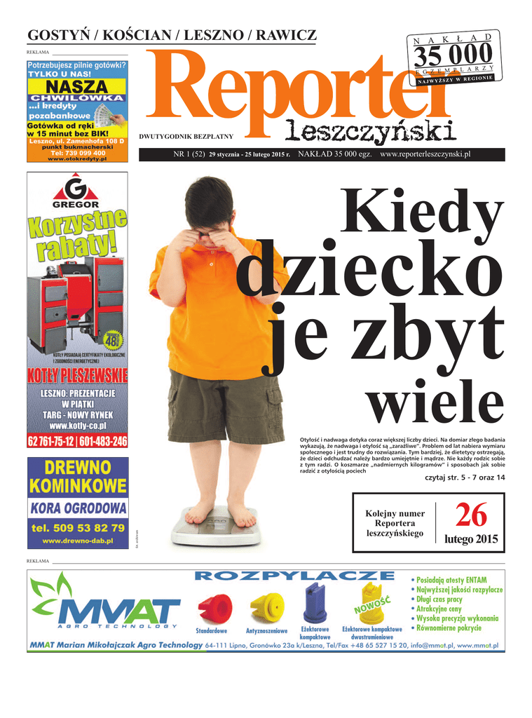 GOSTYŃ / KOŚCIAN / LESZNO / RAWICZ REKLAMA Kiedy dziecko je zbyt DWUTYGODNIK BEZPŁATNY NR 1 (52) 29 stycznia - 25 lutego 2015 r. NAKŁAD 35 000 egz. www.reporterleszczynski.pl wiele Otyłość i nadwaga dotyka coraz większej liczby dzieci. Na domiar złego badania wykazują, że nadwaga i otyłość są „zaraźliwe”. Problem od lat nabiera wymiaru społecznego i jest trudny do rozwiązania. Tym bardziej, że dietetycy ostrzegają, że dzieci odchudzać należy bardzo umiejętnie i mądrze. Nie każdy rodzic sobie z tym radzi. O koszmarze „nadmiernych kilogramów” i sposobach jak sobie radzić z otyłością pociech 26 fot. archiwum czytaj str. 5 - 7 oraz 14 REKLAMA Kolejny numer Reportera leszczyńskiego lutego 2015 Mały rozpylacz, duży efekt 2 Nr 1 (52) 29 stycznia - 25 lutego 2015 r. PROMOCJA 35 000 EGZEMPLARZY Rozmowa z Marianem Mikołajczakiem, właścicielem firmy MMAT Marian Mikołajczak Agro Technology z Gronówka k/ Leszna, czołowego polskiego producenta rozpylaczy płaskostrumieniowych do ochrony upraw polowych Firma MMAT Marian Mikołajczak Agro Technology bez kompleksów REKLAMA konkuruje z największymi światowymi liderami tej branży. Nasze produkty w niczym nie ustępują światowym liderom, czego potwierdzeniem są posiadane atesty. Zajmujemy się produkcją rozpylaczy od 20 lat. To wystarczająco dużo czasu, aby nabyć odpowiednią wiedzę i doświadczenie. Przez wiele lat działaliśmy pod marką „Polskie Rozpylacze Szczelinowe” lecz z uwagi na sprzedaż naszych rozpylaczy za granicę zmieniliśmy nazwę na MMAT Marian Mikołajczak Agro Technology. Taką marką oznaczamy wszystkie nasze wyroby. Niedawno opatentowaliśmy nasze logo i nazwę handlową, ponieważ zdarzały się próby podrabiania naszych produktów. To dobitnie świadczy o wysokiej pozycji firmy na rynku. Jakie są wasze atuty? Jak Pan już wspomniał wcześniej, w rolnictwie dużą rolę zaczynają odgrywać szczegóły. Obserwujemy to również w naszej branży. Rozpylacze to wyroby niezwykle precyzyjne, wymagające wręcz laboratoryjnej staranności wykonania. Decydują nie milimetry, ale tysięczne części milimetra. Naszym atutem jest wysoka jakość i powtarzalność produktów, które nie- ustannie kontrolujemy w procesie produkcyjnym, dostępność, a także atrakcyjne ceny. Wszystkie zaprojektowane i wyprodukowane przez nas rozpylacze muszą spełniać wymagane w normach parametry. Sami sprawdzacie te parametry? Oczywiście na bieżąco kontrolujemy jakość produkcji, ale nasze rozpylacze poddajemy też ocenie wyspecjalizowanych, niezależnych instytucji badawczych. Rozpylacze MMAT były badane między innymi w Instytucie Budownictwa Mechanizacji i Elektryfikacji Rolnictwa w Warszawie przez Przemysłowy Instytut Maszyn Rolniczych w Poznaniu, a także przez niemiecki Julius Kuhn Institute w Braunschweigu. Mamy liczne certyfikaty, w tym Europejski Certyfikat ENTAM obowiązujący w kilkunastu krajach europejskich, z czego jesteśmy szczególnie dumni. To rozpylacze z tworzywa sztucznego, a więc szybko się zużywają? To powszechna opinia niezgodna z prawdą. Do produkcji używamy wysokiej jakości odpornego na ścieranie polimeru. Jest to tworzywo bardziej odporne od stali nierdzewnej. Trwałość naszych rozpylaczy bada- na była w Polsce i w Niemczech, a przeprowadzone badania wykazały, że rozpylacze MMAT zapewniają najwyższe parametry oprysku na obszarze do 2000 hektarów, zachowując parametry odpowiadające światowym normom. W ofercie dostępne są wszystkie rodzaje rozpylaczy płaskostrumieniowych: standardowe, antyznoszeniowe, eżektorowe, eżektorowe kompaktowe jedno- i dwustrumieniowe oraz eżektorowe jednoi dwustrumieniowe ceramiczne. Dobór rodzaju rozpylacza zależy między innymi od warunków pogodowych, w jakich wykonywany będzie oprysk. Antyznoszeniowe i eżektorowe można używać podczas trudnych warunków pogodowych, na które istotny wpływ ma prędkość wiatru, temperatura i wilgotność powietrza. Nawet w trudnych warunkach pogodowych gwarantują skuteczny i efektywny oprysk. Szczególną uwagę chciałbym zwrócić na rozpylacze kompaktowe eżektorowe dwustrumieniowe, których cechą jest 50% redukcja znoszenia, bardzo dobra penetracja łanu oraz bardzo dobre boczne pokrycie powierzchni roślin. Kolory rozpylaczy informują o wy- fot. Jan Borowiak Polskie rolnictwo osiągnęło poziom, na którym o sukcesie decyduje wiedza i szczegóły. Przykładem jest mały, wykonany z wysokiej jakości tworzyw sztucznych rozpylacz w opryskiwaczu. Od niego zależy nie tylko efekt ekonomiczny rolnika, ale także jego i konsumentów zdrowie. W każdym współczesnym gospodarstwie rolnym jednym z najważniejszych urządzeń polowych jest opryskiwacz, a jedną z najważniejszych części opryskiwacza jest właśnie rozpylacz. To rozpylacz ma duży wpływ na dobrej jakości i precyzyjny oprysk decydujący nie tylko o dobrych plonach, ale także o tym, czy na nasze stoły trafi zdrowa żywność. Dlatego bardzo ważny jest odpowiedni dobór rozpylaczy do upraw i występujących podczas oprysków warunków pogodowych. Coraz więcej rolników przekonuje się o tym i poszukuje wyrobów niezawodnych i wysokiej jakości. Co nas bardzo cieszy, coraz częściej decydują się oni na zakup naszych rozpylaczy płaskostrumieniowych. Powodem tego zainteresowania jest wysoka jakość produktów, szeroka oferta handlowa i atrakcyjne ceny. Firma M. Mikołajczaka produkuje jedne z najlepszych rozpylaczy na rynku datku poszczególnego rozpylacza, czyli o ilości cieczy jaka jest podawana prze rozpylacz w ciągu minuty przy ciśnieniu 3 barów. Dla użytkownika to bardzo ważna informacja. Kolory rozpylaczy są znormalizowane według normy visi flow i obowiązują na całym świecie. PROMOCJA 3 Węgiel na gwiazdkę? Przedsiębiorcy apelują: nie tędy droga 35 000 EGZEMPLARZY Nr 1 (52) 29 stycznia - 25 lutego 2015 r. Minister środowiska tuż przed świętami zatwierdził dokumentacj