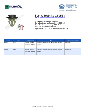 Spinka błotnika C60568 Link: http://www.romix.pl/spinka-blotnika-c60568-p1542.html Nr katalogowy Romix: C60568 Cena brutto za opakowanie: 12,50 PLN Cena brutto za 1 sztukę: 2,50 PLN Ilość sztuk w opakowaniu: 5 Wymiary: B 9,5 C 21 H 22,8 w śr.otworu 10 Marka Renault Model Clio III Zastosowanie Opis spinki do błotników mocowanie błotników (3 sztuki na błotnik) w górn i poszerzeń błotnikó ej części Nr zamiennika do OEM 8200389607 w Renault Modus spinki do błotników mocowanie błotników (3 sztuki na błotnik w górne i poszerzeń błotnikó j części w Romix.pl 2005-2017. All Rights Reserved. 8200389607