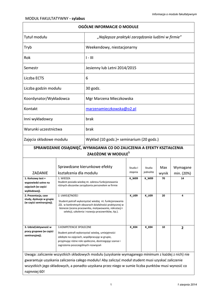 Informacja o module fakultatywnym MODUŁ FAKULTATYWNY - sylabus OGÓLNE INFORMACJE O MODULE Tytuł modułu „Najlepsze praktyki zarządzania ludźmi w firmie” Tryb Weekendowy, niestacjonarny Rok I - III Semestr Jesienny lub Letni 2014/2015 Liczba ECTS 6 Liczba godzin modułu 30 godz. Koordynator/Wykładowca Mgr Marzena Mieczkowska Kontakt [email protected] Inni wykładowcy brak Warunki uczestnictwa brak Zajęcia składowe modułu Wykład (10 godz.)+ seminarium (20 godz.) SPRAWDZANIE OSIĄGNIĘĆ, WYMAGANIA CO DO ZALICZENIA A EFEKTY KSZTAŁCENIA ZAŁOŻONE W MODULE5 ZADANIE Sprawdzane kierunkowe efekty kształcenia dla modułu Studia I stopnia Studia jednolite Max wynik Wymagane min. (20%) 1. Końcowy test + wypowiedzi ustne na zajęciach (w części wykładowej). 1. WIEDZA Student posiada wiedzę nt. zakresu funkcjonowania różnych obszarów zarządzania personelem w firmie K_W09 K_W09 K_W09 70 14 2. Prezentacja, case study, dyskusje w grupie (w części seminaryjnej). 2. UMIEJĘTNOŚCI K_U09 K_U09 20 4 3. Udział/aktywność w pracy grupowe (w części seminaryjnej). 3.KOMPETENCJE SPOŁECZNE K_K04 K_K04 10 2 Student potrafi wykorzystać wiedzę nt. funkcjonowania ZZL w konkretnych obszarach działalności praktycznej w biznesie (ocena pracownika, motywowanie, rekrutacji i selekcji, szkolenia i rozwoju pracowników, itp.). Student potrafi wykorzystać wiedzę, umiejętności zdobyte na zajęciach, współpracując w grupie, przyjmując różne role społeczne, dostrzegając szanse i zagrożenia poszczególnych rozwiązań Uwaga: zaliczenie wszystkich składowych modułu (uzyskanie wymaganego minimum z każdej z nich) nie gwarantuje uzyskania zaliczenia całego modułu! Aby zaliczyć moduł student musi uzyskać zaliczenie wszystkich jego składowych, a ponadto uzyskana przez niego w sumie liczba punktów musi wynosić co najmniej 60! 1 1 sierpnia 2014 Informacja o module fakultatywnym POWIĄZANIE PUNKTÓW Z OCENĄ MODUŁU Liczba punktów Ocena 0-59 2 (niedostateczny) 60 - 67 68 - 75 3 (dostateczny) 3,5 (dostateczny plus) 76 - 83 4 84 - 91 4, 5 (dobry plus) 92 - 100 5 (dobry) (bardzo dobry) SZCZEGÓŁOWA TEMATYKA ZAJĘĆ SKŁADOWYCH I WYMAGANA LITERATURA TEMAT 1: Proces kadrowy (4 godz.): 1. Model procesu kadrowego w firmie. 2. Modele działu personalnego w zależności od etapu rozwoju firmy. 3. Praktyczne problemy funkcjonowania działu HR w nowoczesnej organizacji. 4. Wpływ HR na biznes. Zarządzanie personelem a marketing wewnętrzny: 4. Rola usługowa działu personalnego wobec klienta wewnętrznego czyli pracownika. 5. Tworzenie wartości poprzez wysoką jakość obsługi klienta wewnętrznego. TEMAT 2: 1. 2. 3. 4. Najlepsze praktyki zarządzania ludźmi w firmie - WYKŁAD Proces rekrutacji i selekcji (2 godz.): Proces rekrutacji i selekcji - schemat Wybrane błędy najczęściej popełniane w trakcie procesu rekrutacji i selekcji. Kwestie etyczne procesu rekrutacji. Omówienie procedury rekrutacji i selekcji w firmie. TEMAT 3: Ocena efektywności pracownika (2 godz.): 1. Miejsce systemu okresowej oceny w polityce personalnej. 2. Znaczenie systemu ocen okresowych pracowników. 3. Oczekiwania pracowników wobec systemu ocen okresowych. 4. Oczekiwania w stosunku do osoby oceniającej. 5. Podstawowe funkcje systemu ocen. 6. Omówienie procedury oceny okresowej pracownika TEMAT 4: Szkolenia i rozwój pracowników (2 godz.): 1. Rodzaje szkoleń – otwarte, zamknięte, case study, symulacje, warsztaty. 2. Schemat procesu szkolenia.. 3. Omówienie procedury szkoleniowej pracowników w firmie. Motywowanie ludzi : 4. Hierarchia potrzeb A.Maslowa. 5. Proces motywacji. TEMAT 1: Proces kadrowy (2 godz. ): 1. Profil idealnego pracownika działu HR w firmie. TEMAT 2: Najlepsze praktyki zarządzania ludźmi w firmie - SEMINARIUM Proces rekrutacji i selekcji (4 godz.): 1. Opis stanowiska pracy. 2. Ogłoszenie rekrutacyjne + model idealnego kandydata 3. Rozmowa rekrutacyjna na wybrane stanowiska 4. Rekrutacja przez Internet. TEMAT 3: Ocena efektywności pracownika ( 4 godz.): 1. Typowe błędy popełniane w trakcie procesu oceniania pracowników przez przełożonych. 2. Pytania pomocnicze w przygotowaniu oceny pracowniczej. 3. Rozmowa oceniająca oraz wskazówki praktyczne do rozmowy. 4. Model efektywnej komunikacji. 2 1 sierpnia 2014 Informacja o module fakultatywnym 5. Model oceny pracowniczej. 6. Wyznaczanie celów na następny okres. 7.Inne metody oceny (AC, 360%, i inne). TEMAT 4: Szkolenia i rozwój pracowników (4 godz.): 1 .Metody określania potrzeb szkoleniowych 2. Porównanie: zewnętrzni i wewnętrzni eksperci prowadzący szkolenia. 3. Sposoby badania efektywności szkolenia. 4. Polityka szkoleniowa – przykład z firmy. 5. Planowanie szkoleń dla danych grup zawodowych 6. Określenie działań motywacyjnych (pozafinansowych) dla danych grup zawodowych. TEMAT 5: Konwersatorium: omawianie przypadków, prezentacje studentów (6h) TEMAT 1: M.Armstrong – „Zarządzanie Zasobami Ludzkimi”, Oficyna Ekonomiczna, Dom Wydawniczy ABC, Kraków 2001. TEMAT 2:M.Dale – „Skuteczna rekrutacja i selekcja pracowników”, Oficyna Ekonomiczna, Literatura Kraków 2001. TEMAT 3: M.Sidor- Rządkowska – „Kształtowanie nowoczesnych systemów ocen”, Oficyna Ekonomiczna, Kraków 2000. Biogram TEMAT 4: T.Boydell – „Identyfikacja potrzeb szkoleniowych”, Oficyna Ekonomiczna, Kraków 2001. Praktyk HR z wieloletnim doświadczeniem w biznesie. Trener biznesu. Skończyła socjologię na Uniwersytecie Warszawskim, jak również studia podyplomowe z zarządzania i marketingu oraz z zarządzania zasobami ludzkimi w firmie. Zdobyła certyfikat niezależnej europejskiej placówki International Education Society. Od początku swojej drogi zawodowej zajmuje się zagadnieniami HR (w różnych sektorach biznesu) jako HR Manager/Dyrektor. Finalistka Konkursu „Dyrektor Personalny Roku 2001”. Zdobyła dwukrotnie Godło „Inwestor w Kapitał Ludzki” (2001, 2002). Prowadzi zajęcia ze studentami w 