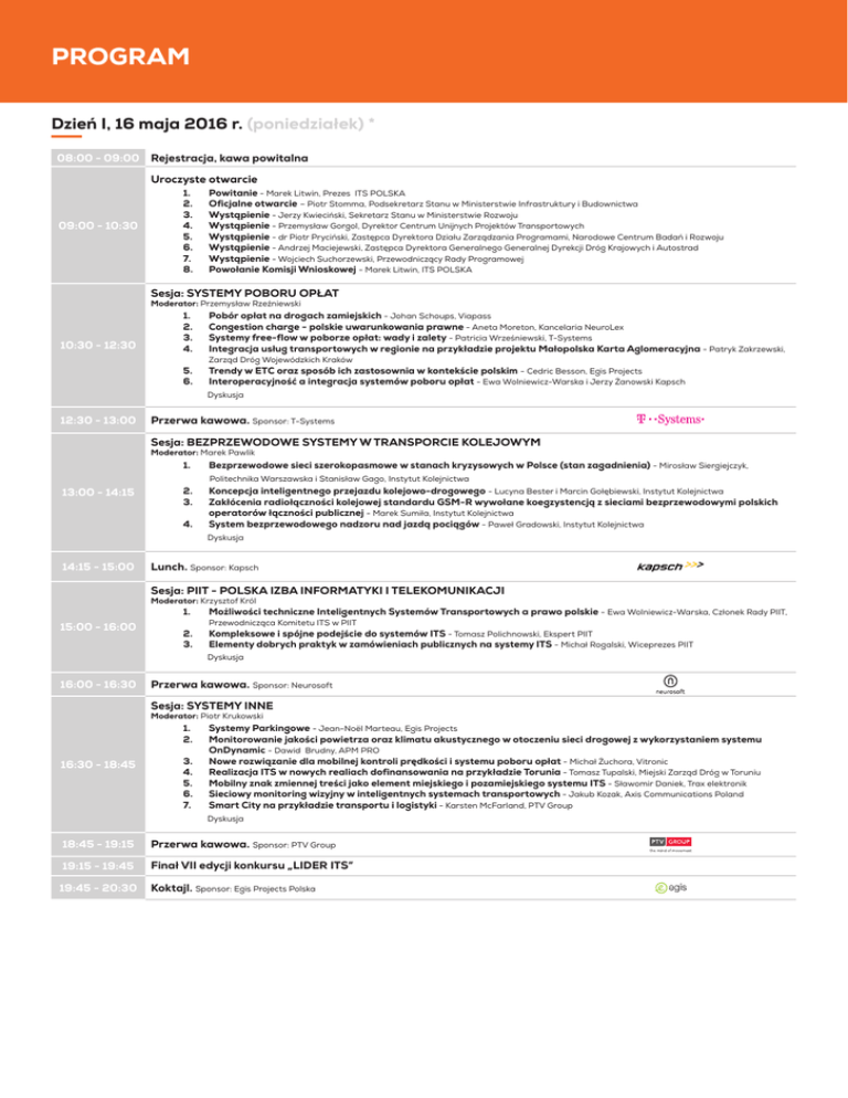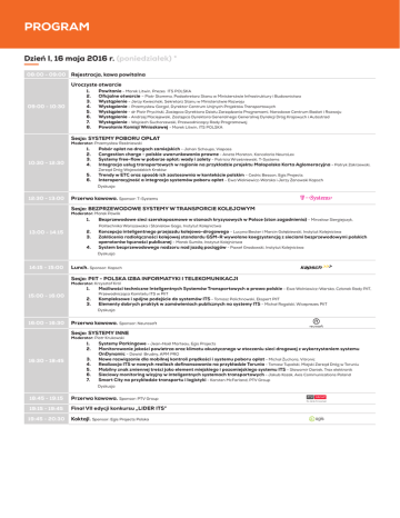 PROGRAM Dzień I, 16 maja 2016 r. (poniedziałek) * 08:00 - 09:00 Rejestracja, kawa powitalna Uroczyste otwarcie 09:00 - 10:30 1. 2. 3. 4. 5. 6. 7. 8. Powitanie - Marek Litwin, Prezes ITS POLSKA Oficjalne otwarcie – Piotr Stomma, Podsekretarz Stanu w Ministerstwie Infrastruktury i Budownictwa Wystąpienie - Jerzy Kwieciński, Sekretarz Stanu w Ministerstwie Rozwoju Wystąpienie - Przemysław Gorgol, Dyrektor Centrum Unijnych Projektów Transportowych Wystąpienie - dr Piotr Pryciński, Zastępca Dyrektora Działu Zarządzania Programami, Narodowe Centrum Badań i Rozwoju Wystąpienie - Andrzej Maciejewski, Zastępca Dyrektora Generalnego Generalnej Dyrekcji Dróg Krajowych i Autostrad Wystąpienie - Wojciech Suchorzewski, Przewodniczący Rady Programowej Powołanie Komisji Wnioskowej - Marek Litwin, ITS POLSKA Sesja: SYSTEMY POBORU OPŁAT Moderator: Przemysław Rzeźniewski 10:30 - 12:30 1. 2. 3. 4. 5. 6. Pobór opłat na drogach zamiejskich - Johan Schoups, Viapass Congestion charge - polskie uwarunkowania prawne - Aneta Moreton, Kancelaria NeuroLex Systemy free-flow w poborze opłat: wady i zalety - Patricia Wrześniewski, T-Systems Integracja usług transportowych w regionie na przykładzie projektu Małopolska Karta Aglomeracyjna - Patryk Zakrzewski, Zarząd Dróg Wojewódzkich Kraków Trendy w ETC oraz sposób ich zastosownia w kontekście polskim - Cedric Besson, Egis Projects Interoperacyjność a integracja systemów poboru opłat - Ewa Wolniewicz-Warska i Jerzy Żanowski Kapsch Dyskusja 12:30 - 13:00 Przerwa kawowa. Sponsor: T-Systems Sesja: BEZPRZEWODOWE SYSTEMY W TRANSPORCIE KOLEJOWYM Moderator: Marek Pawlik 1. Bezprzewodowe sieci szerokopasmowe w stanach kryzysowych w Polsce (stan zagadnienia) - Mirosław Siergiejczyk, 2. 3. Koncepcja inteligentnego przejazdu kolejowo-drogowego - Lucyna Bester i Marcin Gołębiewski, Instytut Kolejnictwa Zakłócenia radiołączności kolejowej standardu GSM-R wywołane koegzystencją z sieciami bezprzewodowymi polskich operatorów łączności publicznej - Marek Sumiła, Instytut Kolejnictwa System bezprzewodowego nadzoru nad jazdą pociągów - Paweł Gradowski, Instytut Kolejnictwa Politechnika Warszawska i Stanisław Gago, Instytut Kolejnictwa 13:00 - 14:15 4. Dyskusja 14:15 - 15:00 Lunch. Sponsor: Kapsch Sesja: PIIT - POLSKA IZBA INFORMATYKI I TELEKOMUNIKACJI Moderator: Krzysztof Król 1. 15:00 - 16:00 2. 3. Możliwości techniczne Inteligentnych Systemów Transportowych a prawo polskie - Ewa Wolniewicz-Warska, Członek Rady PIIT, Przewodnicząca Komitetu ITS w PIIT Kompleksowe i spójne podejście do systemów ITS - Tomasz Polichnowski, Ekspert PIIT Elementy dobrych praktyk w zamówieniach publicznych na systemy ITS - Michał Rogalski, Wiceprezes PIIT Dyskusja 16:00 - 16:30 Przerwa kawowa. Sponsor: Neurosoft Sesja: SYSTEMY INNE Moderator: Piotr Krukowski 1. 2. 16:30 - 18:45 3. 4. 5. 6. 7. Systemy Parkingowe - Jean-Noël Marteau, Egis Projects Monitorowanie jakości powietrza oraz klimatu akustycznego w otoczeniu sieci drogowej z wykorzystaniem systemu OnDynamic - Dawid Brudny, APM PRO Nowe rozwiązanie dla mobilnej kontroli prędkości i systemu poboru opłat - Michał Żuchora, Vitronic Realizacja ITS w nowych realiach dofinansowania na przykładzie Torunia - Tomasz Tupalski, Miejski Zarząd Dróg w Toruniu Mobilny znak zmiennej treści jako element miejskiego i pozamiejskiego systemu ITS - Sławomir Daniek, Trax elektronik Sieciowy monitoring wizyjny w inteligentnych systemach transportowych - Jakub Kozak, Axis Communications Poland Smart City na przykładzie transportu i logistyki - Karsten McFarland, PTV Group Dyskusja 18:45 - 19:15 Przerwa kawowa. Sponsor: PTV Group 19:15 - 19:45 Finał VII edycji konkursu „LIDER ITS” 19:45 - 20:30 Koktajl. Sponsor: Egis Projects Polska IX POLSKI KONGRES ITS Warszawa, 16-17 maja 2016 r., Hotel Novotel Centrum Dzień II, 17 maja 2016 r. (wtorek) * 08:30 - 09:00 Poranna kawa Sesja: SYSTEMY ZARZĄDZANIA RUCHEM Moderator: Wojciech Suchorzewski 1. 2. 3. 4. 09:00 - 11:30 Wyzwania interoperacyjności dla Systemów Zarządzania Ruchem - CHARM - Przemysław Staśkowiak, Kapsch System zarządzania ruchem bazujący na symulacji komputerowej - Paweł Gora, Uniwersytet Warszawski Działający w czasie rzeczywistym dynamiczny model ruchu jako główny element systemu sterowania/zarządzania ruchem - Rafał Kucharski, Politechnika Krakowska 5. 6. Zależności pomiędzy podsystemem sterowania ruchem a innymi podsystemami w systemach ITS, na przykładzie podsystemów priorytetów - dla transportu publicznego oraz sterowania ruchem w tunelu - Piotr Pęcherski, Sprint Ku innowacjom w funkcjonalności ITS w regulacji ruchu tramwajowego - Andrzej Krych, Politechnika Poznańska Poprawa płynności ruchu dzięki wdrożeniu inteligentnych rozwiązań nadzoru i sterowania - David Montgomery, Luke 7. Zarządzanie objazdami w systemach ITS z wykorzystaniem systemu dyspozytorskiego LIO firmy Trapeze - Mariusz 8. Normington, Siemens AG Kozłowski i Łukasz Stanisławski, Trapeze Efektywna optymalizacja korzystania z polskich dróg z użyciem TomTom Traffic - Maarten Clements, TomTom Dyskusja 11:30 - 12:00 Przerwa kawowa. Sponsor: Siemens Debata dziennika Gazeta Prawna i ITS POLSKA: RYNEK INTELIGENTNYCH SYSTEMÓW TRANSPORTOWYCH Moderator: Konrad Majszyk 12:00 - 13:00 Uczestnicy: Marek Litwin, Prezes ITS POLSKA Paweł Szaciłło - Dyrektor ds. PPP w Ministerstwie Rozwoju Jarosław Waszkiewicz - Dyrektor Departamentu Dróg Publicznych w Ministerstwie Infrastruktury i Budownictwa Przemysław Gorgol - Dyrektor Centrum Unijnych Projektów Transportowych Marek Cywiński -Dyrektor Generalny Kapsch Telematic Services prof. Wojciech Suchorzewski - Politechnika Warszawska Tematyka: plany dotyczące KSZR, rozbudowa Systemu Poboru Opłat, finansowanie ITS w obecnej perspektywie, Partnerstwo Publiczno-Prywatne, badania i rozwój w programach 2014-2020 13:00 - 14:00 Lunch. Sponsor: ITS POLSKA Sesja: STANDARYZACJA RYNKU ITS I OCHRONA DA