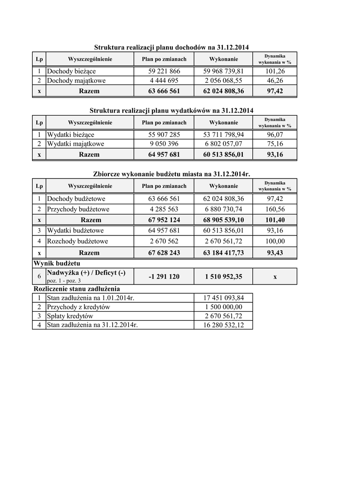 Struktura realizacji planu dochodów na 31.12.2014 Lp Wyszczególnienie 1 Dochody bieżące 2 Dochody majątkowe x Razem Plan po zmianach Wykonanie Dynamika wykonania w % 59 221 866 4 444 695 63 666 561 59 968 739,81 2 056 068,55 62 024 808,36 101,26 46,26 97,42 Struktura realizacji planu wydatkówów na 31.12.2014 Lp Wyszczególnienie 1 Wydatki bieżące 2 Wydatki majątkowe x Razem Plan po zmianach Wykonanie Dynamika wykonania w % 55 907 285 9 050 396 64 957 681 53 711 798,94 6 802 057,07 60 513 856,01 96,07 75,16 93,16 Zbiorcze wykonanie budżetu miasta na 31.12.2014r. Plan po zmianach Wykonanie Dynamika wykonania w % 2 Przychody budżetowe 63 666 561 4 285 563 62 024 808,36 6 880 730,74 97,42 160,56 x Razem 3 Wydatki budżetowe 67 952 124 64 957 681 68 905 539,10 60 513 856,01 101,40 93,16 4 Rozchody budżetowe 2 670 562 2 670 561,72 100,00 67 628 243 63 184 417,73 93,43 -1 291 120 1 510 952,35 x Lp Wyszczególnienie 1 Dochody budżetowe Razem Wynik budżetu Nadwyżka (+) / Deficyt (-) 6 x poz. 1 - poz. 3 Rozliczenie stanu zadłużenia 1 Stan zadłużenia na 1.01.2014r. 2 Przychody z kredytów 3 Spłaty kredytów 4 Stan zadłużenia na 31.12.2014r. 17 451 093,84 1 500 000,00 2 670 561,72 16 280 532,12