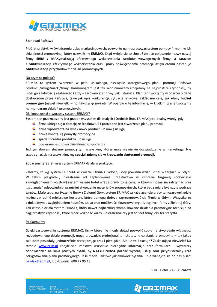 Szanowni Państwo Pięć lat praktyki w świadczeniu usług marketingowych, pozwoliło nam opracować system pomocy firmom w ich działalności promocyjnej, który nazwaliśmy ERIMAX. Skąd wzięło się to słowo? Jest to połączenie nazwy naszej firmy ERIM z MAXymalizacją efektywnego wykorzystania zasobów wewnętrznych firmy, a zarazem z MAXymalizacją efektywnego wykorzystania czasu pracy poświęconemu promocji, dzięki czemu następuje MAXymalizacja przychodów z działań promocyjnych. Na czym to polega? ERIMAX to system tworzenia w pełni unikalnego, niezwykle szczegółowego planu promocji Państwa produktu/usługi/marki/firmy. Harmonogram jest tak skonstruowany (rozpisany na najprostsze czynności), by mógł go z łatwością realizować każdy – zarówno szef firmy, jak i stażysta. Plan ten tworzymy w oparciu o dane dostarczone przez Państwa, takie jak opis konkurencji, sytuacja rynkowa, zakładane cele, zakładany budżet promocyjny (nawet niewielki – np. kilkutysięczny) etc. W oparciu o te informacje, w krótkim czasie tworzymy harmonogram działań promocyjnych. Dla kogo został stworzony system ERIMAX? System ten przeznaczony jest przede wszystkim dla małych i średnich firm. ERIMAX jest idealny wtedy, gdy: firma ubiega się o dotację ze środków UE i potrzebne jest stworzenie planu promocji firma wprowadza na rynek nowy produkt lub nową usługę firmie kończą się pomysły promocyjne spada sprzedaż produktu lub usługi otwierana jest nowa działalność gospodarcza Jednym słowem służymy pomocą tym wszystkim, którzy mają niewielkie doświadczenie w marketingu. Nie trzeba znać się na wszystkim, my specjalizujemy się w kreowaniu skutecznej promocji. Zobaczmy teraz jak nasz system ERIMAX działa w praktyce: Załóżmy, że wg systemu ERIMAX w kwietniu firma z Zielonej Góry powinna wziąć udział w targach w Gdyni. W takim przypadku, niezależnie od zaplanowania uczestnictwa w imprezie targowej (oczywiście z uwzględnieniem kosztów) system wskaże hotel wraz z przybliżoną ceną, w którym można się zatrzymać oraz „zaplanuje” odpowiednio wcześniej stworzenie materiałów promocyjnych, które będą miały być użyte podczas targów. Mało tego, na życzenie firmy z Zielonej Góry, system ERIMAX wskaże agencję pracy tymczasowej, gdzie można zatrudnić miejscowe hostessy, które pomogą dobrze zaprezentować się firmie w Gdyni. Wszystko to z dokładnym uwzględnieniem kosztów, czasu oraz możliwości finansowo-organizacyjnych firmy z Zielonej Góry. Tak właśnie działa system ERIMAX, który nawet najbardziej skomplikowane działania promocyjne rozpisuje na ciąg prostych czynności, które może wykonać każdy – niezależnie czy jest to szef firmy, czy też stażysta. Podsumujmy Dzięki zastosowaniu systemu ERIMAX, firmy które nie mogły dotąd pozwolić sobie na stworzenie własnego, rozbudowanego działu promocji, mogą prowadzić profesjonalne i skuteczne działania promocyjne – tak jakby taki dział posiadały, jednocześnie oszczędzając czas i pieniądze. Ale ile to kosztuje? Zaskakująco niewiele! Na stronie www.erim.pl znajdziecie Państwo wszystkie niezbędne informacje oraz formularz – wystarczy odpowiedzieć na kilka prostych pytań, by NATYCHMIAST poznać wycenę usługi oraz przypuszczalny czas przygotowania planu promocyjnego. Jeśli macie Państwo jakiekolwiek pytania – nie wahajcie się do nas pisać: [email protected], lub dzwonić: 600 77 95 45. SERDECZNIE ZAPRASZAMY!
