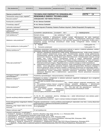 Opis modułu kształcenia / przedmiotu (sylabus) Rok akademicki: 2012/2013 Nazwa przedmiotu1): Grupa przedmiotów: specjalnościowych Numer katalogowy: TECHNOLOGIE ENERGETYKI ODNAWIALNEJ RENEWABLE ENERGY TECHNOLOGIES 3) Tłumaczenie nazwy na jęz. angielski : 4) Kierunek studiów : ZIP/I/SN/43A ECTS 2) 4 ZARZĄDZANIE I INŻYNIERIA PRODUKCJI 5) Koordynator przedmiotu : Dr inż. Dariusz Czekalski 6) Prowadzący zajęcia : Dr inż. Dariusz Czekalski 7) Jednostka realizująca : Wydział Inżynierii Produkcji, Katedra Podstaw Inżynierii, Zakład Gospodarki Energetycznej Wydział, dla którego przedmiot jest 8) realizowany : 9) Status przedmiotu : a) przedmiot specjalnościowy b) stopień I Semestr zimowy Jęz. wykładowy : polski 10) Cykl dydaktyczny : rok 4 c) niestacjonarne 11) Zapoznanie studentów z odnawialnymi źródłami energii, alternatywnymi dla paliw kopalnych, stanowiącymi ekologiczną alternatywę w rozwoju energetyki. Przedstawienie technicznych metod pozyskiwania energii ze źródeł odnawialnych oraz warunków opłacalnej ich eksploatacji. Analiza stanu i perspektyw rozwoju technologii odnawialnych źródeł energii. Umiejętność doboru instalacji do określonych obiektów. a) Wykład …………………………………………………………………………; liczba godzin 16.; 12) Założenia i cele przedmiotu : 13) Formy dydaktyczne, liczba godzin : b) Ćwiczenia audytoryjne ………………………………………………………; liczba godzin 16...; Wykładowe prezentacje multimedialne. Inspirowanie dyskusji w oparciu o materiał wykładowy, wiedzę i obserwacje studentów oraz wyniki przykładów obliczeniowych. a) Definicja i klasyfikacja odnawialnych źródeł energii. Niskotemperaturowe źródła energii. Budowa i zasada działania sprężarkowej pompy ciepła. Charakterystyka zasobów energii geotermicznej. Charakterystyka zasobów energii słonecznej. Budowa i zasada działania cieczowych kolektorów słonecznych. Budowa, zasada działania ogniw fotowoltaicznych. Charakterystyka zasobów energii spadku wód. Turbiny wodne. Pozyskiwanie energii w małych elektrowniach wodnych. Charakterystyka zasobów energii wiatru. Pozyskiwanie energii w elektrownie i farmach wiatrowych. Zasoby biomasy stałej – rośliny energetyczne. Produkcja biokomponentów do biopaliw ciekłych. Potencjał produkcyjny biogazu. Regulacje prawne w obrocie energią ze źródeł odnawialnych. b) Zastosowania pomp ciepła w technice grzewcze. Dobór sprężarkowej pomp ciepła do wybranego obiektu - ocena opłacalności wdrożenia. Krajowe ciepłownie geotermalne. Słoneczne instalacje w technice grzewczej. Dobór rozmiarów instalacji z kolektorami słonecznymi do wybranego obiektu – ocena opłacalności wdrożenia. Proces inwestycyjny mikroelektrowni wodnych. Opłacalność budowy mikroelektrowni. Proces inwestycyjny elektrowni wiatrowych. Opłacalność budowy elektrowni wiatrowych. Biopaliwa stałe w ciepłownictwie i ogrzewnictwie. Warunki opłacalności stosowania biopaliw ciekłych. 14) Metody dydaktyczne : 15) Pełny opis przedmiotu : Wymagania formalne (przedmioty 16) wprowadzające) : Przedmioty wprowadzające: maszynoznawstwo, mikroekonomia. Niezbędne są wiedza i umiejętności w zakresie wybranych zagadnień znajdujących się w programie przedmiotów wprowadzających 01 – Wie jakie są zasoby źródeł odnawialnych w Polsce 04 – Potrafi wskazać wydajność energetyczną oraz 02 – Zna podstawy budowy maszyn i urządzeń obliczyć wskaźniki ekologiczne i ekonomiczne do pozyskiwania i przetwarzania energii ze instalacji wykorzystującej odnawialne źródła energii źródeł odnawialnych 05 – Wie jaka jest rola gospodarcza i społeczna 03 – Umie dobrać rozmiary podstawowych wykorzystywania odnawialnych źródeł składników instalacji grzewczych wykorzystującej odnawialne źródła energii 17) Założenia wstępne : 18) Efekty kształcenia : 19) Sposób weryfikacji efektów kształcenia : 01, 02, 03, 04 – sprawdzian pisemny składający się z zadań obliczeniowych oraz zestawu pytań i poleceń o otwartym charakterze 05 – zespołowa praca pisemna – raport z lustracji instalacji energetyki odnawialnej Forma dokumentacji osiągniętych efektów Oryginały sprawdzianów z oceną punktową poszczególnych odpowiedzi oraz lista z oceną aktywności 20) kształcenia : przechowywane w gabinecie koordynatora przedmiotu. 30 % praca pisemna Elementy i wagi mające wpływ na ocenę 70 % sprawdzian 21) końcową : 22) Miejsce realizacji zajęć : W sali dydaktycznej 23) Literatura podstawowa i uzupełniająca : 1. Gradziuk P., Grzybek A., Kowalczyk K., Kościk B.: Biopaliwa. Wyd. Wieś Jutra Sp. z o. o. Warszawa 2003. 2. Lewandowski W.: Proekologiczne odnawialne źródła energii. WNT, 2006. 3. Jastrzebska G.: Odnawialne źródła energii i pojazdy proekologiczne, WNT, Warszawa 2008 4. Chochowski A., Krawiec F.: Zarządzanie w Energetyce. Rozdz. 6-10. Centrum Doradztwa i Informacji Difin, Warszawa 2008. 5. Flaga A.: Inżynieria wiatrowa. Podstawy i zastosowania. Arkady, Warszawa 2008 6. Głaszczka A., Wardal W., Romaniuk W., Domasiewicz T.: Biogazownie rolnicze. MULTICO Oficyna Wydawnicza, Warszawa 2010. 7. Rubik M. : Pompy ciepła w systemach geotermii niskotemperaturowej. MULTICO Oficyna Wydawnicza, Warszawa 2011. 24) UWAGI : 1 Wskaźniki ilościowe charakteryzujące moduł/przedmiot 25) : Szacunkowa sumaryczna liczba godzin pracy studenta (kontaktowych i pracy własnej) niezbędna dla osiągnięcia zakładanych efektów kształcenia18) - na tej podstawie należy wypełnić pole ECTS2: Łączna liczba punktów ECTS, którą student uzyskuje na zajęciach wymagających bezpośredniego udziału nauczycieli akademickich: Łączna liczba punktów ECTS, którą student uzyskuje w ramach zajęć o charakterze praktycznym, takich jak zajęcia laboratoryjne, projektowe, itp.: Tabela zgodności kierunkowych efektów kształcenia efektami przedmiotu Nr /symbol 