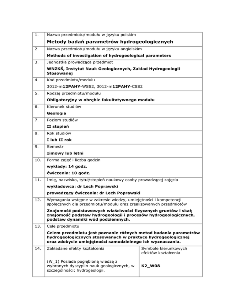 1. Nazwa przedmiotu/modułu w języku polskim Metody badań parametrów hydrogeologicznych 2. Nazwa przedmiotu/modułu w języku angielskim Methods of investigation of hydrogeological parameters 3. Jednostka prowadząca przedmiot WNZKŚ, Instytut Nauk Geologicznych, Zakład Hydrogeologii Stosowanej 4. Kod przedmiotu/modułu 3012-m12PAHY-WSS2, 3012-m12PAHY-CSS2 5. Rodzaj przedmiotu/modułu Obligatoryjny w obrębie fakultatywnego modułu 6. Kierunek studiów Geologia 7. Poziom studiów II stopień 8. Rok studiów I lub II rok 9. Semestr zimowy lub letni 10. Forma zajęć i liczba godzin wykłady: 14 godz. ćwiczenia: 10 godz. 11. Imię, nazwisko, tytuł/stopień naukowy osoby prowadzącej zajęcia wykładowca: dr Lech Poprawski prowadzący ćwiczenia: dr Lech Poprawski 12. Wymagania wstępne w zakresie wiedzy, umiejętności i kompetencji społecznych dla przedmiotu/modułu oraz zrealizowanych przedmiotów Znajomość podstawowych właściwości fizycznych gruntów i skał; znajomość podstaw hydrogeologii i procesów hydrogeologicznych, podstaw dynamiki wód podziemnych. 13. Cele przedmiotu Celem przedmiotu jest poznanie różnych metod badania parametrów hydrogeologicznych stosowanych w praktyce hydrogeologicznej oraz zdobycie umiejętności samodzielnego ich wyznaczania. 14. Zakładane efekty kształcenia (W_1) Posiada pogłębioną wiedzę z wybranych dyscyplin nauk geologicznych, w szczególności: hydrogeologii. Symbole kierunkowych efektów kształcenia K2_W08 (U_1) Potrafi zastosować zaawansowane techniki i narzędzia badawcze w zakresie wybranych dyscyplin nauk geologicznych, w szczególności hydrogeologii. 15. K2_U02 Treści programowe Wykłady: Wyjaśnienie i uporządkowanie pojęć i definicji dotyczących właściwości i parametrów hydrogeologicznych Omówienie poszczególnych metod badawczych oraz dokładności uzyskiwanych wyników (metody przybliżone i wzorów empirycznych, metody laboratoryjne, metody ekspresowe, metody polowe, badania parametrów skał krystalicznych, utworów słabo przepuszczalnych, badania znacznikowe, analizy regionalne) Ćwiczenia: Obliczenia parametrów hydrogeologicznych różnymi metodami stosowanymi w hydrogeologii: - metody przybliżone - metody laboratoryjne, - metody ekspresowe, - metody polowe, -analizy regionalne. 16. Zalecana literatura (podręczniki) Literatura podstawowa: Castany G., 1972 - Poszukiwanie i eksploatacja wód podziemnych. Wyd. Geol. Warszawa. Dąbrowski S., Przybyłek J., 2005 - Metodyka próbnych pompowań w dokumentowaniu zasobów wód podziemnych. Poradnik metodyczny. Ministerstwo Środowiska. Warszawa Kleczkowski A., Różkowski A., [red.], 1997 - Słownik hydrogeologiczny, MOSZNiL. Warszawa. Marciniak M., Przybyłek J., Herzig J., Szczepańska J., 1999 - Badanie współczynnika filtracji utworów półprzepuszczalnych. Wyd. Sorus, Kraków. Myslińska E., 1992 - Laboratoryjne badania gruntów. Wyd. Nauk. PWN, Warszawa. Pazdro Z., Kozerski B., 1990 - Hydrogeologia ogólna. Wydawnictwa Geologiczne, Warszawa. Pleczynski J., 1981 - Odnawialnosc zasobów wód podziemnych, Wyd. Geol. Warszawa. Literatura uzupełniająca: Białas Z., Czyżewski Z., Zwierzewicz T., 1971 - Obliczanie współczynnika filtracji za pomocą wzoru. Tech. Poszuk. Geol, z. 37. Davis S. N., 1969 - Porosity and permeability in natural materials. In Flow through Porous Media, ed. R. J. M. DeWiest, Academic Press, New York. Glinski J., Konstankiewicz K., 1991 - Metody i aparatura do badan agrofizycznych T. I Gleba. Problemy Agrofizyki z. 64, Ossolineum, Wrocław. Kleczkowski A., Mularz., 1964 - Przyczynek do metodyki wyznaczania porowatosci skał dla celów hydrogeologicznych. Przegl. Geol. 2, Warszawa. Kowalski S., 1984 - Badanie procesu filtracji wody w trakcie jej drena_u z pionowej kolumny gruntu. Acta Univ. Wratisl. No 529, Prace Geol.-Mineral. IX. Wyd. Uniw. Wrocł., Wrocław Motyka J., Szczepańska J., Witczak S., 1971 - Zastosowanie wirówki do badan współczynnika odsączalności i dynamiki oddawania wody przez skałe. Technika Poszukiwań, 37, Kraków. Ossowski J., Żak S., 1976 - Aparatura do badań wodoprzepuszczalności gruntów spoistych. Górn. Odkrywk. Nr 5-6. Poprawki L., 1986 - Przyczynek do metodyki wyznaczania współczynnika filtracji za pomocą wzorów empirycznych na przykładzie piaszczystych osadów doliny Odry. Technika Poszukiwan Geologicznych nr 1. Rogoż M., 1975 - Urządzenie do oznaczania przepuszczalności skał zwiezłych. Przegl. Górn. 7-8. Wąsik M., 2003: Zdolność infiltracyjna utworów przypowierzchniowych a zasilanie wód podziemnych. Wrocław. Zuber A. (red.), 2007 - Metody znacznikowe w badaniach hydrogeologicznych. Poradnik metodyczny, Oficyna Wydawnicza Politechniki Wrocławskiej, Wrocław. 17. Forma zaliczenia poszczególnych komponentów przedmiotu/modułu, sposób sprawdzenia osiągnięcia zamierzonych efektów kształcenia: Wykłady: Złożenie egzaminu pisemnego (kilka zagadnień problemowych). Dla zaliczenia egzaminu niezbędne jest uzyskanie minimum 50% punktów możliwych do uzyskania Ćwiczenia: Sprawozdania obejmujące wprowadzające opisy metod badawczych oraz własne obliczenia, kolokwium pisemne (zadania do rozwiązania) Elementy i wagi mające wpływ na ocenę końcową: egzamin 50 %, ćwiczenia 50%. 18. Język wykładowy Polski 19. Obciążenie pracą studenta: Forma aktywności studenta Godziny zajęć (wg planu studiów) z nauczycielem: - wykład: 14 godz. - ćwiczenia prowadzone w laboratorium: 10 godz. Średnia liczba godzin na zrealizowanie aktywności 24 godz. Praca własna studenta np.: 30 godz. - przygotowanie do zajęć: 5 godz. - opracowanie wyników: 10 godz. - czytanie wskazanej literatury: 5 godz. - napisanie raportu z zajęć: 5 godz. - przygotowanie do egzaminu: 10 godz. Suma godzin Liczba punktów ECTS 54 godz. 3 ECTS