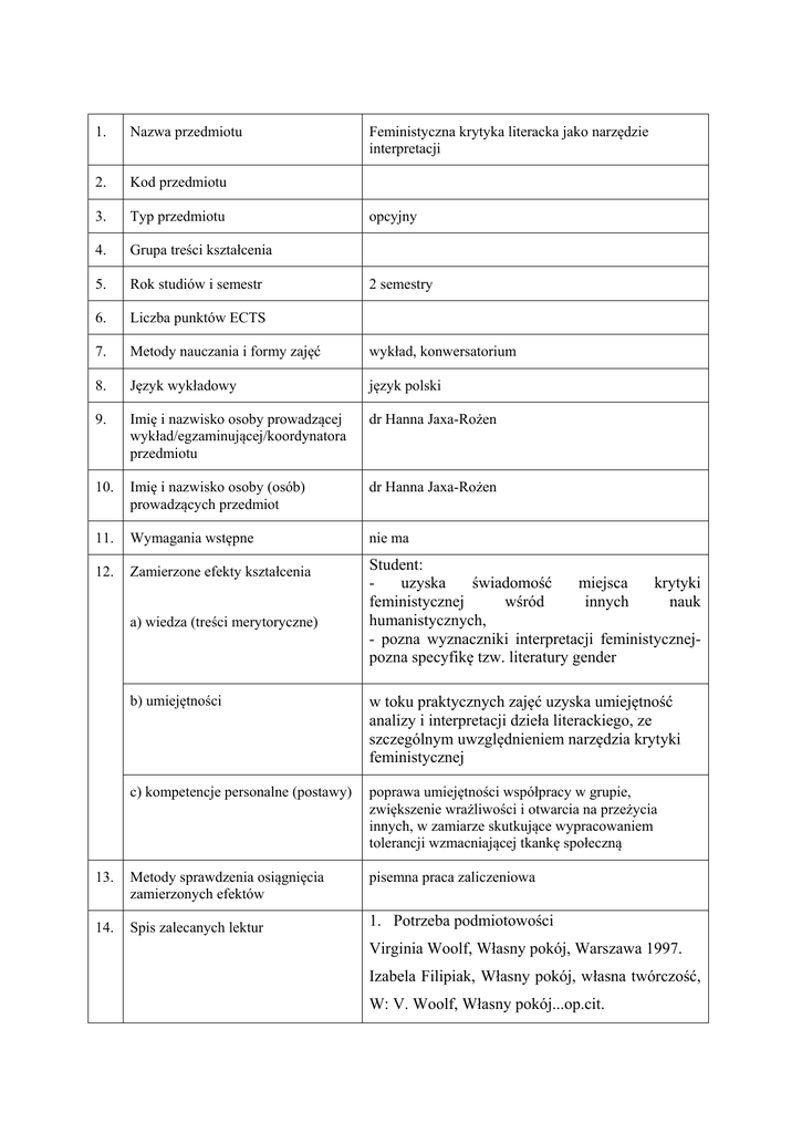 Feministyczna krytyka literacka jako narzędzie interpretacji 1. Nazwa przedmiotu 2. Kod przedmiotu 3. Typ przedmiotu 4. Grupa treści kształcenia 5. Rok studiów i semestr 6. Liczba punktów ECTS 7. Metody nauczania i formy zajęć wykład, konwersatorium 8. Język wykładowy język polski 9. Imię i nazwisko osoby prowadzącej wykład/egzaminującej/koordynatora przedmiotu dr Hanna Jaxa-Rożen 10. Imię i nazwisko osoby (osób) prowadzących przedmiot dr Hanna Jaxa-Rożen 11. Wymagania wstępne nie ma 12. Zamierzone efekty kształcenia Student: uzyska świadomość miejsca krytyki feministycznej wśród innych nauk humanistycznych, - pozna wyznaczniki interpretacji feministycznejpozna specyfikę tzw. literatury gender a) wiedza (treści merytoryczne) opcyjny 2 semestry b) umiejętności w toku praktycznych zajęć uzyska umiejętność analizy i interpretacji dzieła literackiego, ze szczególnym uwzględnieniem narzędzia krytyki feministycznej c) kompetencje personalne (postawy) poprawa umiejętności współpracy w grupie, zwiększenie wrażliwości i otwarcia na przeżycia innych, w zamiarze skutkujące wypracowaniem tolerancji wzmacniającej tkankę społeczną 13. Metody sprawdzenia osiągnięcia zamierzonych efektów pisemna praca zaliczeniowa 14. Spis zalecanych lektur 1. Potrzeba podmiotowości Virginia Woolf, Własny pokój, Warszawa 1997. Izabela Filipiak, Własny pokój, własna twórczość, W: V. Woolf, Własny pokój...op.cit. 2. Próba definicji kobiecego pisania „Teksty Drugie” 1993 nr 4-5-6 Elaine Showalter, Krytyka feministyczna na bezdrożach, s.115-146, Helene Cixous, Śmiech Meduzy, s. 147-166. „Teksty Drugie” 1995 nr 3-4 Grażyna Borkowska, Metafora drożdży. Co to jest literatura/poezja kobieca, s.31-44. Kobiety. Rozmowa Elaine Bouquey z Julią Kristevą, s.275-282. 3. Kobieta osaczona czyli antyutopia Opowieść podręcznej, feministyczna Margaret Atwood, Warszawa 1992. 4. Kobiety towarzyszki Anna Bojarska, Czego nauczył mnie August, Warszawa 1995. 5. Porządkowanie świata Olga Tokarczuk, Prawiek i inne czasy ...(?) 6. Filozofia codzienności Jolanta Brach-Czaina, Szczeliny istnienia, Warszawa 1992. 7. Odczuwanie kobiecości Anna Świrszczyńska wybór wierszy z tomów Jestem baba (1972), Cierpienie i radość (1985); np. w zbiorze: Radość i cierpienie, Kraków 1993. 8. Macierzyństwo Anna Nasiłowska, Domino. Traktat o narodzinach, Warszawa 1995. 9. Kobiecy homoerotyzm Nicole Müller, Bo to jest w miłości najstraszniejsze, Warszawa 1996. Jeanette Winterson, Nie tylko pomarańcze, Poznań 1997. 10. Na marginesie Nickie Roberts, Dziwki w historii. Prostytucja w społeczeństwie zachodnim, Warszawa 1997.