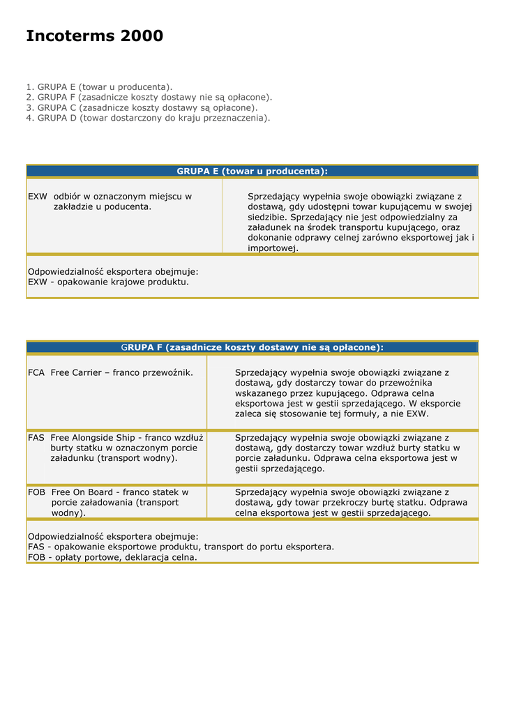 Incoterms 2000 1. 2. 3. 4. GRUPA GRUPA GRUPA GRUPA E (towar u producenta). F (zasadnicze koszty dostawy nie są opłacone). C (zasadnicze koszty dostawy są opłacone). D (towar dostarczony do kraju przeznaczenia). GRUPA E (towar u producenta): EXW odbiór w oznaczonym miejscu w zakładzie u poducenta. Sprzedający wypełnia swoje obowiązki związane z dostawą, gdy udostępni towar kupującemu w swojej siedzibie. Sprzedający nie jest odpowiedzialny za załadunek na środek transportu kupującego, oraz dokonanie odprawy celnej zarówno eksportowej jak i importowej. Odpowiedzialność eksportera obejmuje: EXW - opakowanie krajowe produktu. GRUPA F (zasadnicze koszty dostawy nie są opłacone): FCA Free Carrier – franco przewoźnik. Sprzedający wypełnia swoje obowiązki związane z dostawą, gdy dostarczy towar do przewoźnika wskazanego przez kupującego. Odprawa celna eksportowa jest w gestii sprzedającego. W eksporcie zaleca się stosowanie tej formuły, a nie EXW. FAS Free Alongside Ship - franco wzdłuŜ burty statku w oznaczonym porcie załadunku (transport wodny). Sprzedający wypełnia swoje obowiązki związane z dostawą, gdy dostarczy towar wzdłuŜ burty statku w porcie załadunku. Odprawa celna eksportowa jest w gestii sprzedającego. FOB Free On Board - franco statek w porcie załadowania (transport wodny). Sprzedający wypełnia swoje obowiązki związane z dostawą, gdy towar przekroczy burtę statku. Odprawa celna eksportowa jest w gestii sprzedającego. Odpowiedzialność eksportera obejmuje: FAS - opakowanie eksportowe produktu, transport do portu eksportera. FOB - opłaty portowe, deklaracja celna. GRUPA C (zasadnicze koszty dostawy są opłacone): CFR Cost and Freight – koszt towaru i transportu do portu przeznaczenia (transport wodny). Sprzedający wypełnia swoje obowiązki związane z dostawą, gdy dostarczy towar do portu przeznaczenia (nie ponosi ryzyka z tytułu straty lub uszkodzenia towaru). Odprawa celna eksportowa jest w gestii sprzedającego. CIF Coast, Insurance, Freight - koszt towaru, ubezpieczenia i frachtu do znaczonego portu przeznaczenia. (transport wodny). Sprzedający wypełnia swoje obowiązki związane z dostawą, gdy postawi towar do dyspozycji kupującego na statku w oznaczonym porcie przeznaczenia. Odprawa celna eksportowa jest w gestii sprzedającego. CPT Carriage Paid to... - przewoźne opłacone do... Sprzedający wypełnia swoje obowiązki związane z dostawą, gdy dostarczy towar do określonego miejsca przeznaczenia. Odprawa celna eksportowa jest w gestii sprzedającego. CIP Carriage and Insurance Paid to... przewoźne i ubezpieczenie opłacone do... Sprzedający wypełnia swoje obowiązki związane z dostawą, gdy dostarczy ubezpieczony towar do określonego miejsca przeznaczenia. Odprawa celna eksportowa jest w gestii sprzedającego. GRUPA D (towar dostarczony do kraju przeznaczenia): DAF Delivered at Frontier - dostarczone na granicę. Sprzedający wypełnia swoje obowiązki związane z dostawą, gdy postawi towar do dyspozycji kupującego w określonym określonym miejscu na granicy, ale przed granicą sąsiedniego kraju. Odprawa celna eksportowa jest w gestii sprzedającego. DES Delivered ex Ship - dostarczone na statku (transport wodny). Sprzedający wypełnia swoje obowiązki związane z dostawą, gdy postawi towar do dyspozycji kupującego na statku w oznaczonym porcie przeznaczenia, bez dokonania odprawy celnej. Odprawa celna eksportowa jest w gestii sprzedającego. DEQ Delivered ex Quay and duty paid... - dostarczone na nabrzeŜe (transport wodny). Sprzedający wypełnia swoje obowiązki związane z dostawą, gdy dostarczy towar na nabrzeŜe portu przeznaczenia. Odprawa celna importowa jest w gestii sprzedającego. DDU Delivered Duty Unpaid... dostarczone, cło nieopłacone. Sprzedający wypełnia swoje obowiązki związane z dostawą, gdy dostarczy towar bez opłacenia cła do oznaczonego miejsca w kraju importera. DDP Delivered Duty Paid... dostarczone, cło opłacone. Sprzedający wypełnia swoje obowiązki związane z dostawą, gdy dostarczy towar do oznaczonego miejsca w kraju importera, po opłaceniu opłat granicznych zarówno eksportowych jak i importowych.