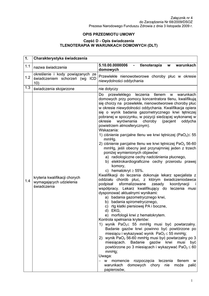 Załącznik nr 4 do Zarządzenia Nr 68/2009/DSOZ Prezesa Narodowego Funduszu Zdrowia z dnia 3 listopada 2009 r. OPIS PRZEDMIOTU UMOWY Część D - Opis świadczenia TLENOTERAPIA W WARUNKACH DOMOWYCH (DLT) 1. Charakterystyka świadczenia 1.1 nazwa świadczenia 5.10.00.0000006 domowych - tlenoterapia w warunkach określenie i kody powiązanych ze 1.2 świadczeniem schorzeń (wg ICD Przewlekłe nienowotworowe choroby płuc w okresie niewydolności oddychania 10) 1.3 świadczenia skojarzone nie dotyczy Do przewlekłego leczenia tlenem w warunkach domowych przy pomocy koncentratora tlenu, kwalifikują się chorzy na przewlekłe, nienowotworowe choroby płuc w okresie niewydolności oddychania. Kwalifikacja opiera się o wynik badania gazometrycznego krwi tętniczej pobranej w spoczynku, w pozycji siedzącej wykonanej w okresie wyrównania choroby (pacjent oddycha powietrzem atmosferycznym). Wskazania: 1) ciśnienie parcjalne tlenu we krwi tętniczej (PaO2)≤ 55 mmHg. 2) ciśnienie parcjalne tlenu we krwi tętniczej PaO2 56-60 mmHg, jeśli obecny jest przynajmniej jeden z trzech poniżej wymienionych objawów: a) radiologiczne cechy nadciśnienia płucnego, b) elektrokardiograficzne cechy przerostu prawej komory, c) hematokryt ≥ 55%. Kwalifikacji do leczenia dokonuje lekarz specjalista z kryteria kwalifikacji chorych oddziału chorób płuc, z którym świadczeniodawca 1.4 wymagających udzielenia podpisał sformalizowane zasady koordynacji i świadczenia współpracy. Lekarz kwalifikujący do leczenia musi dysponować aktualnymi wynikami: a) badania gazometrycznego krwi, b) badania spirometrycznego, c) rtg klatki piersiowej PA i boczne, d) EKG, e) morfologii krwi z hematokrytem. Kontrola spełniania kryteriów: 1) wynik PaO2≤ 55 mmHg musi być powtarzalny. Badanie gazów krwi powinno być powtórzone po miesiącu i wykazywać wynik PaO2 ≤ 55 mmHg; 2) wynik PaO2 56-60 mmHg musi być powtarzalny po 3 miesiącach. Badanie gazów krwi musi być powtórzone po 3 miesiącach i wykazywać PaO2 ≤ 60 mmHg; Uwaga: − w momencie rozpoczęcia leczenia tlenem w warunkach domowych chory nie może palić papierosów, 1 − kwalifikacja - rozpoczęcie przewlekłego domowego leczenia tlenem powinno odbywać się w szpitalu lub w ośrodku domowego leczenia tlenem, − ośrodki domowego leczenia tlenem przejmują kompleksową opieką nad pacjentem na okres tlenoterapii. W przypadku potrzeby zastosowania domowego leczenia tlenem u chorego opuszczającego szpital po zaostrzeniu choroby, dokonuje się warunkowej kwalifikacji w oparciu o wyniki badań w momencie wypisu – ostateczna kwalifikacja następuje w poradni DLT po upływie trzech miesięcy. specyfikacja zasadniczych procedur 1.5 medycznych wykonywanych w 93.964 tlenoterapia trakcie udzielania świadczenia (wg ICD 9 CM) − poprawa samowystarczalności chorych, − poprawa jakości życia, 1.6 oczekiwane wyniki postępowania − zmniejszenie potrzeby hospitalizacji, − zmniejszenie częstości infekcji oddechowych, − przedłużenie życia chorych. 2. Warunki wykonania Zasady domowego leczenia tlenem z użyciem koncentratora: 1) badanie lekarskie – przynajmniej raz w kwartale; specyfikacja i liczba badań 2) wizyta pielęgniarki w domu chorego – przynajmniej 2.1 diagnostycznych, niezbędnych dla raz w kwartale; wykonania świadczenia 3) gazometria – ważny wynik badania wykonanego w dniu wizyty; zakres oczekiwanych informacji na 2.2 podstawie wykonanych badań jak w pkt 1.4 diagnostycznych 1) serwis koncentratora co 6 miesięcy (wymiana filtra powietrza i filtra przeciwbakteryjnego); 2) chory otrzymuje koncentrator tlenu oraz przewody tlenowe nieodpłatnie, a sam opłaca koszty energii elektrycznej zużywanej przez aparat; 3) zapewnienie realizacji/ dostępu do badań: 2.3 warunki organizacyjne udzielania a) laboratoryjnych, świadczeń b) mikrobiologicznych, c) radiologicznych. 4) zapewnienie dostępu do całodobowej konsultacji telefonicznej z personelem udzielającym świadczeń. lekarz – certyfikat szkolenia w zakresie domowego 2.4 umiejętności i doświadczenie zawodowe leczenia tlenem zakres dziedzin medycyny 2.5 uprawnionych do wykonania − choroby płuc, choroby wewnętrzne, geriatria świadczenia zastrzeżenia referencyjne dla świadczeniodawców wykonujących 2.6 świadczenia (konieczne potwierdzenie uprawnień do wykonywania świadczenia) Poradnia domowego leczenia tlenem posiada ustalone, podpisane zasady współpracy i koordynacji działań z oddziałem chorób płuc. 2