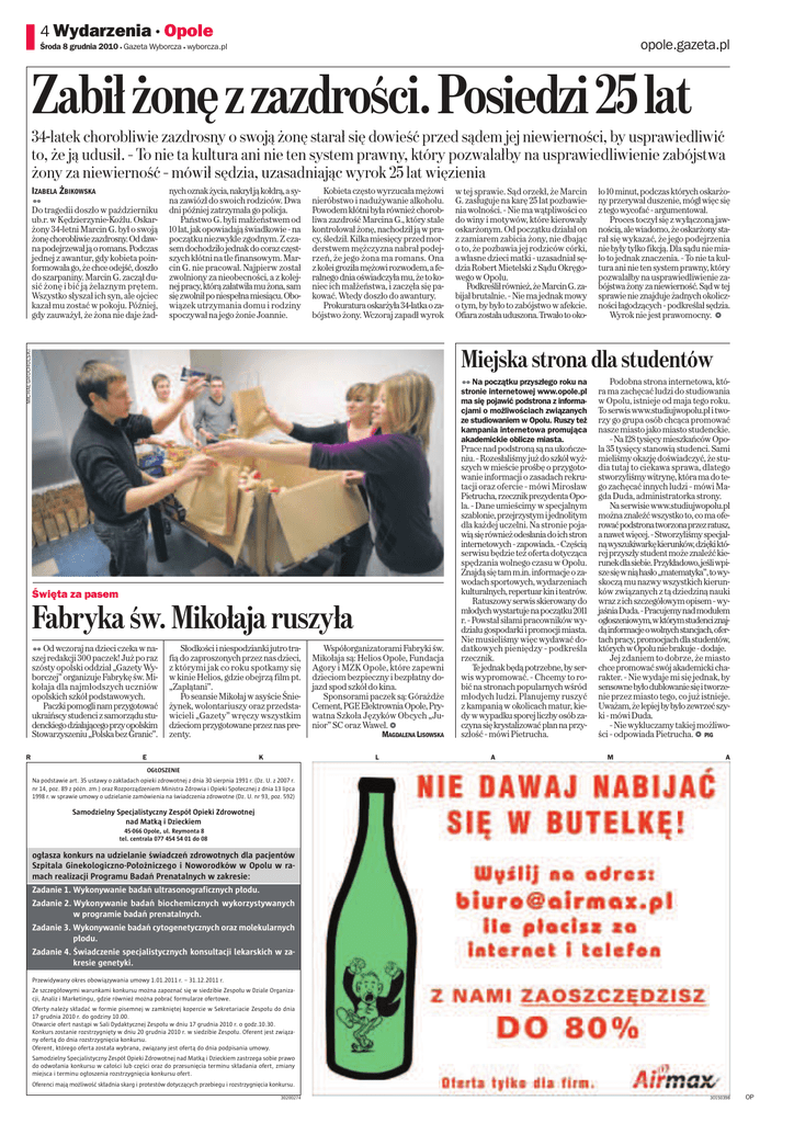 4 Wydarzenia Opole + opole.gazeta.pl Środa 8 grudnia 2010 Gazeta Wyborcza wyborcza.pl + + Zabił żonę z zazdrości. Posiedzi 25 lat 34-latek chorobliwie zazdrosny o swoją żonę starał się dowieść przed sądem jej niewierności, by usprawiedliwić to, że ją udusił. – To nie ta kultura ani nie ten system prawny, który pozwalałby na usprawiedliwienie zabójstwa żony za niewierność – mówił sędzia, uzasadniając wyrok 25 lat więzienia IZABELA ŻBIKOWSKA Do tragedii doszło w październiku ub.r. w Kędzierzynie-Koźlu. Oskarżony 34-letni Marcin G. był o swoją żonę chorobliwie zazdrosny. Od dawna podejrzewał ją o romans. Podczas jednej z awantur, gdy kobieta poinformowała go, że chce odejść, doszło do szarpaniny. Marcin G. zaczął dusić żonę i bić ją żelaznym prętem. Wszystko słyszał ich syn, ale ojciec kazał mu zostać w pokoju. Później, gdy zauważył, że żona nie daje żad- nych oznak życia, nakrył ją kołdrą, a syna zawiózł do swoich rodziców. Dwa dni później zatrzymała go policja. Państwo G. byli małżeństwem od 10 lat, jak opowiadają świadkowie – na początku niezwykle zgodnym. Z czasem dochodziło jednak do coraz częstszych kłótni na tle finansowym. Marcin G. nie pracował. Najpierw został zwolniony za nieobecności, a z kolejnej pracy, którą załatwiła mu żona, sam się zwolnił po niespełna miesiącu. Obowiązek utrzymania domu i rodziny spoczywał na jego żonie Joannie. Kobieta często wyrzucała mężowi nieróbstwo i nadużywanie alkoholu. Powodem kłótni była również chorobliwa zazdrość Marcina G., który stale kontrolował żonę, nachodził ją w pracy, śledził. Kilka miesięcy przed morderstwem mężczyzna nabrał podejrzeń, że jego żona ma romans. Ona z kolei groziła mężowi rozwodem, a feralnego dnia oświadczyła mu, że to koniec ich małżeństwa, i zaczęła się pakować. Wtedy doszło do awantury. Prokuratura oskarżyła 34-latka o zabójstwo żony. Wczoraj zapadł wyrok ło 10 minut, podczas których oskarżony przerywał duszenie, mógł więc się z tego wycofać – argumentował. Proces toczył się z wyłączoną jawnością, ale wiadomo, że oskarżony starał się wykazać, że jego podejrzenia nie były tylko fikcją. Dla sądu nie miało to jednak znaczenia. – To nie ta kultura ani nie ten system prawny, który pozwalałby na usprawiedliwienie zabójstwa żony za niewierność. Sąd w tej sprawie nie znajduje żadnych okoliczności łagodzących – podkreślał sędzia. Wyrok nie jest prawomocny. f MICHAŁ GROCHOLSKI Miejska strona dla studentów Na początku przyszłego roku na stronie internetowej www.opole.pl ma się pojawić podstrona z informacjami o możliwościach związanych ze studiowaniem w Opolu. Ruszy też kampania internetowa promująca akademickie oblicze miasta. Święta za pasem Fabryka św. Mikołaja ruszyła Od wczoraj na dzieci czeka w naszej redakcji 300 paczek! Już po raz szósty opolski oddział „Gazety Wyborczej” organizuje Fabrykę św. Mikołaja dla najmłodszych uczniów opolskich szkół podstawowych. Paczki pomogli nam przygotować ukraińscy studenci z samorządu studenckiego działającego przy opolskim Stowarzyszeniu „Polska bez Granic”. R w tej sprawie. Sąd orzekł, że Marcin G. zasługuje na karę 25 lat pozbawienia wolności. – Nie ma wątpliwości co do winy i motywów, które kierowały oskarżonym. Od początku działał on z zamiarem zabicia żony, nie dbając o to, że pozbawia jej rodziców córki, a własne dzieci matki – uzasadniał sędzia Robert Mietelski z Sądu Okręgowego w Opolu. Podkreślił również, że Marcin G. zabijał brutalnie. – Nie ma jednak mowy o tym, by było to zabójstwo w afekcie. Ofiara została uduszona. Trwało to oko- Słodkości i niespodzianki jutro trafią do zaproszonych przez nas dzieci, z którymi jak co roku spotkamy się w kinie Helios, gdzie obejrzą film pt. „Zaplątani”. Po seansie Mikołaj w asyście Śnieżynek, wolontariuszy oraz przedstawicieli „Gazety” wręczy wszystkim dzieciom przygotowane przez nas prezenty. E K Współorganizatorami Fabryki św. Mikołaja są: Helios Opole, Fundacja Agory i MZK Opole, które zapewni dzieciom bezpieczny i bezpłatny dojazd spod szkół do kina. Sponsorami paczek są: Górażdże Cement, PGE Elektrownia Opole, Prywatna Szkoła Języków Obcych „Junior” SC oraz Wawel. f MAGDALENA LISOWSKA L Prace nad podstroną są na ukończeniu. – Rozesłaliśmy już do szkół wyższych w mieście prośbę o przygotowanie informacji o zasadach rekrutacji oraz ofercie – mówi Mirosław Pietrucha, rzecznik prezydenta Opola. – Dane umieścimy w specjalnym szablonie, przejrzystym i jednolitym dla każdej uczelni. Na stronie pojawią się również odesłania do ich stron internetowych – zapowiada. – Częścią serwisu będzie też oferta dotycząca spędzania wolnego czasu w Opolu. Znajdą się tam m.in. informacje o zawodach sportowych, wydarzeniach kulturalnych, repertuar kin i teatrów. Ratuszowy serwis skierowany do młodych wystartuje na początku 2011 r. – Powstał siłami pracowników wydziału gospodarki i promocji miasta. Nie musieliśmy więc wydawać dodatkowych pieniędzy – podkreśla rzecznik. Te jednak będą potrzebne, by serwis wypromować. – Chcemy to robić na stronach popularnych wśród młodych ludzi. Planujemy ruszyć z kampanią w okolicach matur, kiedy w wypadku sporej liczby osób zaczyna się krystalizować plan na przyszłość – mówi Pietrucha. A Podobna strona internetowa, która ma zachęcać ludzi do studiowania w Opolu, istnieje od maja tego roku. To serwis www.studiujwopolu.pl i tworzy go grupa osób chcąca promować nasze miasto jako miasto studenckie. – Na 128 tysięcy mieszkańców Opola 35 tysięcy stanowią studenci. Sami mieliśmy okazję doświadczyć, że studia tutaj to ciekawa sprawa, dlatego stworzyliśmy witrynę, która ma do tego zachęcać innych ludzi – mówi Magda Du