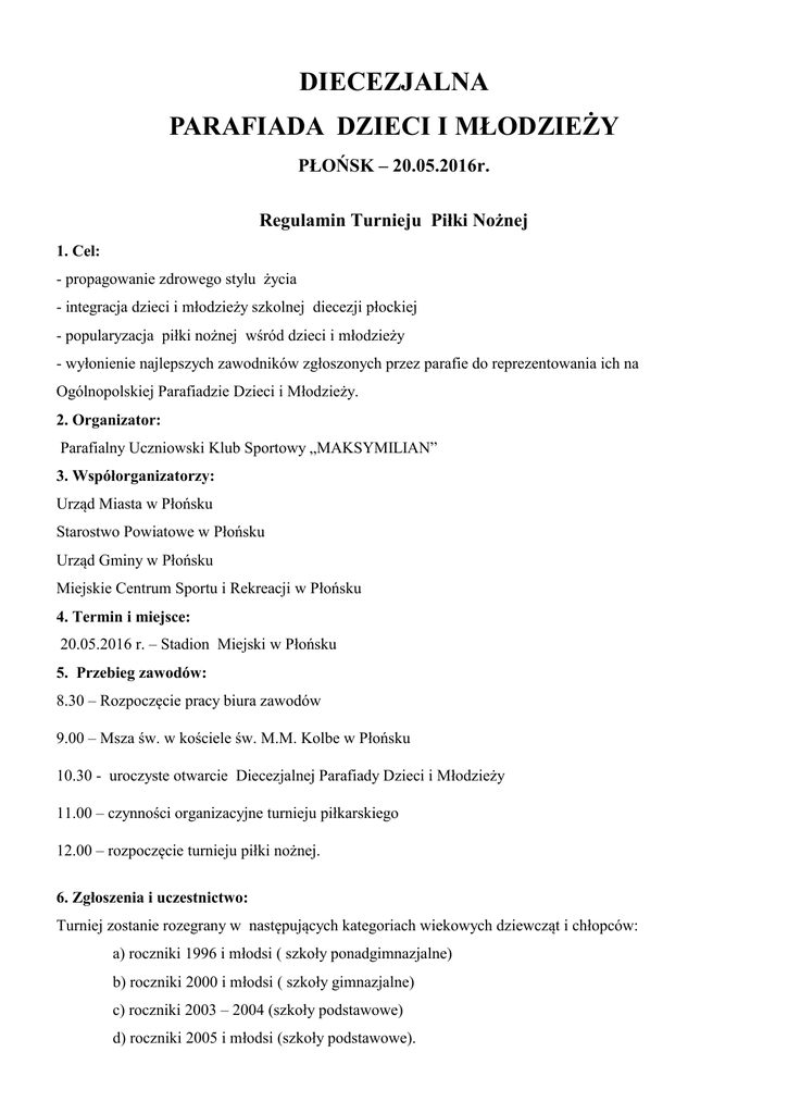 DIECEZJALNA PARAFIADA DZIECI I MŁODZIEŻY PŁOŃSK – 20.05.2016r. Regulamin Turnieju Piłki Nożnej 1. Cel: - propagowanie zdrowego stylu życia - integracja dzieci i młodzieży szkolnej diecezji płockiej - popularyzacja piłki nożnej wśród dzieci i młodzieży - wyłonienie najlepszych zawodników zgłoszonych przez parafie do reprezentowania ich na Ogólnopolskiej Parafiadzie Dzieci i Młodzieży. 2. Organizator: Parafialny Uczniowski Klub Sportowy „MAKSYMILIAN” 3. Współorganizatorzy: Urząd Miasta w Płońsku Starostwo Powiatowe w Płońsku Urząd Gminy w Płońsku Miejskie Centrum Sportu i Rekreacji w Płońsku 4. Termin i miejsce: 20.05.2016 r. – Stadion Miejski w Płońsku 5. Przebieg zawodów: 8.30 – Rozpoczęcie pracy biura zawodów 9.00 – Msza św. w kościele św. M.M. Kolbe w Płońsku 10.30 - uroczyste otwarcie Diecezjalnej Parafiady Dzieci i Młodzieży 11.00 – czynności organizacyjne turnieju piłkarskiego 12.00 – rozpoczęcie turnieju piłki nożnej. 6. Zgłoszenia i uczestnictwo: Turniej zostanie rozegrany w następujących kategoriach wiekowych dziewcząt i chłopców: a) roczniki 1996 i młodsi ( szkoły ponadgimnazjalne) b) roczniki 2000 i młodsi ( szkoły gimnazjalne) c) roczniki 2003 – 2004 (szkoły podstawowe) d) roczniki 2005 i młodsi (szkoły podstawowe). Zgłoszenia do zawodów: Zgłoszenia składamy w kancelarii Parafii św. Maksymiliana w Płońsku lub korespondencyjnie na adres: Parafialny Uczniowski Klub Sportowy ” Maksymilian”, ul. ks. R. Jaworskiego 1, 09-100 Płońsk lub na adres poczty elektronicznej: [email protected] w terminie do 17.05. 2016 r. Zgłoszenia drużyn w dniu zawodów potwierdzamy od 8.30 w biurze zawodów (przed Mszą Świętą) przy kościele parafialnym oraz do godziny 11.00 w biurze zawodów na stadionie miejskim. Zgłoszenie zawiera: - dyscyplinę sportową - nazwę zespołu oraz imienną listę zawodników z datami urodzenia - nazwę parafii lub szkoły ( innej instytucji) wysyłającej zawodników na parafiadę - pieczątkę i podpis osoby delegującej zawodników na zawody ( w przypadku zgłoszenia przez internet tylko imię i nazwisko zgłaszającego) - podpis opiekuna lub kierownika ekipy ( w przypadku zgłoszenia przez internet tylko imię i nazwisko opiekuna lub kierownika ekipy ). W przypadku przesłania zgłoszenia w formie elektronicznej internetem , w dniu zawodów należy złożyć w biurze zawodów kartę zgłoszeniową ekipy według powyżej zamieszczonego wzoru. 7. Zasady rozgrywania turnieju: System rozgrywek oraz czas trwania meczów uzależniony jest od liczby zgłoszonych drużyn i zostanie ogłoszony w dniu zawodów. Mecze rozgrywane w całości będą na Stadionie Miejskim w Płońsku lub w wypadku dużej liczby drużyn na innych obiektach sportowych miasta. 8. Regulamin turnieju - zespół składa się z 5 zawodników w polu plus bramkarz (do 12 zawodników cała drużyna), oddzielnie dziewczęta i chłopcy - regulamin zawodów dopuszcza, aby w skład drużyny chłopców mogły wejść dziewczęta. Jednakże podczas meczu na boisku może przebywać tylko jedna zawodniczka - bramkarz może wprowadzać piłkę w dowolny punkt boiska, zarówno ręką jak i nogą - gra bez „spalonego” - zmiany zawodników systemem hokejowym - punktacja : zwycięstwo 3 punkty, remis 1 punkt, porażka 0 punktów - kary za naruszenie przepisów gry: 1 – minutowa lub wykluczenie z danego meczu - zawodnicy winni posiadać jednolite stroje sportowe a bramkarz strój odmienny niż jego drużyna - zawodnicy grają w bezpiecznym obuwiu piłkarskim ( buty do gry na nawierzchniach sztucznych, zakaz gry w obuwiu typu „wkręty” ) - zawody rozgrywane będą na Stadionie Miejskim w Płońsku lub innych obiektach sportowych miasta - w turnieju może wziąć udział każdy reprezentant parafii o dobrym stanie zdrowia - niepełnoletni muszą posiadać zgodę rodziców lub opiekunów na udział w zawodach sportowych - uczestnicy, jak również osoby towarzyszące nie mogą znajdować się pod wpływem środków niedozwolonych (alkohol, dopalacze, narkotyki i inne używki). 9. Nagrody: Pierwsze trzy zespoły w poszczególnych kategoriach wiekowych otrzymują medale. Organizator przewiduje również upominki i nagrody rzeczowe. 10. Sędziowie Turniej sędziują sędziowie powołani przez organizatora. 11. Sprawy socjalne: Istnieje możliwość nieodpłatnego zakwaterowania ekipy. Chęć noclegu należy podać w zgłoszeniu. Organizator przewidział gorący posiłek. 12. Postanowienia końcowe organizatora: - zawodnicy powinni posiadać bezwzględnie przy sobie legitymację szkolną lub inny dokument tożsamości - ewentualne protesty może składać kierownik drużyny lub jej kapitan u organizatora w trakcie, lub bezpośrednio po zakończeniu meczu, którego protest dotyczy - udział w turnieju jest bezpłatny - organizatorzy zapewniają opiekę medyczną dla uczestników podczas trwania turnieju.