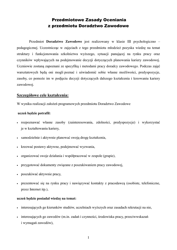 Przedmiotowe Zasady Oceniania z przedmiotu Doradztwo Zawodowe Przedmiot Doradztwo Zawodowe jest realizowany w klasie III psychologiczno – pedagogicznej. Uczestnicz c w zajęciach z tego przedmiotu młodzież pozyska wiedzę na temat struktury i funkcjonowania szkolnictwa wyższego, sytuacji panuj cej na rynku pracy oraz czynników wpływaj cych na podejmowanie decyzji dotycz cych planowania kariery zawodowej. Uczniowie zostan zapoznani ze specyfik i metodami pracy doradcy zawodowego. Podczas zajęć warsztatowych będ oni mogli poznać i uświadomić sobie własne możliwości, predyspozycje, zasoby, co pomoże im w podjęciu decyzji dotycz cych dalszego kształcenia i kreowaniu kariery zawodowej. Szczegółowe cele kształcenia: W wyniku realizacji założeń programowych przedmiotu Doradztwo Zawodowe uczeń będzie potrafił: rozpoznawać własne zasoby (zainteresowania, zdolności, predyspozycje) i wykorzystać je w kształtowaniu kariery, samodzielnie i aktywnie planować swoj drogę kształcenia, kreować postawy aktywne, podejmować wyzwania, organizować swoje działania i współpracować w zespole (grupie), przygotować dokumenty zwi zane z poszukiwaniem pracy zawodowej, poszukiwać aktywnie pracy, prezentować się na rynku pracy i nawi zywać kontakty z pracodawc (osobiste, telefoniczne, przez Internet itp.), uczeń będzie posiadał wiedzę na temat: interesuj cych go kierunków studiów, uczelniach wyższych oraz zasadach rekrutacji na nie, interesuj cych go zawodów (m.in. zadań i czynności, środowiska pracy, przeciwwskazań i wymagań zawodów), 1 systemu szkolnictwa policealnego, zasad obowi zuj cych w kompletowaniu dokumentacji zwi zanej z prac , podstaw prawa pracy, sposobów poszukiwania informacji o ofertach edukacyjnych i ofertach pracy, instytucji, specjalistów mog cych go wesprzeć w planowaniu kariery. uczeń będzie miał świadomość tego, że: musi być przygotowany na ci głe zmiany, zdobywanie nowych kwalifikacji i kompetencji, gwarancj sukcesu jest nieustanne planowanie przyszłości i konsekwentne d żenie do realizacji celu oraz postawa otwartości na wiedzę i prezentowanie swoich zasobów. Zasady oceniania osiągnięć uczniów Na pocz tku roku szkolnego nauczyciel zapoznaje uczniów z zakresem wymagań programowych oraz systemem oceniania obowi zuj cym na przedmiocie Doradztwo Zawodowe zgodnym z Wewn trzszkolnymi Zasadami Oceniania w I Liceum Ogólnokształc cym im. Bolesława Chrobrego w Gnieźnie. 1. Ocena osi gnięć uczniów będzie odbywać się w oparciu o: sprawdziany i kartkówki wcześniej zapowiedziane przez nauczyciela (1 sprawdzian, 1 kartkówka w semestrze) W zależności od zdobytych punktów uczniowie uzyskaj następuj ce oceny: celuj cy - (99%, 100%> bardzo dobry - (90% , 99%> dobry - (70% , 90%> dostateczny - (50% , 70%> dopuszczaj cy - <40% , 50%> niedostateczny - <0% , 40%) prace długoterminowe – referaty, eseje lub prezentacje multimedialne na interesuj ce uczniów tematy z zakresu doradztwa wykonane w ustalonym z nauczycielem terminie aktywność i zaangażowanie uczniów podczas zajęć – udział w dyskusji, efekty pracy wykonywanej w grupach, wytwory plastyczne powstałe podczas zajęć warsztatowych opracowanie i sposób przedstawienia wyników ankiet, obserwacji lub prac badawczych, 2 których tematyka i przebieg zostan wcześniej ustalone i zaakceptowane przez nauczyciela zaangażowanie uczniów w Tydzień Kariery frekwencję - uczeń posiadaj cy wzorow (100%) frekwencję na zajęciach otrzymuje cz stkow ocenę bardzo dobr 2. Podstaw do klasyfikacji śródrocznej i rocznej jest uzyskanie co najmniej 3 ocen cz stkowych z różnych rodzajów aktywności (sprawdzian, kartkówka, praca długoterminowa, aktywność na lekcji). 3. Ocena klasyfikacyjna (śródroczna, roczna) nie jest średni arytmetyczn ocen cz stkowych uzyskanych w ci gu semestru lub roku. Przy jej wystawieniu decyduj ce s oceny z sprawdzianów, prac długoterminowych, projektów badawczych. 4. Uczeń ma prawo do poprawy oceny z zapowiedzianych sprawdzianów w przeci gu dwóch tygodni od jej uzyskania. 5. Testy z zakresu doradztwa, psychozabawy, psychodramy nie podlegaj ocenie - efekty indywidualnych działań podczas warsztatów s osobist własności ucznia. 6. Uczeń jest zobowi zany do prowadzenia „dokumentacji zajęć”. Sugerowan form jest papierowa teczka zawieraj ca notatki oraz inne materiały wykorzystywane w czasie lekcji. 7. O braku postępu w zdobywaniu wiedzy i umiejętności (oceny niedostateczne, niepokoj ce nieobecności na zajęciach) nauczyciel zawiadamia wychowawcę i rodziców ucznia. Ogólne kryteria ocen OCENA CELUJ CA Ocenę tę , otrzymuje uczeń , którego wiedza wykracza poza obowi zuj cy program nauczania. Rozwija on twórczo własne uzdolnienia i zainteresowania poprzez pomysłowe i oryginalne wykonanie prac długoterminowych lub badawczych. Wykazuje szczególne zainteresowanie przedmiotem oraz literatur specjalistyczn , zgodn z omawian na zajęciach problematyk . Jest inicjatorem, organizatorem, uczestnikiem akcji służ cych propagowaniu tematyki z zakresu doradztwa zawodowego. OCENA BARDZO DOBRA Ocenę tę otrzymuje uczeń, który ma bogate wiadomości, w bardzo dobrym stopniu opanował zakres wymaganego materiału. Wykazuje zainteresowanie literatur specjalistyczn , korzysta z różnych źródeł w celu poszerzenia wiedzy zdobytej w szkole, czemu daje wyraz podejmuj c 3 aktywność na lekcjach oraz warsztatach. Umiejętnie stosuje posiadan wiedzę w praktyce, podczas warsztatów, prac długoterminowych i badawczych. OCENA DOBRA Ocenę tę otrzymuje uczeń, który wykazuje się podstawow wiedz z przedmiotu. Nabyte podczas zajęć umiejętności próbuje stosować w sytuacjach problemowych, zna omawian problematykę oraz w sposób logiczny j prezentuje. Rozumie także omawiane treści i potrafi wyjaśnić je innym, uogólnia i formułuje wnioski, potrafi logicznie bronić swojego zdania za pomoc argumentów. Aktywnie uczes
