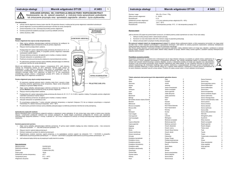 Instrukcja obsługi Miernik wilgotności DT129 # 3493 1 DOKŁADNIE ZAPOZNAJ SIĘ Z INSTRUKCJĄ OBSŁUGI PRZED ROZPOCZĘCIEM PRACY Niestosowanie się do zaleceń zawartych w instrukcji może spowodować uszkodzenie lub zniszczenie przyrządu oraz sprowadzić zagrożenie zdrowia i życia użytkownika. Charakterystyka: ● cyfrowy miernik wilgotności drewna (osiem skal dla 100 gatunków drewna), możliwy jest też pomiar wilgotności materiałów budowlanych ● pomiar wilgotności za pomocą elektrod pomiarowych miernika lub sondy zewnętrznej ● pomiar temperatury w celu automatycznej korekty pomiaru wilgotności ● kontrola poprawności działania przyrządu za pomocą nakładki ochronnej ● solidna obudowa z ABS Obsługa Pomiar wilgotności bez użycia sondy temperaturowej 1. 2. 3. 4. 5. 6. 7. Zdjąć czarną nakładkę zabezpieczająca elektrody pomiarowe lub podłączyć do gniazda Moisture złącze zewnętrznej sondy do pomiaru wilgotności. Włączyć miernik przełącznikiem zasilania. Przełącznikiem ► wybrać odpowiednią skalę pomiarową dla drewna (A, B, C, E, F, G, H LUB J) zgodnie z tabelą. W przypadku pomiaru wilgotności materiałów budowlanych wybrać skalę A. Wcisnąć elektrody pomiarowe, tak głęboko jak to możliwe, w badany materiał. Odczytać wskazanie na wyświetlaczu LCD. Powtórzyć procedurę pomiarową dla zwiększenia reprezentatywności pomiaru. Po zakończeniu pomiarów wcisnąć czarną nakładkę zabezpieczająca na elektrody pomiarowe miernika lub sondę zewnętrzną. Miernik jest skalibrowany dla pomiaru drewna o temperaturze 20°C. Jeśli mierzony materiał ma temperaturę wyższą niż 20°C wskazania miernika będą wyższe od prawidłowych, a jeśli niższą to wskazania będą niższe od prawidłowych. W celu oszacowania prawidłowego pomiaru drewna o temperaturze poniżej 20°C należy do wskazania przyrządu dodać 0,5% wilgotności na każde 5°C. W celu oszacowania prawidłowego pomiaru drewna o temperaturze powyżej 20°C należy od wskazania przyrządu odjąć 0,5% wilgotności na każde 5°C. Pomiar wilgotności przy użyciu sondy temperaturowej 1. W mierzonym materiale wykonać otwór o średnicy około 3mm i wsunąć w niego końcówkę ostrożnie szpikulcową sondy temperatury. Złącze sondy temperatury podłączyć do gniazda Temp miernika. 2. Zdjąć czarną nakładkę zabezpieczająca elektrody pomiarowe lub podłączyć do gniazda Moisture złącze zewnętrznej sondy do pomiaru wilgotności. 3. Włączyć miernik przełącznikiem zasilania. 4. Przełącznikiem ► wybrać odpowiednią skalę pomiarową dla drewna (A, B, C, E, F, G, H LUB J) zgodnie z tabelą. W przypadku pomiaru wilgotności materiałów budowlanych wybrać skalę A. 5. Wcisnąć elektrody pomiarowe, tak głęboko jak to możliwe, w badany materiał. 6. Odczytać wskazanie na wyświetlaczu LCD. 7. Po przyciśnięciu przełącznika T można odczytać wskazanie temperatury w stopniach Celsjusza (°C) lub po kolejnym przyciśnięciu w stopniach Fahrenheita (°F). Zakres mierzonych temperatur: -35°C ~ 80°C. 8. Po zakończeniu pomiarów wcisnąć czarną nakładkę zabezpieczająca na elektrody pomiarowe miernika lub sondę zewnętrzną. Automatyczny wyłącznik zasilania Miernik wyposażony jest w automatyczny wyłącznik zasilania o ustawianym czasie zadziałania. W celu zmiany tego czasu należy w trakcie pracy miernika włączyć i przytrzymać przełącznik zasilania oraz wcisnąć przełącznik ►. Każde kolejne przyciśniecie przełącznika ► zmienia czas zadziałania automatycznego wyłącznika zasilania o 1 minutę, w zakresie od 1 do 9 minut. Wskazanie 00 oznacza, że funkcja automatycznego wyłącznika zasilania jest nieaktywna. Kontrola poprawności pomiaru 1. Zdjąć czarną nakładkę zabezpieczająca elektrody pomiarowe. W górnej części nakładki znajdują się cztery metalowe punkty – dwa oznaczone oznaczone symbolem - T - oraz dwa oznaczone symbolem – B -. 2. 3. 4. 5. Włączyć miernik i wybrać skalę pomiarową A. Dotknąć metalowymi punktami do elektrod pomiarowych. Wygenerowany zostanie wzorcowy sygnał pomiarowy, a na wyświetlaczu powinno pojawić się wskazanie 17,7 ~ 18,3%H2O w przypadku kalibrowania za pomocą punktów pomiarowych – T – lub 25,5 ~ 26,5%H2O w przypadku kalibrowania za pomocą punktów pomiarowych – B –. Jeśli wskazania będą różniły się od powyższych wyślij miernik do serwisu. Dane techniczne Metoda pomiaru Elektrody pomiarowe Zasilanie rezystancyjna długość 8mm 2 baterie AAA (R3) Pobór prądu Dokładność pomiaru temperatury Temperatura pracy Wilgotność otoczenia <8mA ±2°C 0°C ~ +40°C < 85%RH Instrukcja obsługi Miernik wilgotności DT129 Wymiary / waga 180 x 50 x 31mm / 175g Zakres pomiaru wilgotności Rozdzielczość 6 ~ 99,9% 0,1% Dokładność pomiaru wilgotności Zakres pomiaru temperatury Rozdzielczość ± 1% (przy zakresie pomiaru wilgotności 6% - 40%) -35°C ~ 80°C 1 dla temperatury poniżej -10°C, 0,1 dla temperatury powyżej 10°C # 3493 2 Wymiana baterii Jeśli na ekranie LCD pojawi się symbol baterii oznacza to, że baterie powinny zostać wymienione na nowe. W tym celu należy: 1. Odkręcić śrubkę pokrywy baterii i zdemontować pokrywę. 2. Wymienić na nowe dwie baterie AAA (R3). Zwrócić uwagę na poprawną polaryzację. 3. Założyć pokrywę baterii i przykręcić śrubkę zabezpieczająca. Nie wyrzucać zużytych baterii do niesegregowanych śmieci! Po upływie okresu użytkowania baterie, w które wyposażony był produkt, nie mogą zostać usunięte wraz z innymi odpadami pochodzącymi z gospodarstw domowych. Jeśli baterie nie zostaną poprawnie zutylizowane, substancje niebezpieczne mogą powodować zagrożenie dla zdrowia ludzkiego lub środowiska naturalnego. Aby chronić zasoby naturalne i promować ponowne wykorzystanie materiałów, należy oddzielać baterie od innego typu odpadów i poddawać je utylizacji poprzez lokalny, bezpłatny system