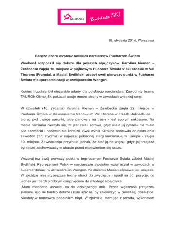 ! ! ! ! ! ! ! ! 18. stycznia 2014, Warszawa Bardzo dobre występy polskich narciarzy w Pucharach Świata Weekend rozpoczął się dobrze dla polskich alpejczyków. Karolina Riemen – Żerebecka zajęła 10. miejsce w piątkowym Pucharze Świata w ski crossie w Val Thorens (Francja), a Maciej Bydliński zdobył swój pierwszy punkt w Pucharze Świata w superkombinacji w szwajcarskim Wengen. ! Koniec tygodnia był niezwykle udany dla polskiego narciarstwa. Zawodnicy teamu TAURON OlimpijSki pokazali swoje mocne strony w zawodach wysokiej rangi. ! W czwartek (16. stycznia) Karolina Riemen – Żerebecka zajęła 22. miejsce w Pucharze Świata w ski crossie we francuskim Val Thorens w Trzech Dolinach, co biorąc pod uwagę warunki, jakie panowały na trasie - jest sporym sukcesem. Na mecie narciarka cieszyła się, że jest cała i zdrowa, gdyż wiele jej rywalek nie miało tyle szczęścia i nabawiło się kontuzji. Swój wynik Karolina poprawiła drugiego dnia zawodów (17. stycznia) w najwyżej położonej stacji narciarskiej w Europie - zajęła 10. miejsce. Zawodniczka przyznała jednak, że stać ją na więcej, gdyż jej przejazd był raczej zachowawczy w obawie przed nabawieniem się urazu. ! Wczoraj też swój pierwszy punkt w tegorocznym Pucharze Świata zdobył Maciej Bydliński. Reprezentant Polski w narciarstwie alpejskim wziął udział w zawodach w superkombinacji w szwajcarskim Wengen. Po slalomie Maciek zajmował 25. miejsce. W zjeździe niestety jeszcze trochę stracił do zwycięzcy i spadł na 30. pozycję, co jednak jest bardzo dobrym osiągnięciem dla młodego alpejczyka. „Mam mieszane uczucia, co do dzisiejszego dnia. Przez większość przejazdu slalomu szło mi bardzo dobrze i była szansa, by zakończyć w pierwszej dziesiątce. Niestety w końcówce popełniłem błąd. W zjeździe, startując z przodu, wykonałem najgorszy przejazd z wszystkich dotychczasowych jazd w Wengen. Skończyło się dobrze, bo jest punkt, ale zadowolenie - umiarkowane“. ! W najbliższych dniach Karolina będzie trenować przed kolejnym Pucharem Świata, który już za tydzień (23. - 24. stycznia) odbędzie się w Kreichsberg w Austrii. Maćka natomiast czeka jeszcze start w slalomie w Wengen (19. stycznia), a następnie przenosi się on do słynnego Kitzbuchel, gdzie w przyszły weekend powalczy o kolejne punkty Pucharu Świata. ! Mamy nadzieję, że takie pozytywne wieści narciarskie będą do nas napływać coraz częściej i trzymamy kciuki za następne starty Polaków. ! ! Andrzej Lesiewski [email protected] +48 512 348 232 !! ! TAURON Polska Energia SA jest spółką holdingową w grupie kapitałowej, która zajmuje się wydobyciem węgla, wytwarzaniem, dystrybucją i sprzedażą energii. Grupa TAURON wraz z GZE obejmuje swoim działaniem 18 proc. powierzchni kraju i jest jednym z największych podmiotów gospodarczych w Polsce, posiadającym 5,2 mln klientów. W skład Grupy TAURON wchodzą m.in. TAURON Wytwarzanie, TAURON Dystrybucja, TAURON Sprzedaż, TAURON Obsługa Klienta, Południowy Koncern Węglowy, TAURON Ciepło, TAURON Ekoenergia oraz spółki należące do GZE. ! Andrzej Bachleda-Curuś II – (ur. 2 stycznia 1947 roku w Zakopanem) to najbardziej utytułowany polski narciarz alpejski. Dwukrotnie reprezentował Polskę na Igrzyskach Olimpijskich – w 1968 roku w Grenoble, gdzie zdobył 6. lokatę w slalomie specjalnym oraz w Sapporo w roku 1972, plasując się na 9. pozycji w slalomie gigancie. W jego kolekcji znajdują się też medale Narciarskich Mistrzostw Świata - brąz za kombinację alpejską w Val Gardena w 1970 roku oraz srebro zdobyte w 1974 w St. Moritz w tej samej konkurencji. Wybitnym wynikiem było też 2. miejsce w slalomowej klasyfikacji Pucharu Świata i 6. miejsce w klasyfikacji generalnej w sezonie 1971/1972. Andrzej Bachleda-Curuś wielokrotnie tryumfował też na Zimowych Uniwersjadach i Spartakiadach Armii Zaprzyjaźnionych. Na najwyższym podium Mistrzostw Polski stawał aż 14 razy. W trakcie swojej kariery ścigał się z największymi legendami narciarstwa alpejskiego, takimi jak Jean Claude Killy czy Gustavo Thöni. Jest pierwszym Polakiem uhonorowanym prestiżową nagrodą „Fair Play” przyznawaną przez UNESCO. W 2009 roku otrzymał Krzyż Kawalerski Orderu Odrodzenia Polski.