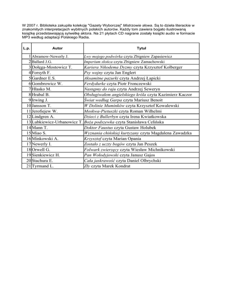 W 2007 r. Biblioteka zakupiła kolekcję "Gazety Wyborczej" Mistrzowie słowa. Są to dzieła literackie w znakomitych interpretacjach wybitnych polskich autorów. Każdy tom zawiera bogato ilustrowaną książkę przedstawiającą sylwetkę aktora. Na 21 płytach CD nagrane zostały książki audio w formacie MP3 według adaptacji Polskiego Radia. L.p. Autor Tytuł 1 Abramow-Newerly J. Lwy mojego podwórka czyta Zbigniew Zapasiewicz 2 Ballard J.G. Imperium słońca czyta Zbigniew Zamachowski 3 Dołęga-Mostowicz T. Kariera Nikodema Dyzmy czyta Krzysztof Kolberger 4 Forsyth F. Psy wojny czyta Jan Englert 5 Gardner E.S. Aksamitne pazurki czyta Andrzej Łapicki 6 Gombrowicz W. Ferdydurke czyta Piotr Fronczewski 7 Hłasko M. Następny do raju czyta Andrzej Seweryn 8 Hrabal B. Obsługiwałem angielskiego króla czyta Kazimierz Kaczor 9 Irwing J. Świat według Garpa czyta Mariusz Benoit 10 Jansson T. W Dolinie Muminków czyta Krzysztof Kowalewski 11 Jerofiejew W. Moskwa-Pietuszki czyta Roman Wilhelmi 12 Lindgren A. Dzieci z Bullerbyn czyta Irena Kwiatkowska 13 Lubkiewicz-Urbanowicz T. Boża podszewka czyta Stanisława Celińska 14 Mann T. Doktor Faustus czyta Gustaw Holubek 15 Miao S. Wyznania chińskiej kurtyzany czyta Magdalena Zawadzka 16 Minkowski A. Krzysztof czyta Marian Opania 17 Newerly I. Zostało z uczty bogów czyta Jan Peszek 18 Orwell G. Folwark zwierzęcy czyta Wiesław Michnikowski 19 Sienkiewicz H. Pan Wołodyjowski czyta Janusz Gajos 20 Stachura E. Cała jaskrawość czyta Daniel Olbrychski 21 Tyrmand L. Zły czyta Marek Kondrat