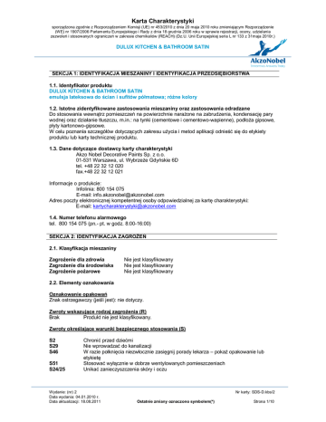 Karta Charakterystyki sporządzona zgodnie z Rozporządzeniem Komisji (UE) nr 453/2010 z dnia 20 maja 2010 roku zmieniającym Rozporządzenie (WE) nr 1907/2006 Parlam entu Europejskiego i Rady z dnia 18 grudnia 2006 roku w sprawie rejestracji, oceny, udzielania zezwoleń i stosowanych ograniczeń w zakresie chemikaliów (REACH) (Dz.U. Unii Europejskiej seria L nr 133 z 31maja 2010r.) DULUX KITCHEN & BATHROOM SATIN SEKCJA 1: IDENTYFIKACJA MIESZANINY I IDENTYFIKACJA PRZEDSIĘBIORSTWA 1.1. Identyfikator produktu DULUX KITCHEN & BATHROOM SATIN emulsja lateksowa do ścian i sufitów półmatowa; różne kolory 1.2. Istotne zidentyfikowane zastosowania mieszaniny oraz zastosowania odradzane Do stosowania wewnątrz pomieszczeń na powierzchnie narażone na zabrudzenia, kondensację pary wodnej oraz działanie tłuszczu, m.in.: na tynki (cementowe i cementowo-wapienne), podłoża gipsowe, płyty kartonowo-gipsowe. W celu poznania szczegółów dotyczących zakresu użycia i metod aplikacji odnieść się do etykiety produktu lub karty technicznej produktu. 1.3. Dane dotyczące dostawcy karty charakterystyki Akzo Nobel Decorative Paints Sp. z o.o. 01-531 Warszawa, ul. Wybrzeże Gdyńskie 6D tel. +48 22 32 12 020 fax.+48 22 32 12 021 Informacje o produkcie: Infolinia: 800 154 075 E-mail: [email protected] Adres poczty elektronicznej kompetentnej osoby odpowiedzialnej za kartę charakterystyki: E-mail: [email protected] 1.4. Numer telefonu alarmowego tel. 800 154 075 (pn.- pt. w godz. 8:00-16:00) SEKCJA 2: IDENTYFIKACJA ZAGROŻEŃ 2.1. Klasyfikacja mieszaniny Zagrożenie dla zdrowia Zagrożenie dla środowiska Zagrożenie pożarowe Nie jest klasyfikowany Nie jest klasyfikowany Nie jest klasyfikowany 2.2. Elementy oznakowania Oznakowanie opakowań Znak ostrzegawczy (jeśli jest): nie dotyczy. Zwroty wskazujące rodzaj zagrożenia (R) Brak Produkt nie jest klasyfikowany. Zwroty określające warunki bezpiecznego stosowania (S) S2 S29 S46 S51 S24/25 Chronić przed dziećmi Nie wprowadzać do kanalizacji W razie połknięcia niezwłocznie zasięgnij porady lekarza – pokaż opakowanie lub etykietę Stosować wyłącznie w dobrze wentylowanych pomieszczeniach Unikać zanieczyszczenia skóry i oczu Wydanie: (nr) 2 Data wydania: 04.01.2010 r. Data aktualizacji: 18.08.2011 Nr karty: SDS-D.kbs/2 Ostatnie zmiany oznaczono symbolem(*) Strona 1/10 Karta Charakterystyki sporządzona zgodnie z Rozporządzeniem Komisji (UE) nr 453/2010 z dnia 20 maja 2010 roku zmieniającym Rozporządzenie (WE) nr 1907/2006 Parlam entu Europejskiego i Rady z dnia 18 grudnia 2006 roku w sprawie rejestracji, oceny, udzielania zezwoleń i stosowanych ograniczeń w zakresie chemikaliów (REACH) (Dz.U. Unii Europejskiej seria L nr 133 z 31maja 2010r.) DULUX KITCHEN & BATHROOM SATIN Zawartość lotnych związków organicznych Limit zawartości LZO (kat. A/a): 30 g/l (2010). Produkt zawiera max. 29 g/l 2.3. Inne zagrożenia W oparciu o dostępne dane nie stwierdzono innych zagrożeń. SEKCJA 3: SKŁAD/INFORMACJA O SKŁADNIKACH Mieszaniny % wag. Nazwa substancji Brak Nr CAS Nr WE Nr indeksowy Nr rejestracji** - - Klasyfikacja substancji (dyrektywa 67/548/EWG) Klasyfikacja substancji (rozporządzenie WE nr 1272/2008) Symbole ostrzegawcze Zwroty zagrożenia (R) Klasa zagrożenia i kod kategorii - - - Kody zwrotów wskazujących rodzaj zagrożenia (H) - Nr rejestracji **- zostanie podany po dokonaniu rejestracji w ECHA Znaczenie zwrotów R wyszczególnionych w tabeli - patrz p. 16 Znaczenie zwrotów H wyszczególnionych w tabeli - patrz p. 16 SEKCJA 4: ŚRODKI PIERWSZEJ POMOCY 4.1. Opis środków pierwszej pomocy W przypadku podrażnienia dróg oddechowych W przypadku połknięcia W przypadku podrażnienia oczu W przypadku kontaktu ze skórą Wskazówki ogólne Wydanie: (nr) 2 Data wydania: 04.01.2010 r. Data aktualizacji: 18.08.2011 Osobę poszkodowaną umieścić w miejscu z dostępem świeżego powietrza. Utrzymywać ją w cieple i zapewnić spokój. Jeśli poszkodowany jest nieprzytomny, umieścić go w pozycji bezpiecznej. Nie podawać niczego doustnie. Skonsultować się z lekarzem. W przypadku połknięcia NIE WYWOŁYWAĆ WYMIOTÓW. Zapewnić poszkodowanemu spokój i w razie konieczności zasięgnąć porady medycznej. Obficie przepłukać oczy czystą wodą lub roztworem do płukania oczu trzymając powieki rozwarte aż do momentu, gdy podrażnienie ustąpi i pozostałości zanieczyszczenia zostaną usunięte. Osoby noszące szkła kontaktowe powinny jak najszybciej wyjąć je z oczu. W przypadku, gdy objawy podrażnienia nie ustąpią należy zwrócić się o pomoc do lekarza okulisty. Usunąć zanieczyszczoną odzież, przemyć dokładnie zabrudzone miejsce na skórze wodą i mydłem. Nie używać rozpuszczalników, ani rozcieńczalników. Jeśli objawy podrażnienia nie ustąpią należy skonsultować się z lekarzem. We wszystkich przypadkach pojawienia się niepokojących objawów lub wszelkich wątpliwości dotyczących zdrowia należy skonsultować się z lekarzem i pokazać niniejszą kartę charakterystyki, opakowanie lub etykietę produktu. Nr karty: SDS-D.kbs/2 Ostatnie zmiany oznaczono symbolem(*) Strona 2/10 Karta Charakterystyki sporządzona zgodnie z Rozporządzeniem Komisji (UE) nr 453/2010 z dnia 20 maja 2010 roku zmieniającym Rozporządzenie (WE) nr 1907/2006 Parlam entu Europejskiego i Rady z dnia 18 grudnia 2006 roku w sprawie rejestracji, oceny, udzielania zezwoleń i stosowanych ograniczeń w zakresie chemikaliów (REACH) (Dz.U. Unii Europejskiej seria L nr 133 z 31maja 2010r.) DULUX KITCHEN & BATHROOM SATIN 4.2. Najważniejsze ostre i opóźnione objawy oraz skutki narażenia Powtarzający się lub długotrwały bezpośredni kontakt ze skórą może powodować przejściowe podrażnienie.Przy zachlapaniu oczu może wystąpić podrażnienie. Połknięcie większej ilości produktu może spowodować zaburzenia żołądkowo-jelitowe łącznie z wymiotami i bólem brzucha. 4.3. Wskazania dotyczące wszelkiej naty