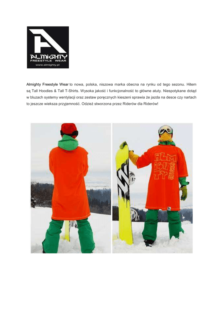 Almighty Freestyle Wear to nowa, polska, niszowa marka obecna na rynku od tego sezonu. Hitem są Tall Hoodies & Tall T-Shirts. Wysoka jakość i funkcjonalność to główne atuty. Niespotykane dotąd w bluzach systemy wentylacji oraz zestaw poręcznych kieszeni sprawia że jazda na desce czy nartach to jeszcze wieksza przyjemność. Odzież stworzona przez Riderów dla Riderów!